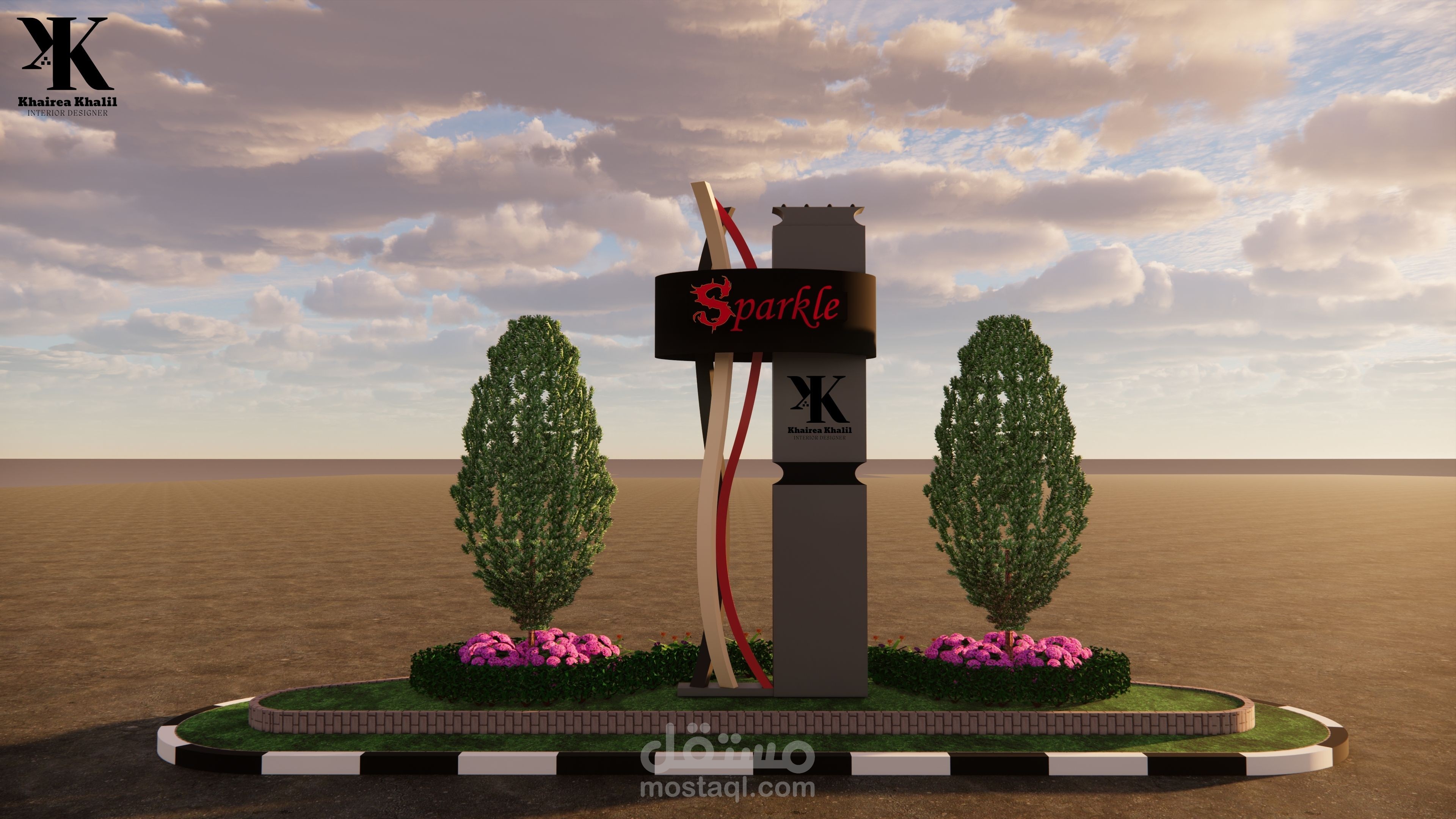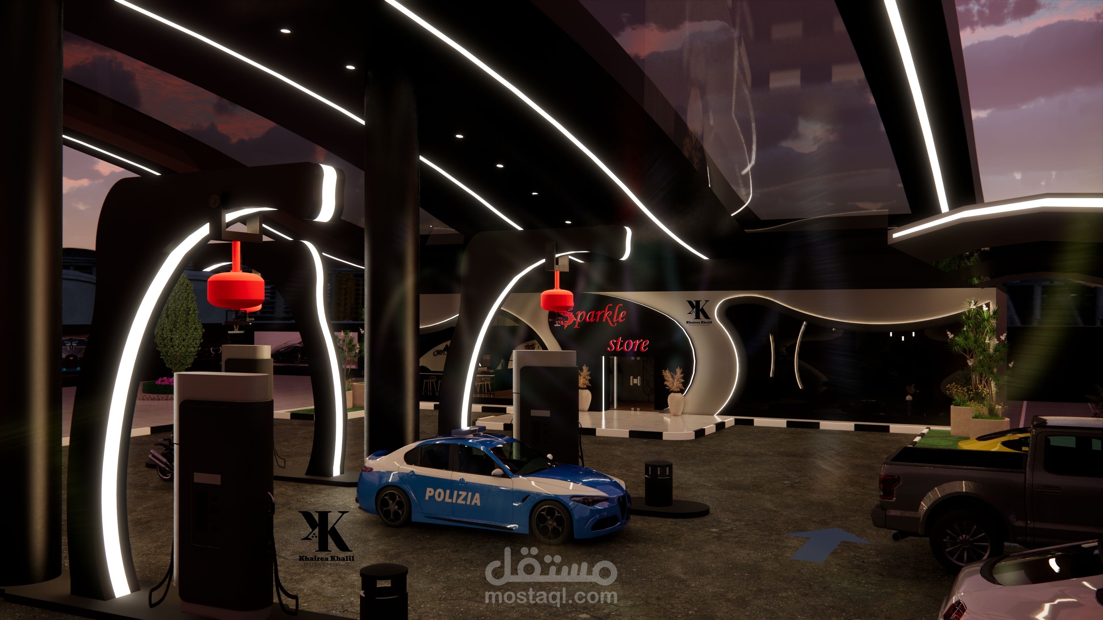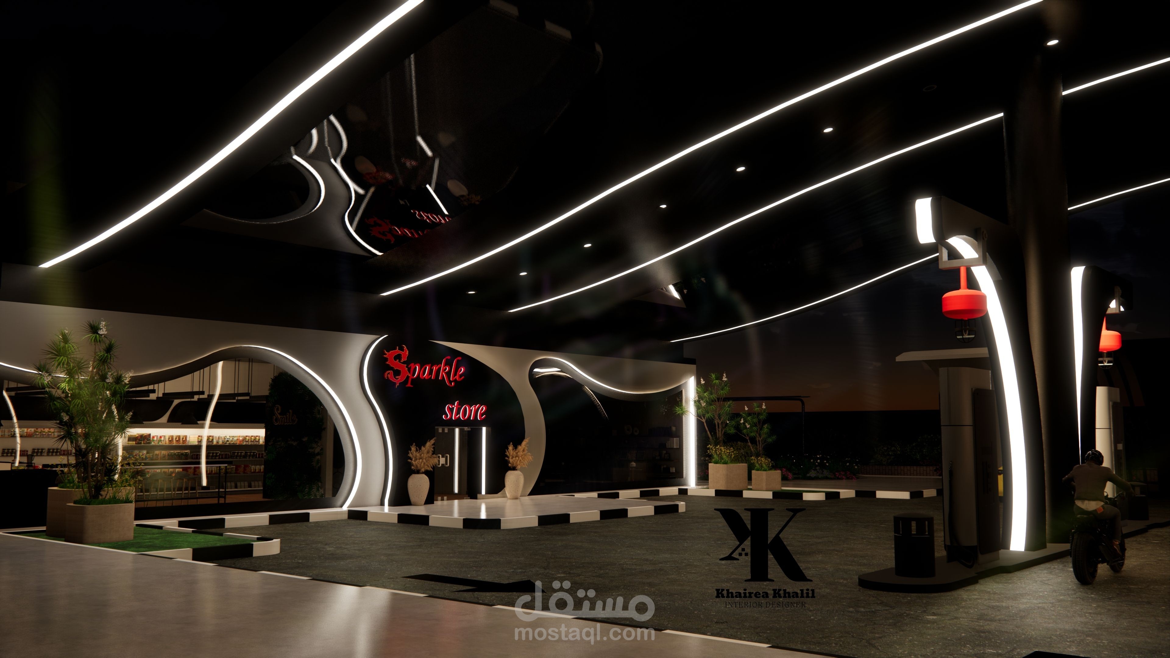 تصميمي لمحطة بنزين باستخدام اللون الأسود والرمادي ومراعاة كل الأسس اللازمة لتصميم المحطة