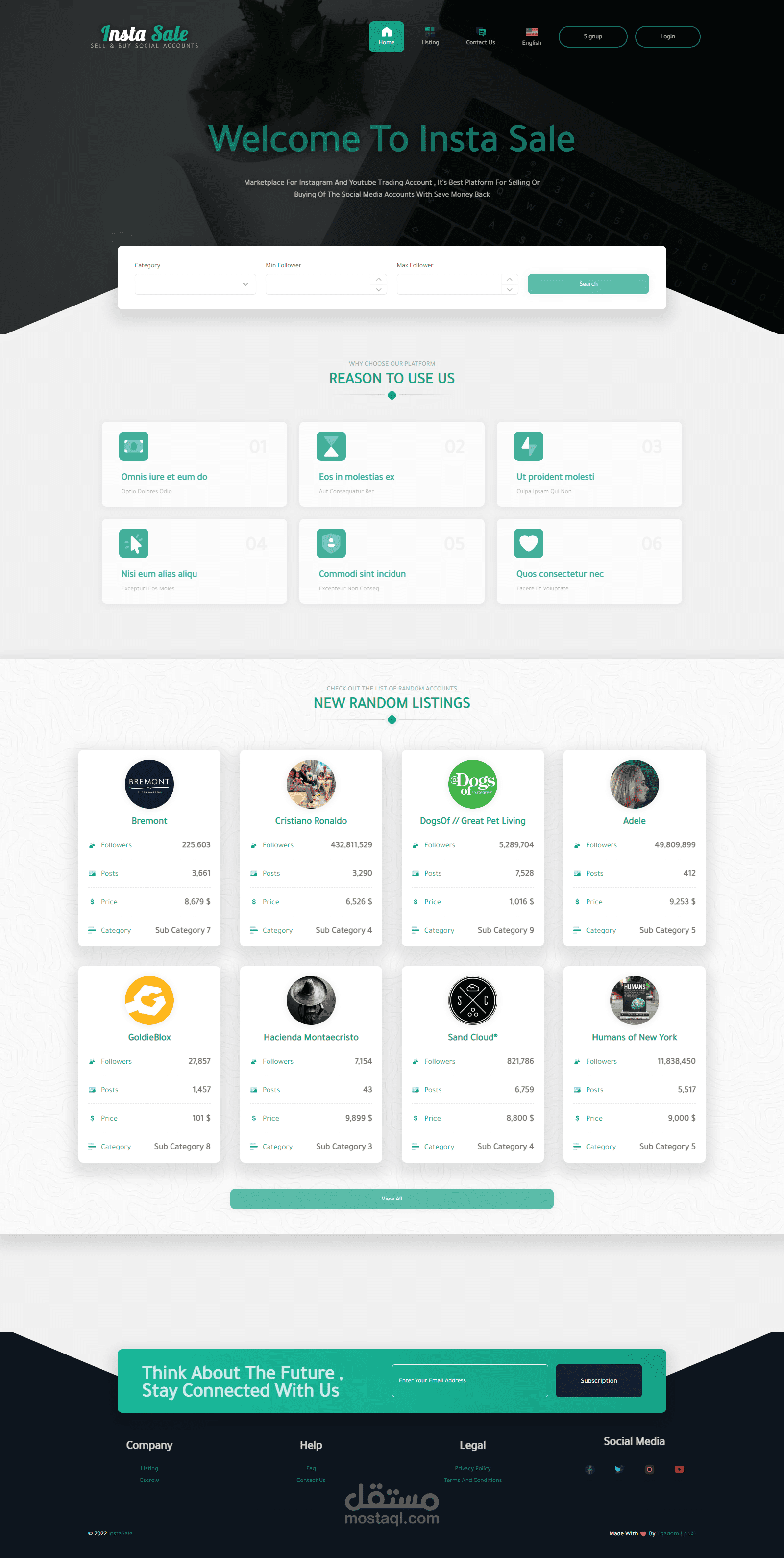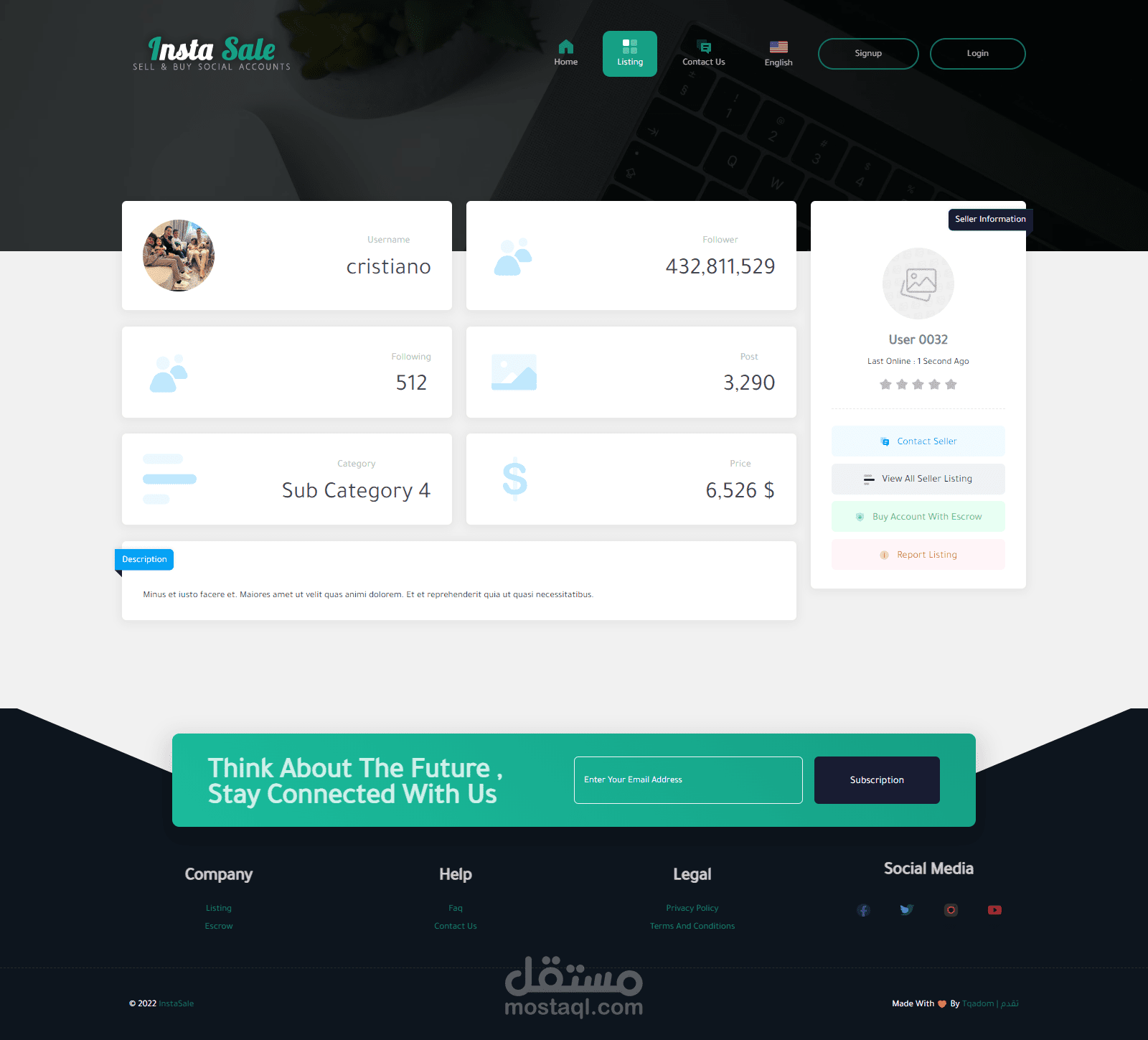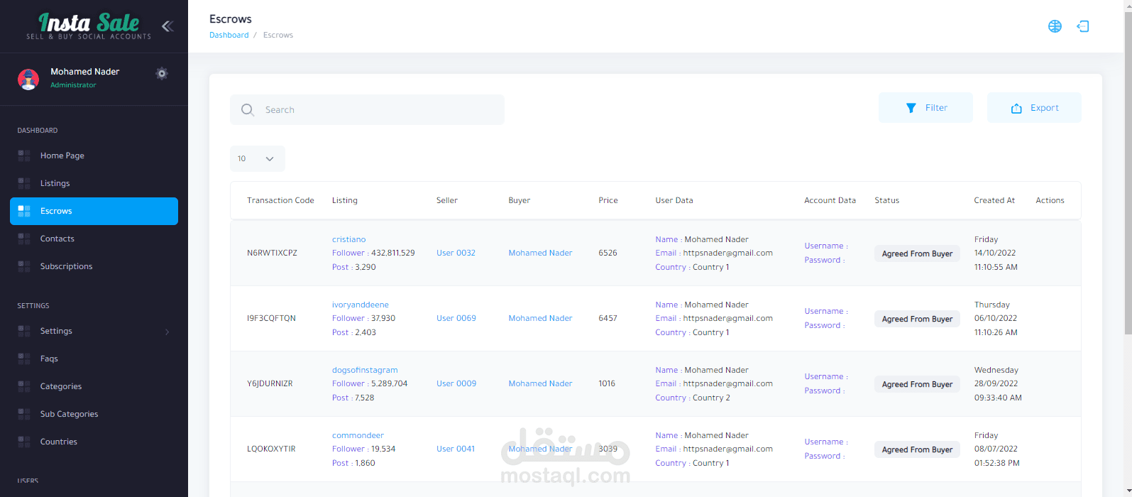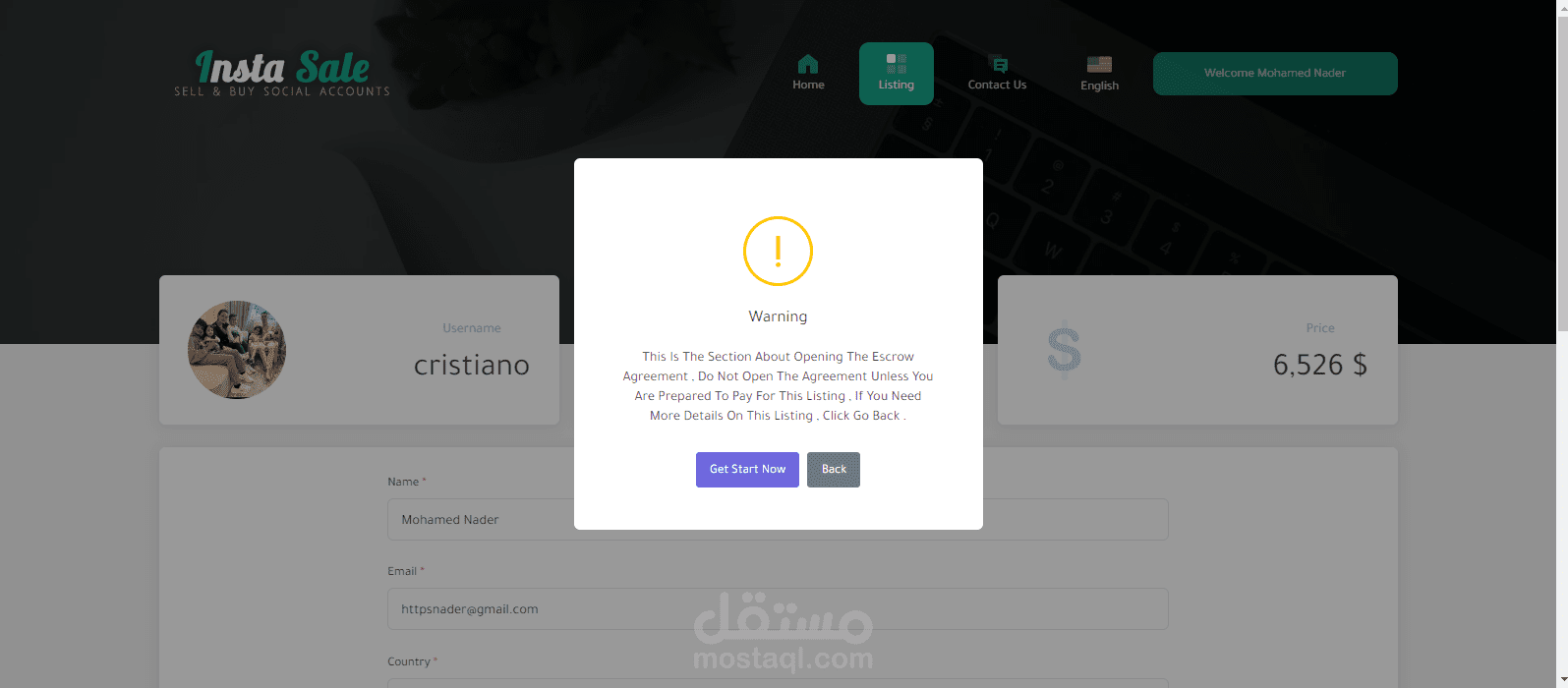 موقع للتجاره الإلكترونيه لبيع وشراء حسابات الـ سوشيال ميديا ومن اهمها حسابات الإنستغرام حيث يقوم المستخدم بإنشاء قائمة بيع جديده بحسابه الشخصي ويقوم الموقع بعرضها وعند توفر الشراء يقوم الموقع بتأمين ذالك ثم يقوم الموقع بإتخاذ نسبه من المدفوعات .