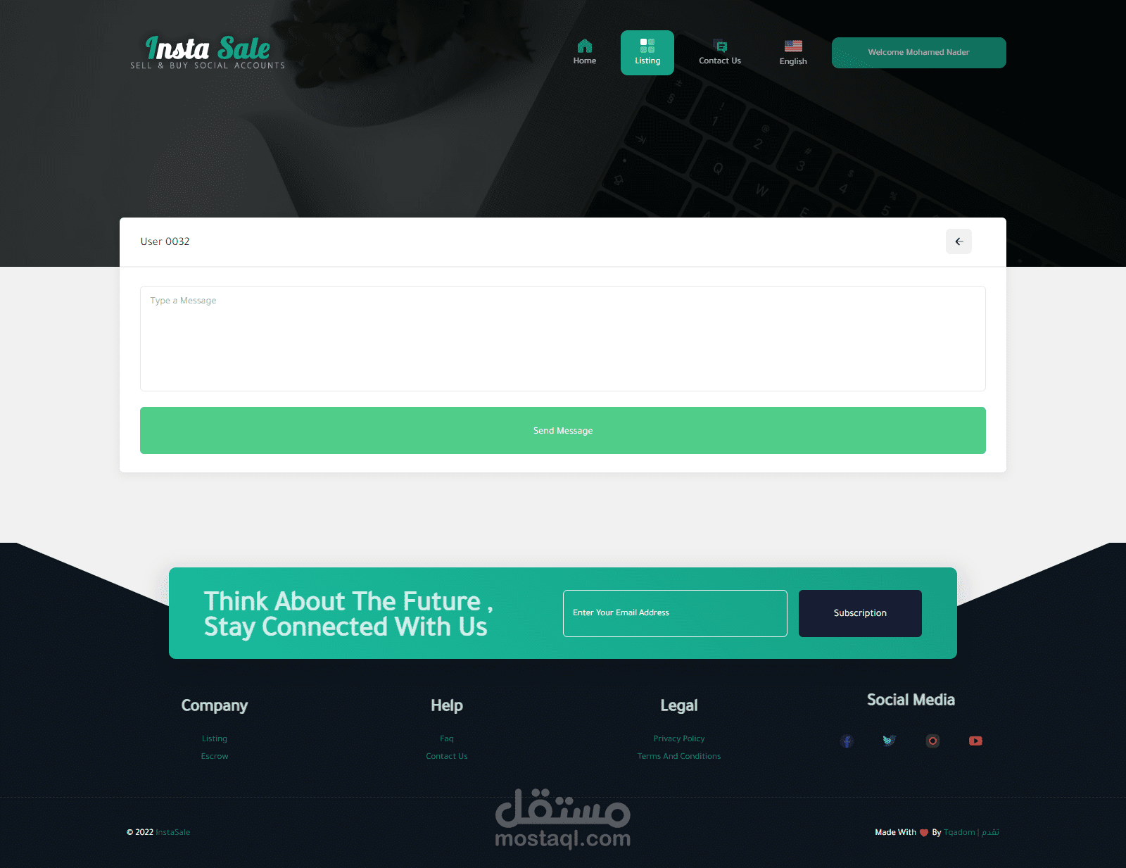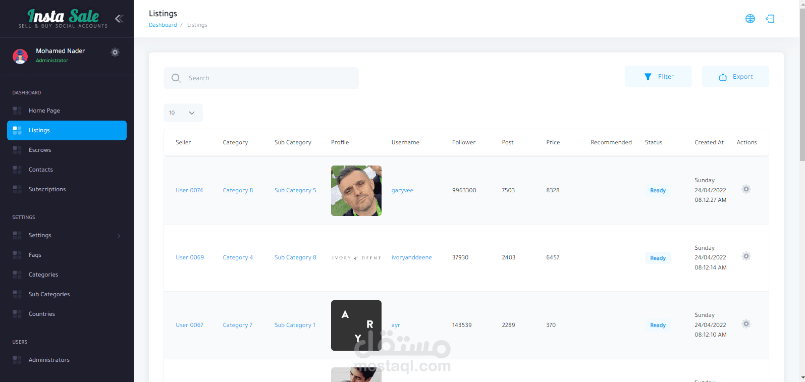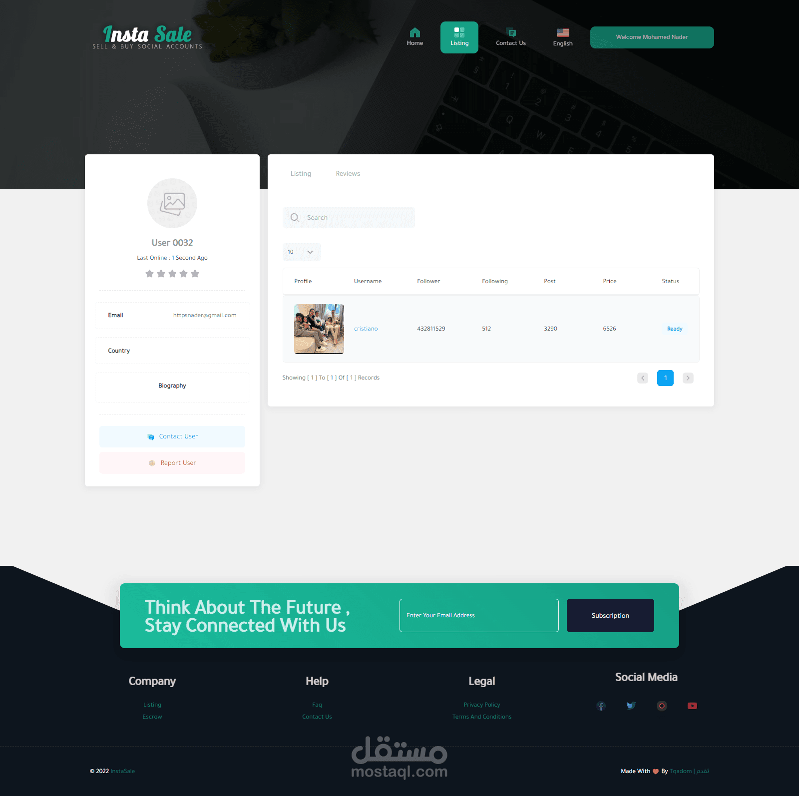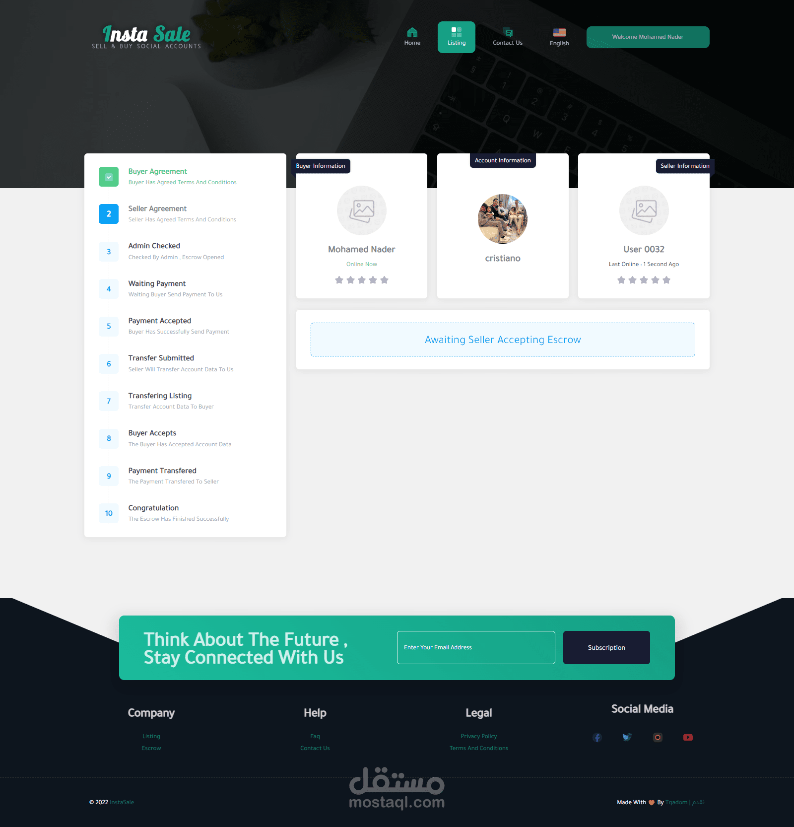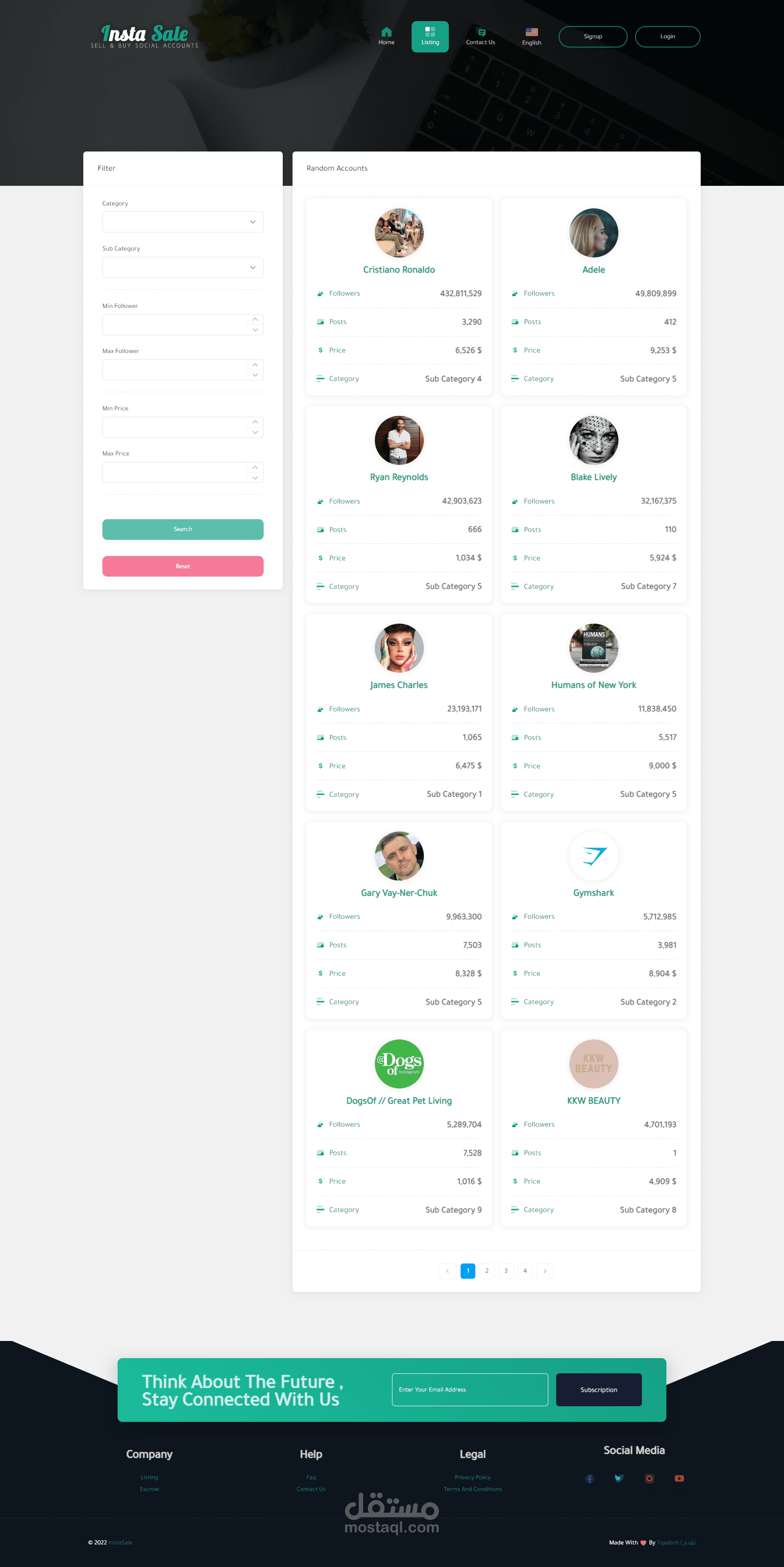 موقع للتجاره الإلكترونيه لبيع وشراء حسابات الـ سوشيال ميديا ومن اهمها حسابات الإنستغرام حيث يقوم المستخدم بإنشاء قائمة بيع جديده بحسابه الشخصي ويقوم الموقع بعرضها وعند توفر الشراء يقوم الموقع بتأمين ذالك ثم يقوم الموقع بإتخاذ نسبه من المدفوعات .