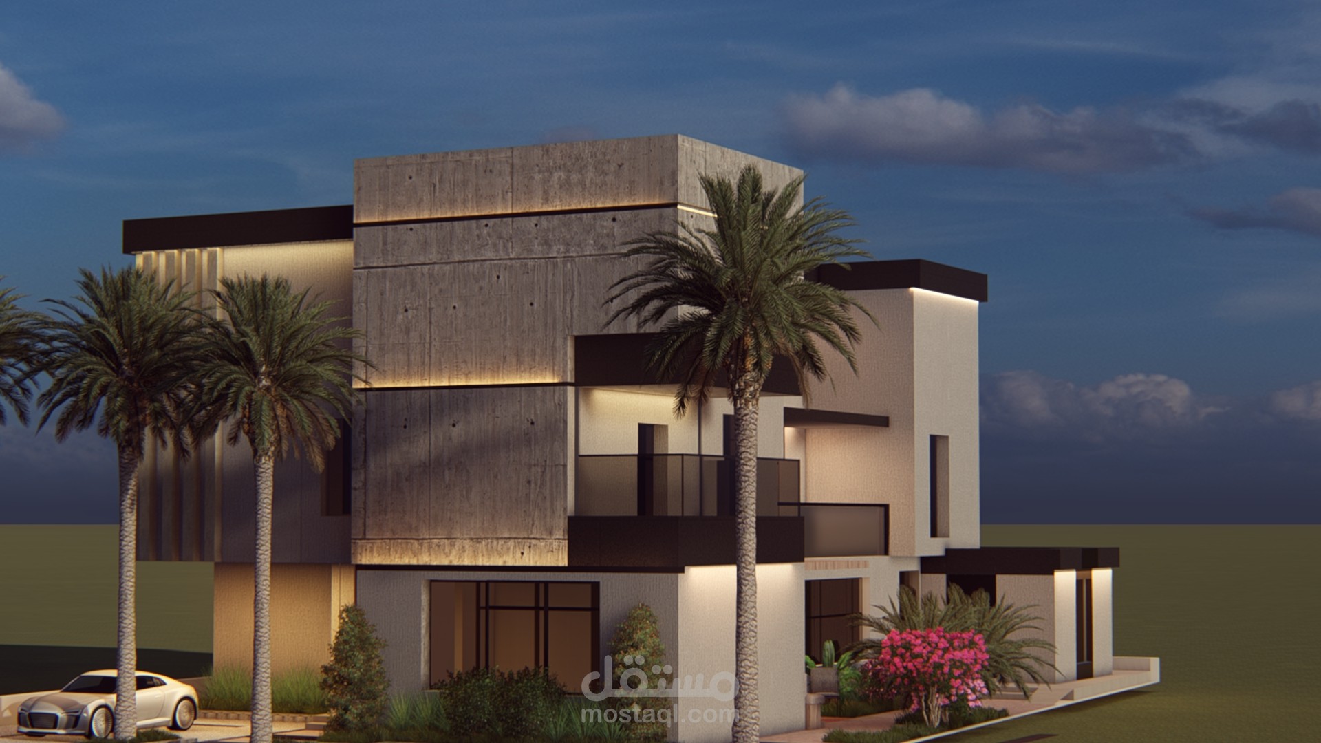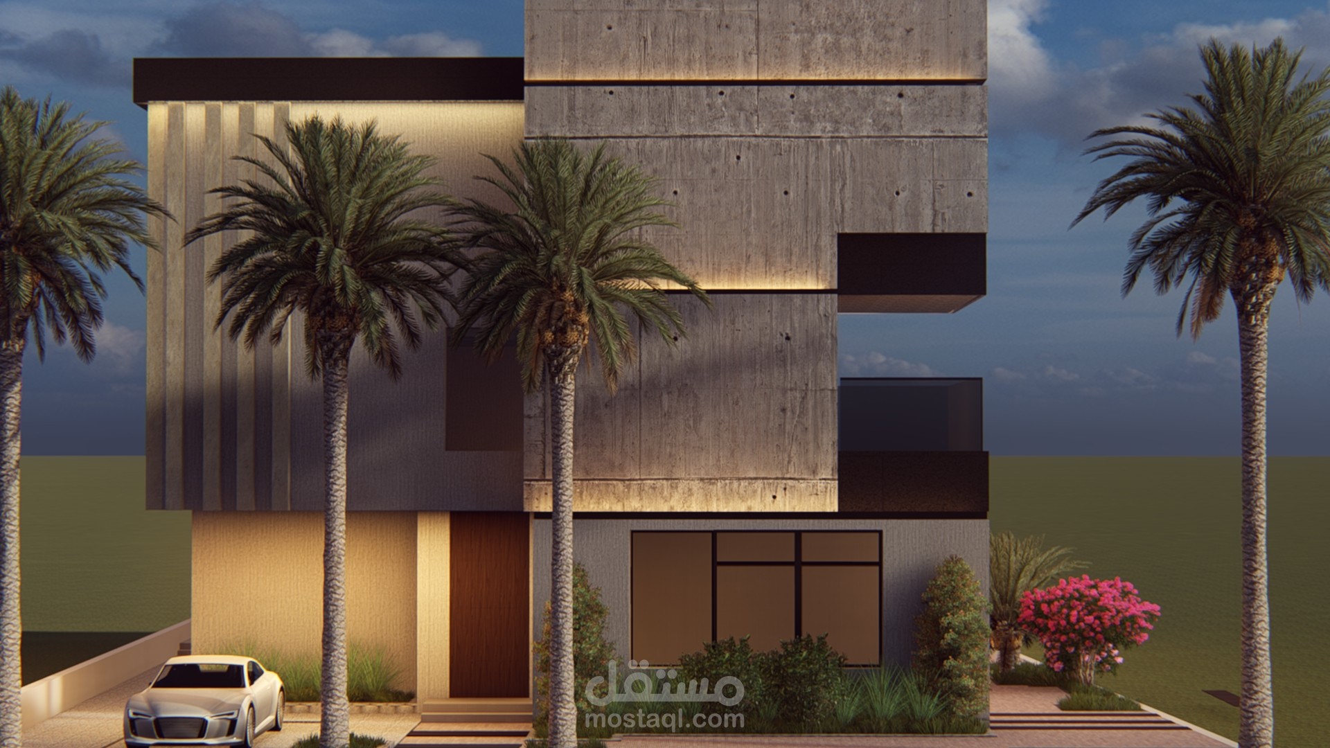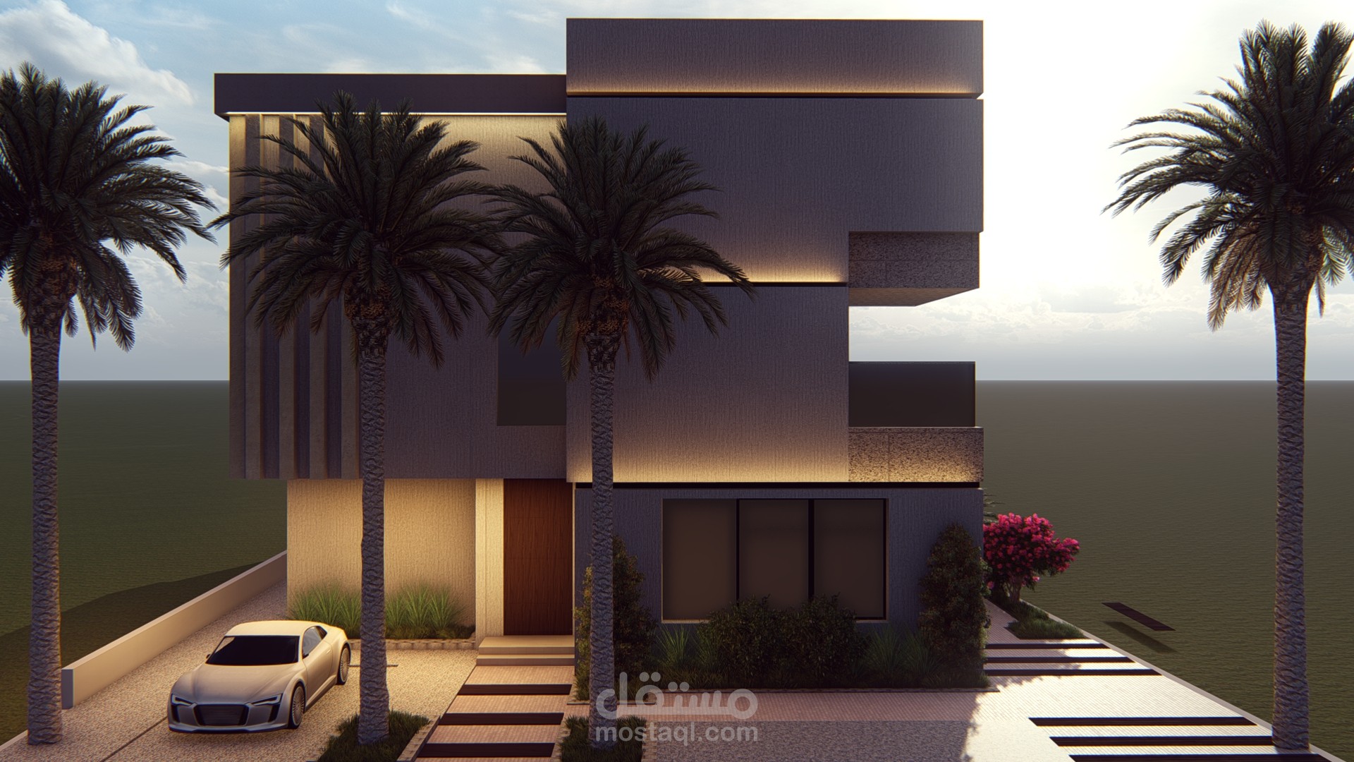 واجهة لفيلا مكونة من دورين مع الموقع العام للمبنى
