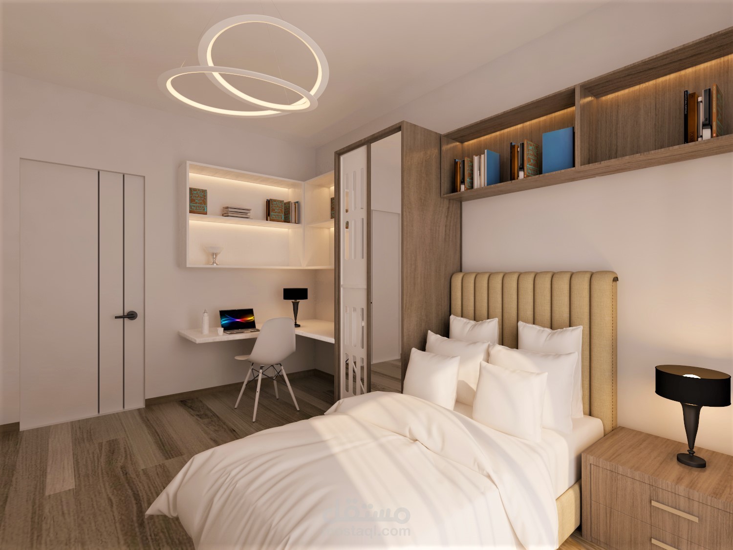 Room designed for boy with single bed and closet with study corner.