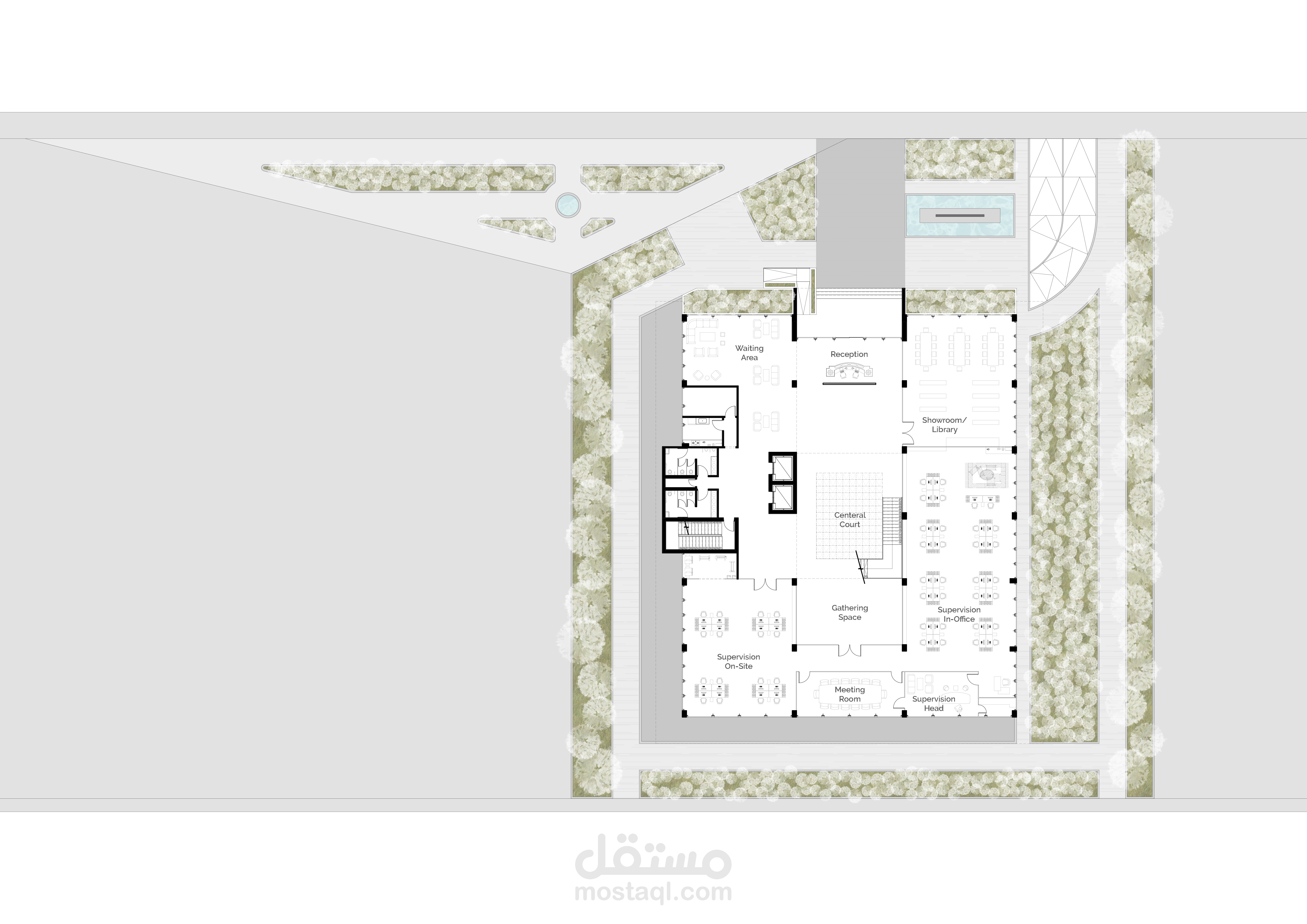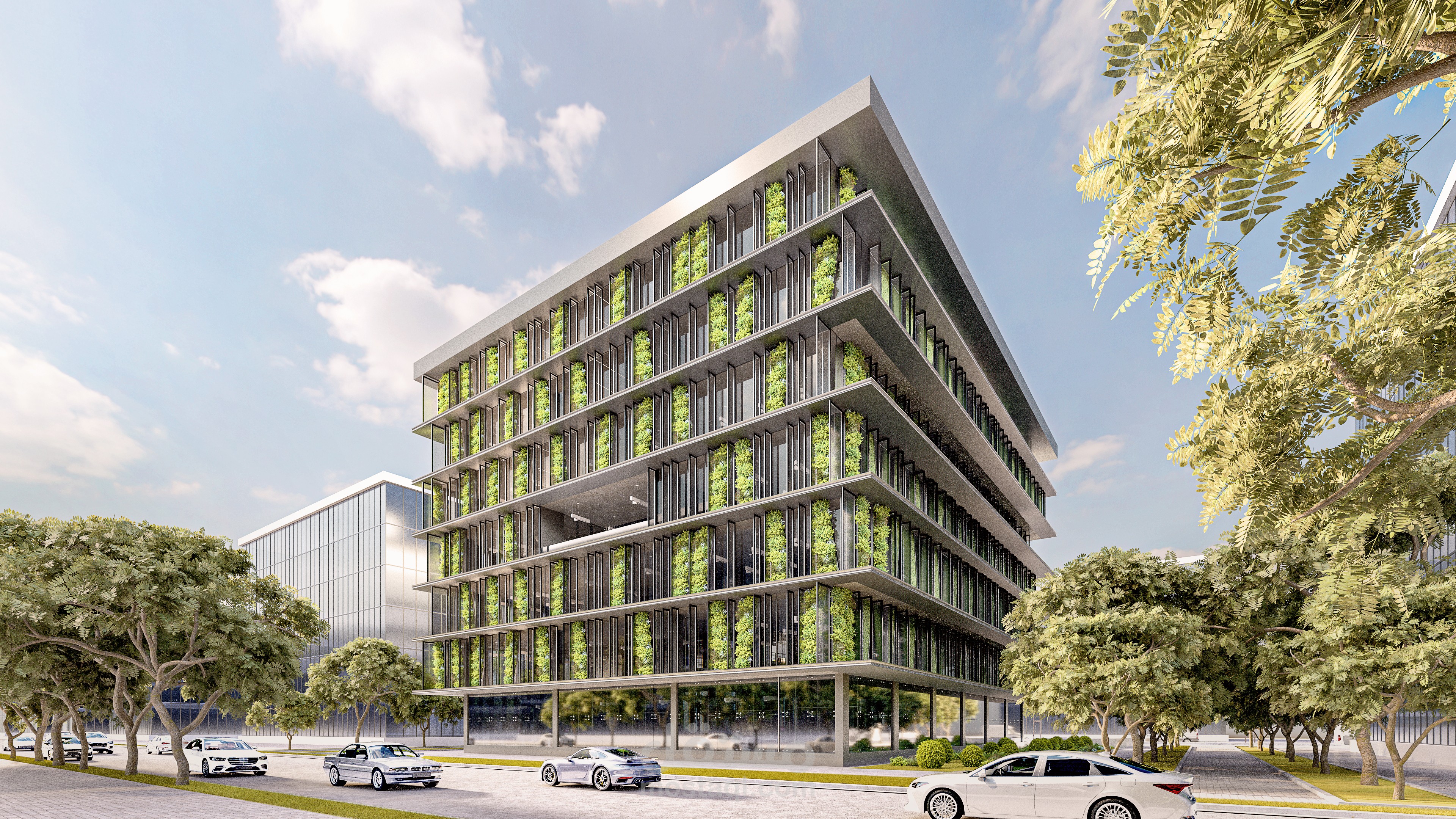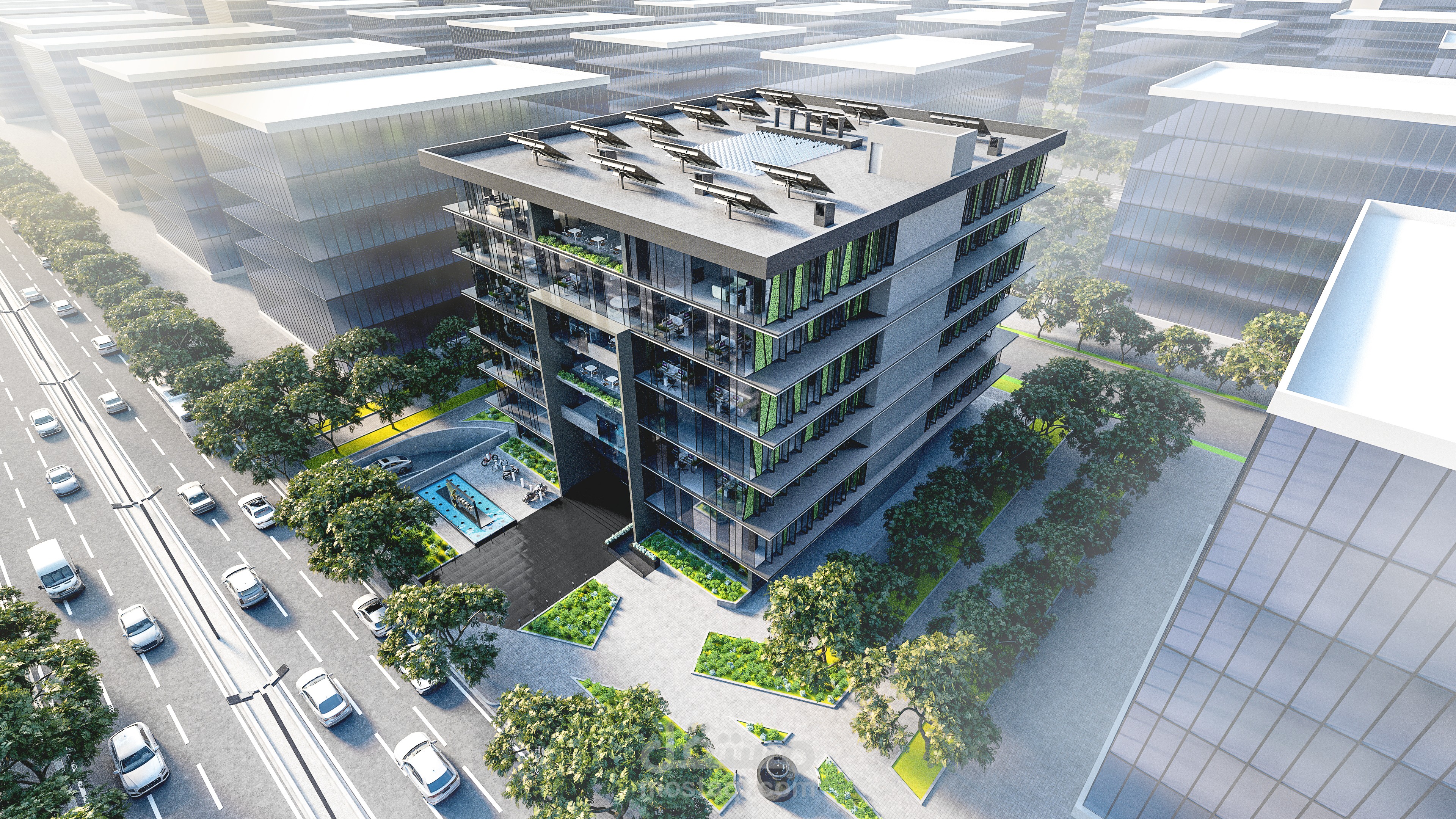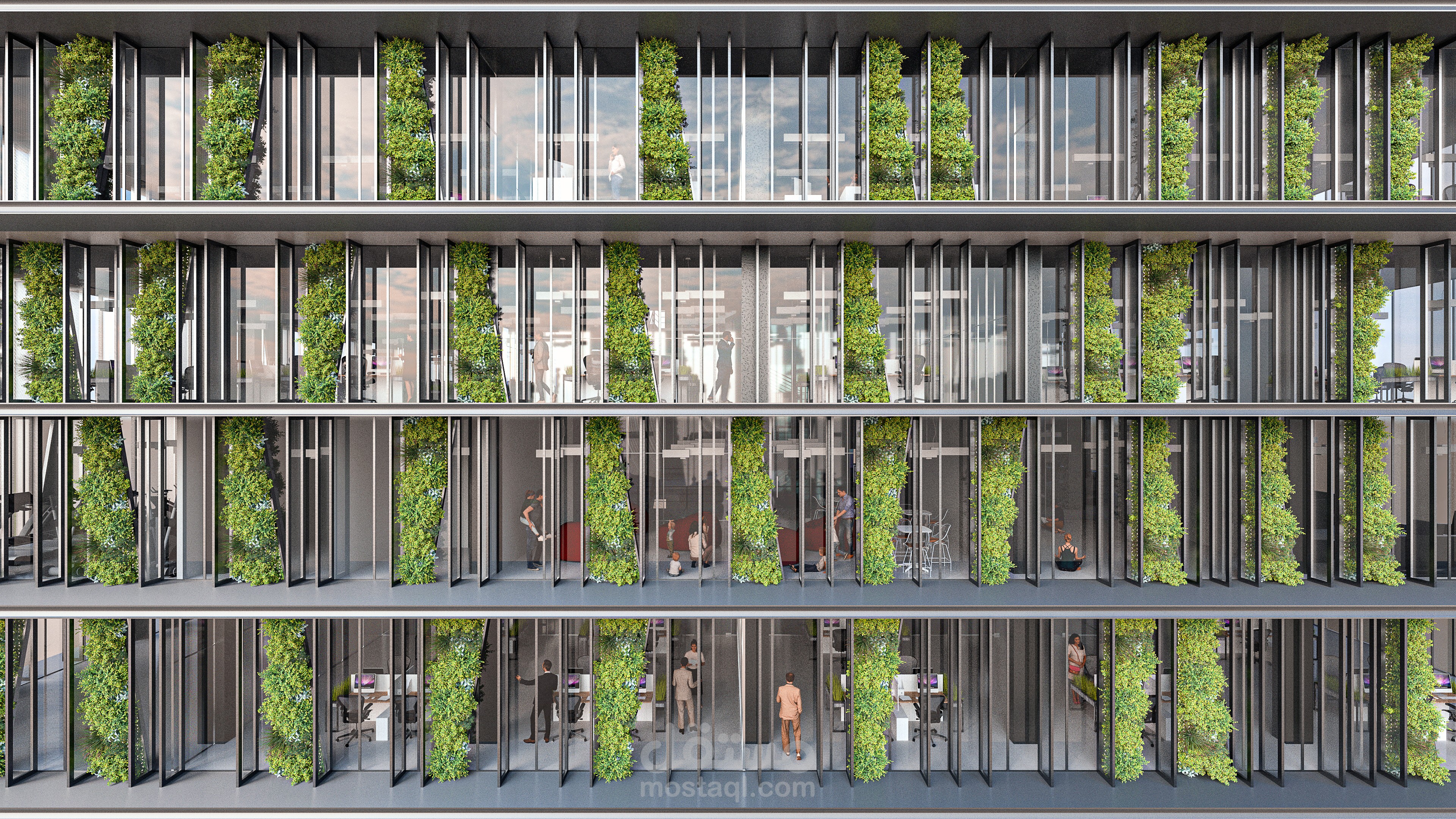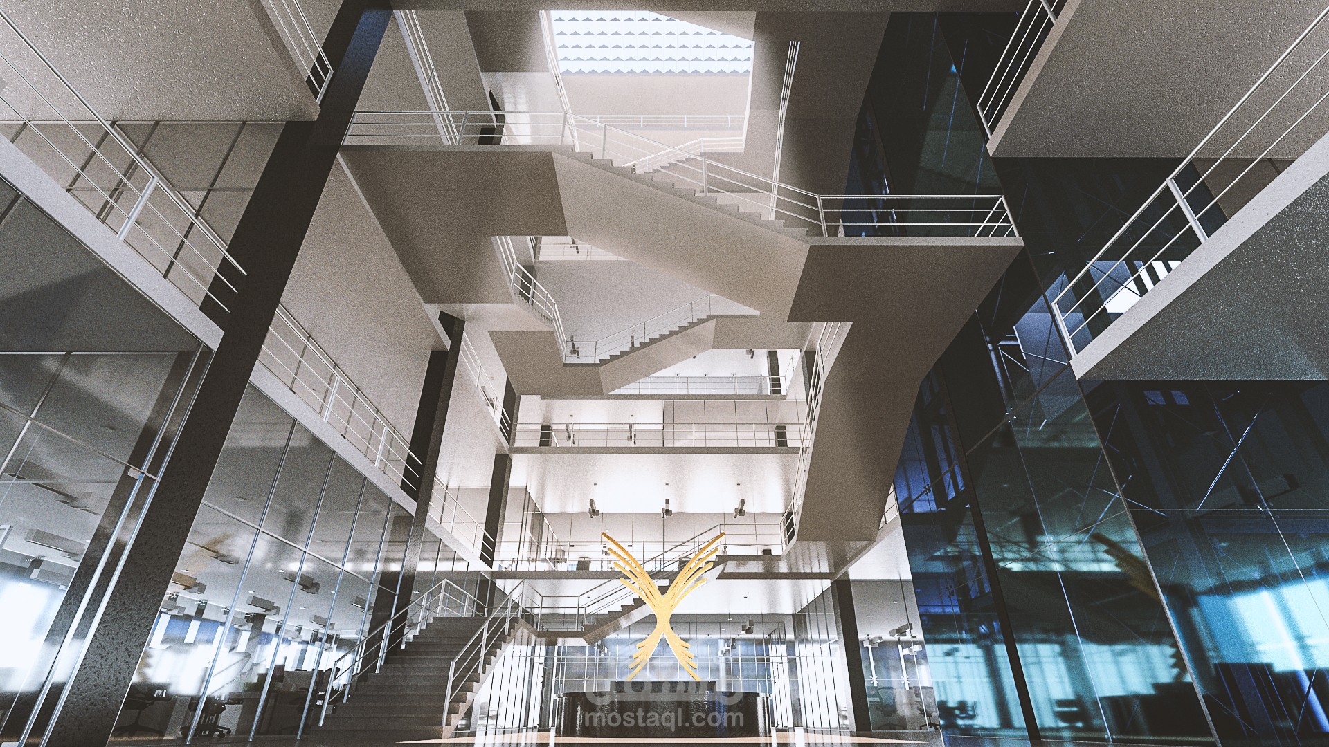 Environmental treatments were applied in the form of green walls, triple glazing, and wind catchers. As for the employee, every space was exposed to The exterior curtain walls & the central court with its skylight. An entire entertainment floor was designed for every possible hobby. the free plan implemented in this project guarantees flexibility and ease of future re-arrangement.
