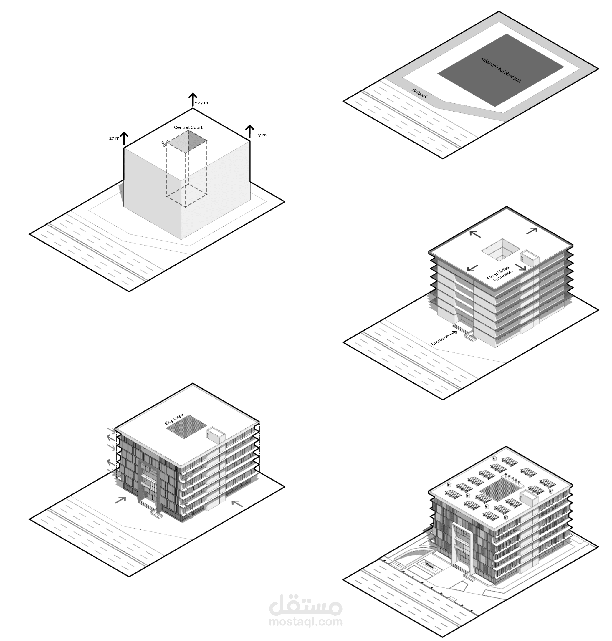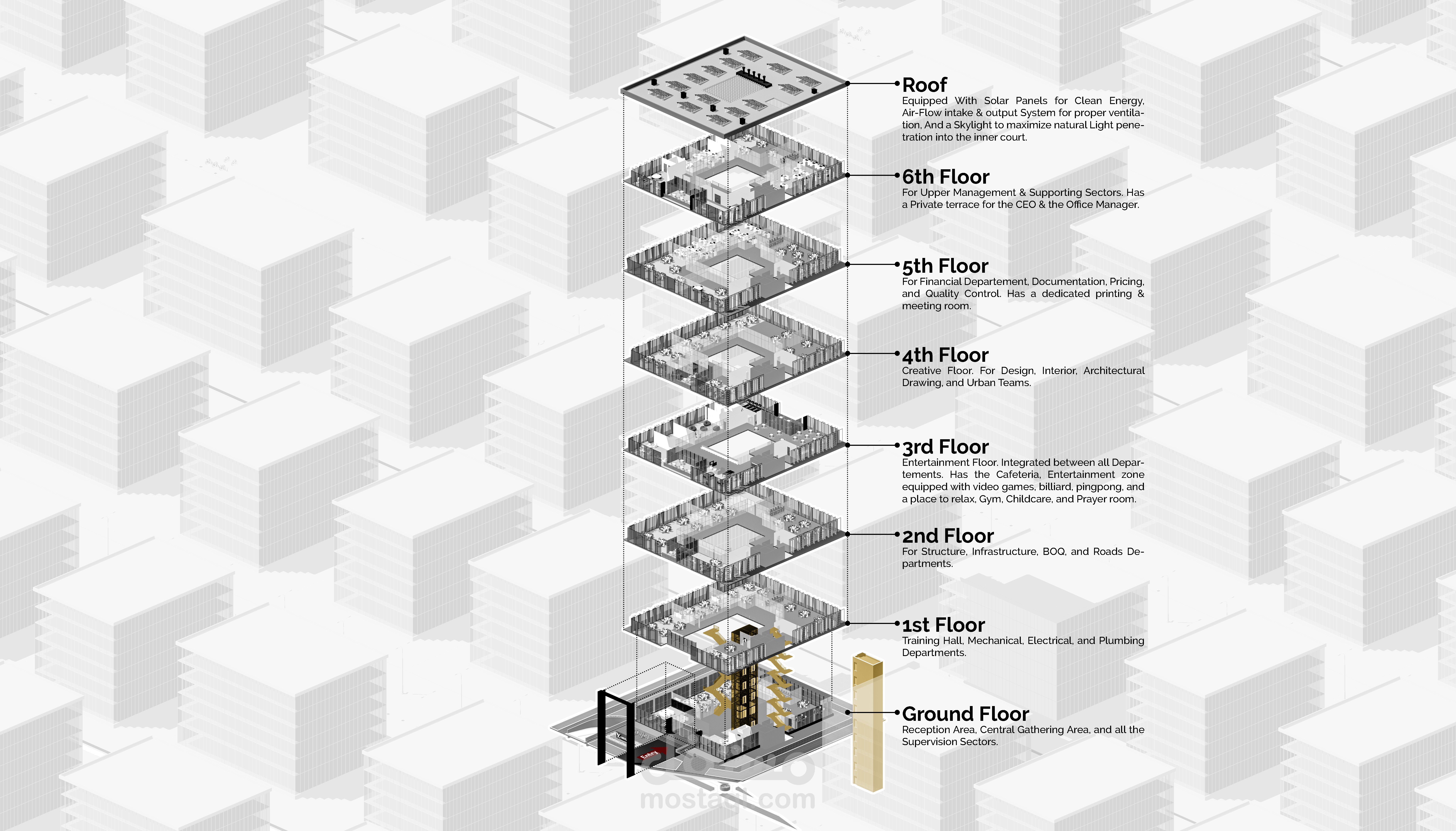 Wind Catchers aligned with wind direction. Columns are coated with pipes to carry out the cold air to all floor slabs letting the air out through floor and ceiling openings to maximize ventilation