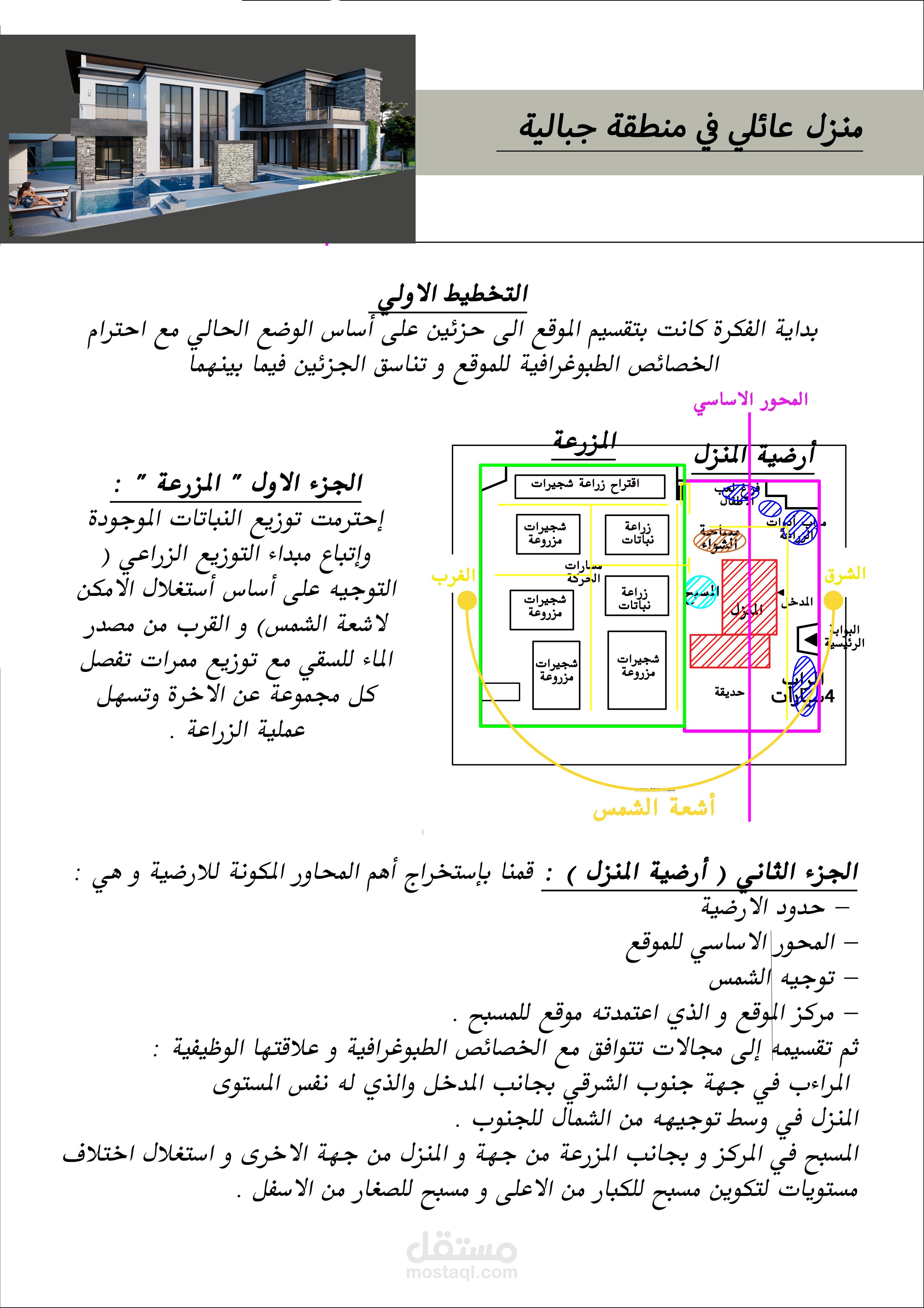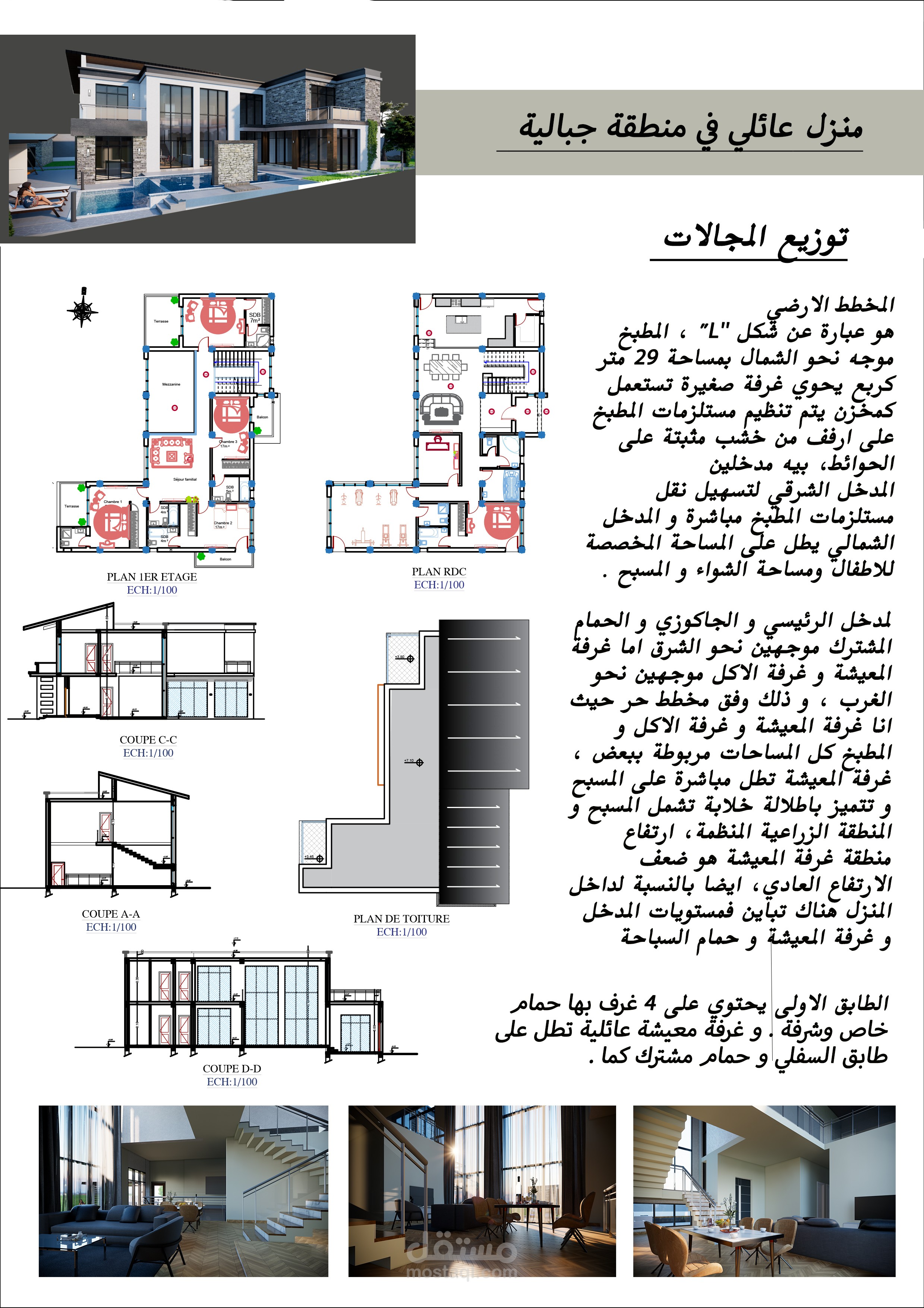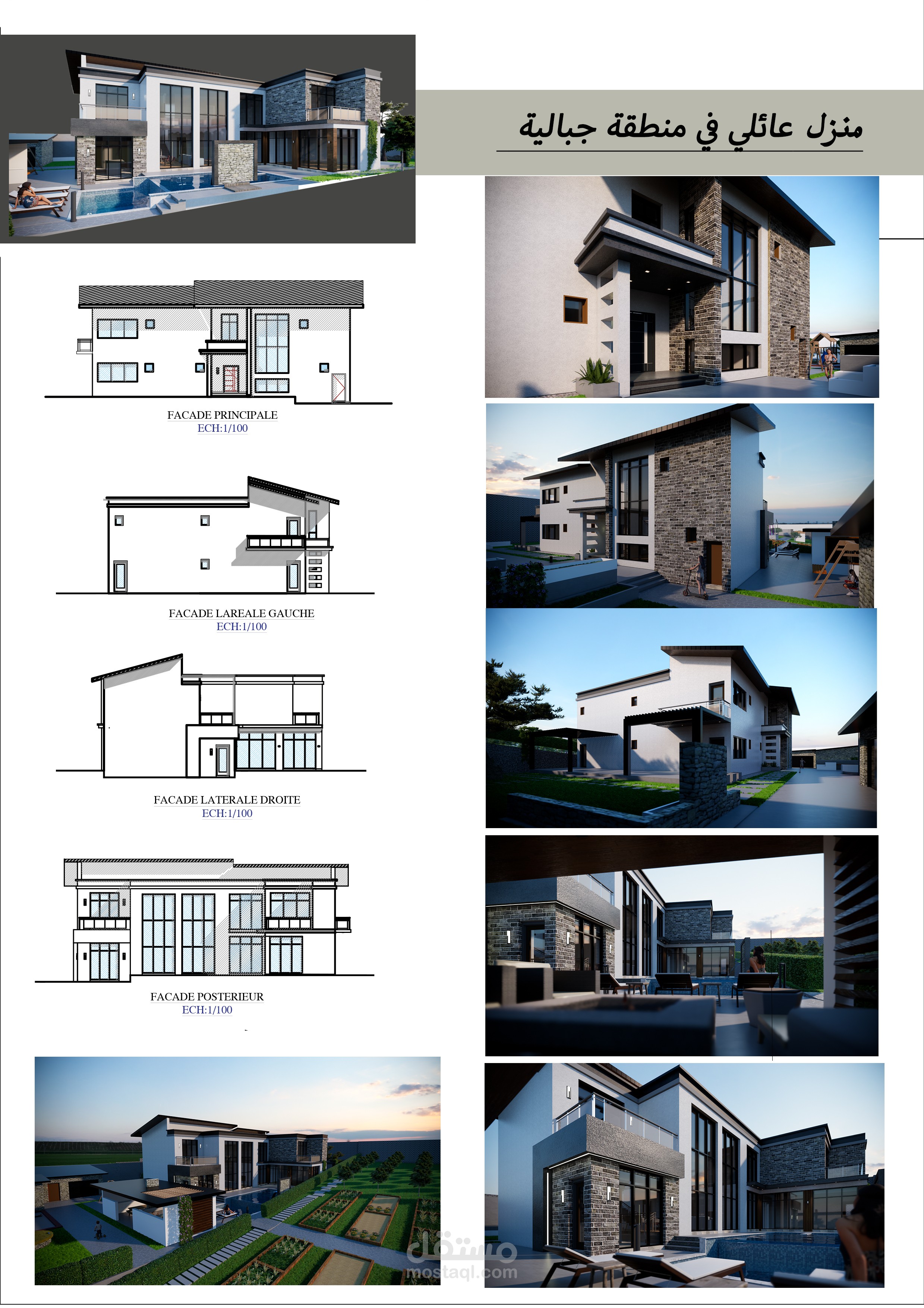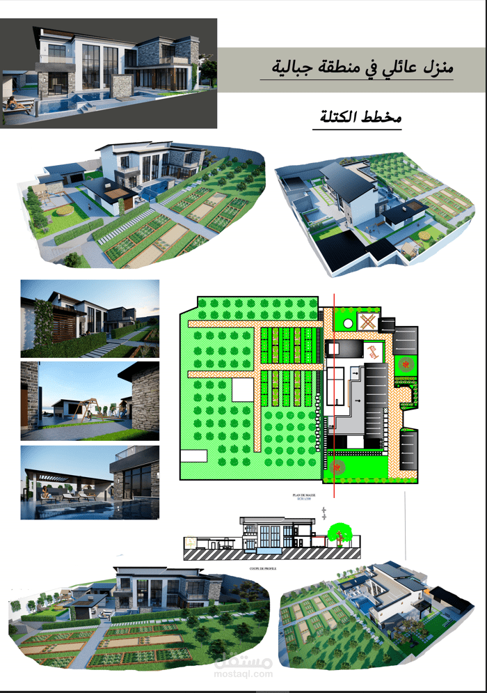 المشروع عبارة عن تصميم فيلا بمنطقة جبلية بمزرعة خاصة بجميع مخططاتها التنفيذية شامل جميع الواجهات والقطاعات والفرش المخصص للبيت و تصميم حديقة الخاريجية و لاند سكايب مع اعادة تصميم للمزرعة مع احترام المساحات و المجالات المطلوبة و استخدام الخامات و الالوان المناسبة للبيئة و الموقع .