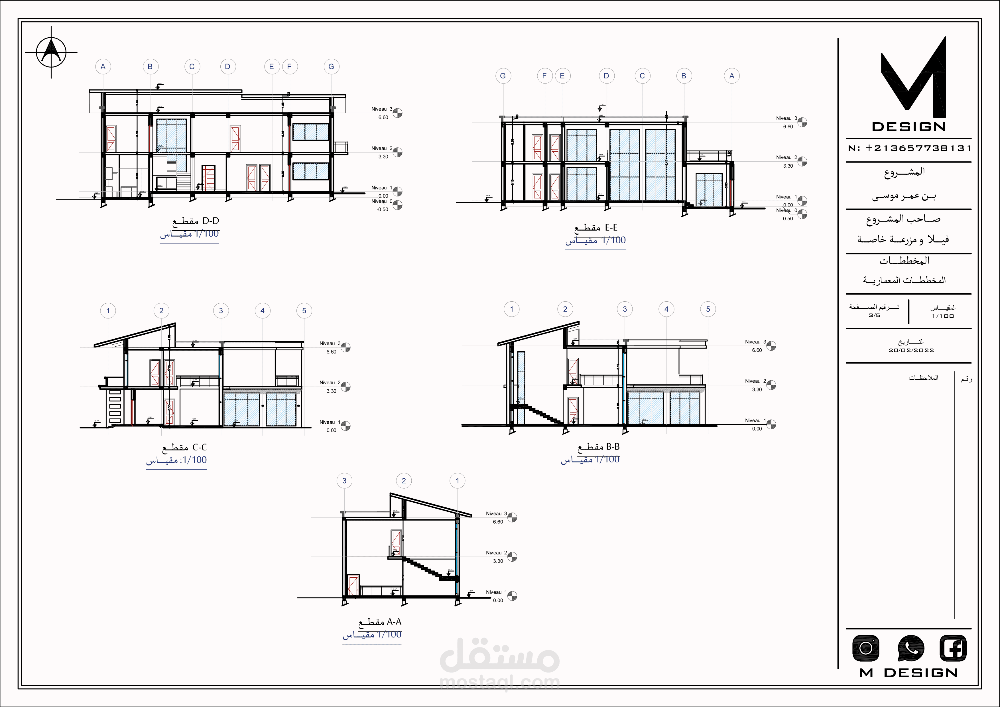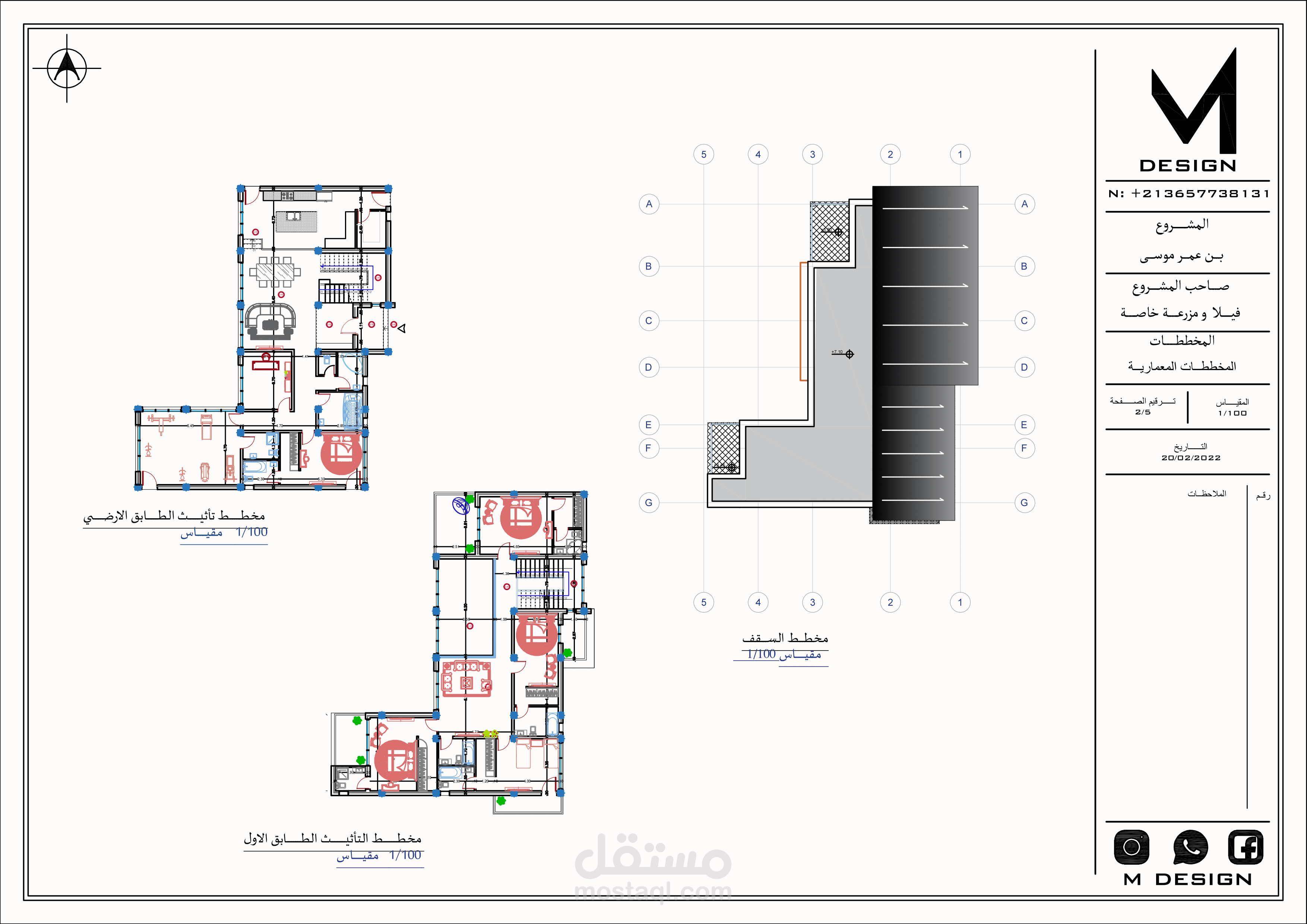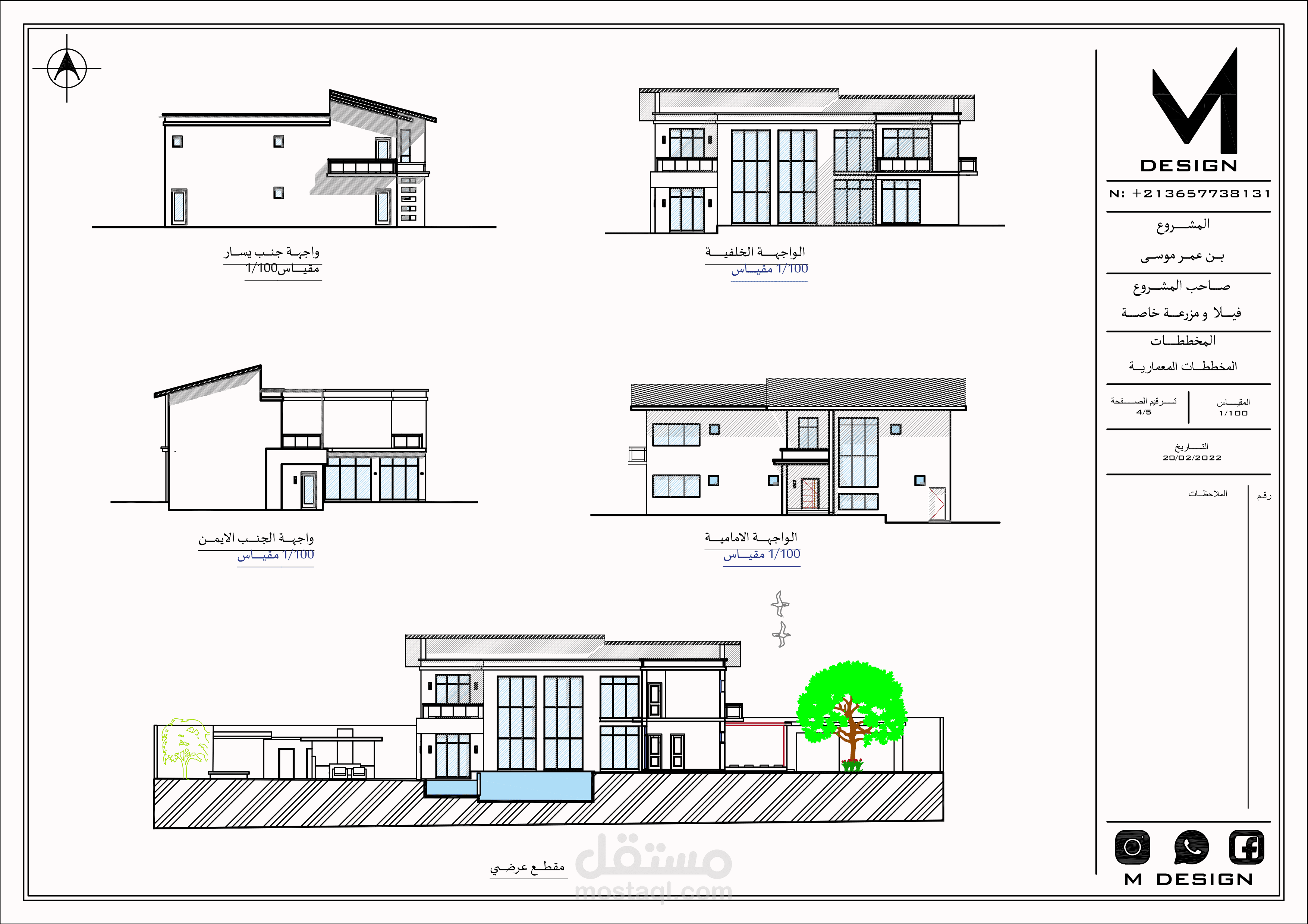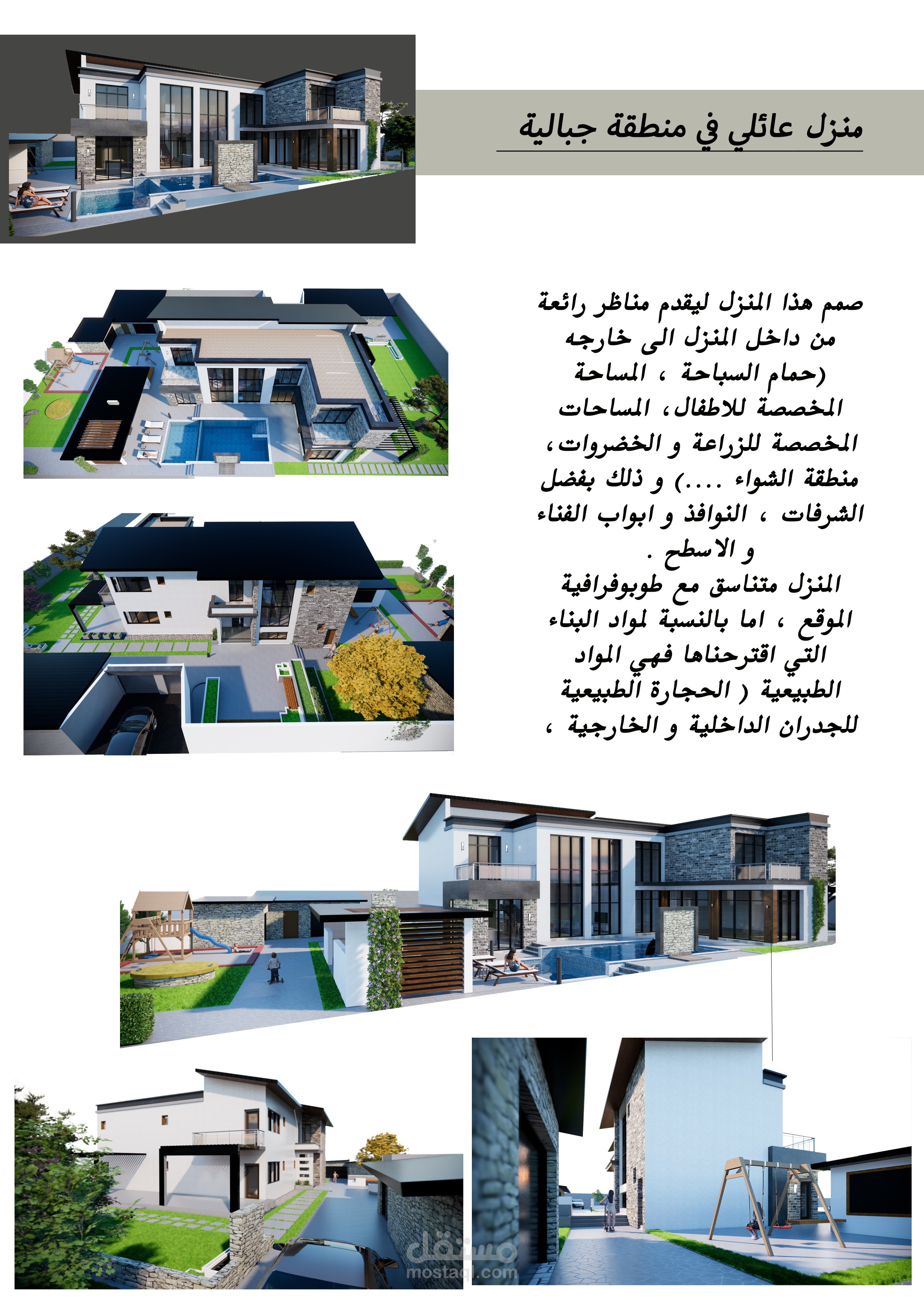 المشروع عبارة عن تصميم فيلا بمنطقة جبلية بمزرعة خاصة بجميع مخططاتها التنفيذية شامل جميع الواجهات والقطاعات والفرش المخصص للبيت و تصميم حديقة الخاريجية و لاند سكايب مع اعادة تصميم للمزرعة مع احترام المساحات و المجالات المطلوبة و استخدام الخامات و الالوان المناسبة للبيئة و الموقع .