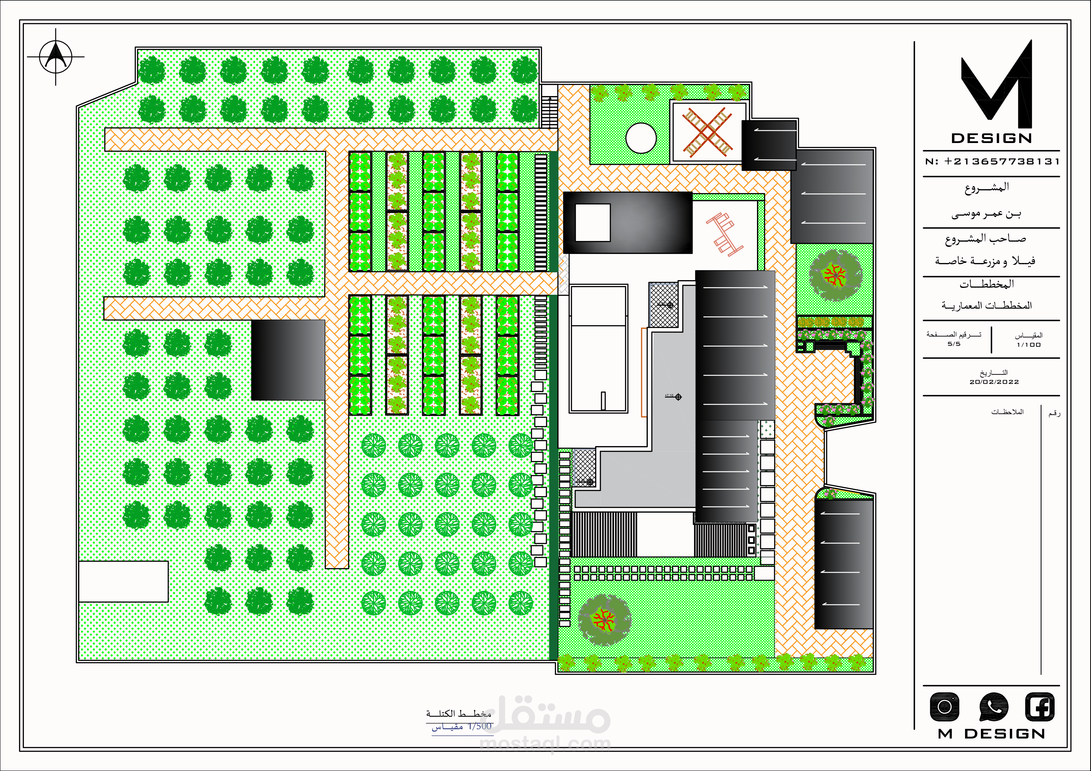 مساحة أشجار و فواكه - مساحة أشجار الزيتون - مساحة زرع الخضراوات - مسارات الحركة - مخزن للادوات الفلاحية - مكان للحيوانات - مكان بئر - مساحة للازهار و نباتات الزينة فاصلة بين المزرعة ومجال الفيلا و ملحقاتها الخريجية