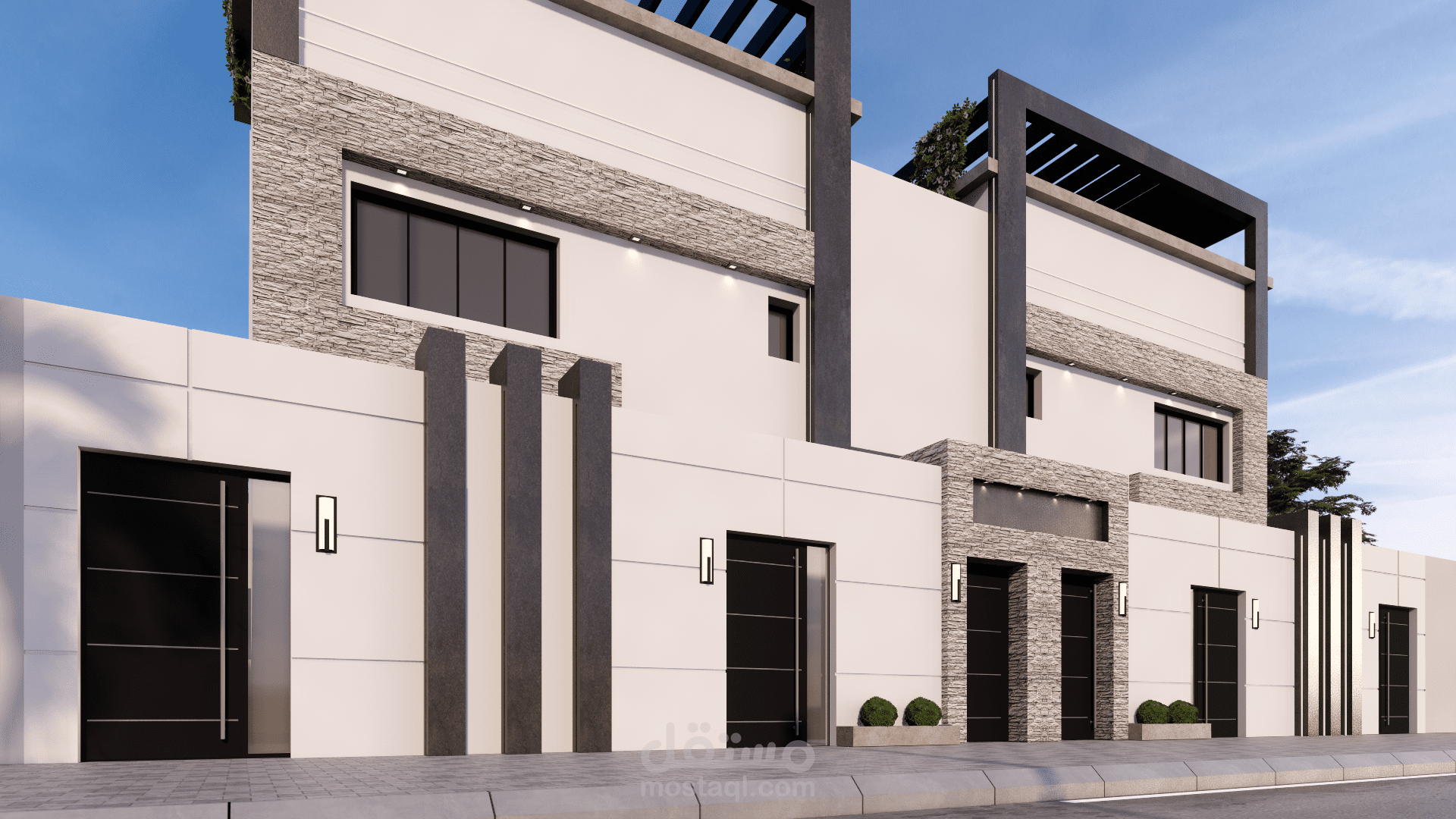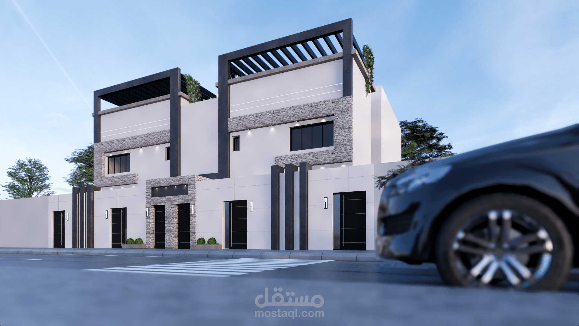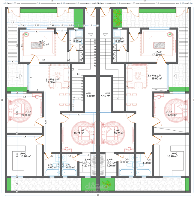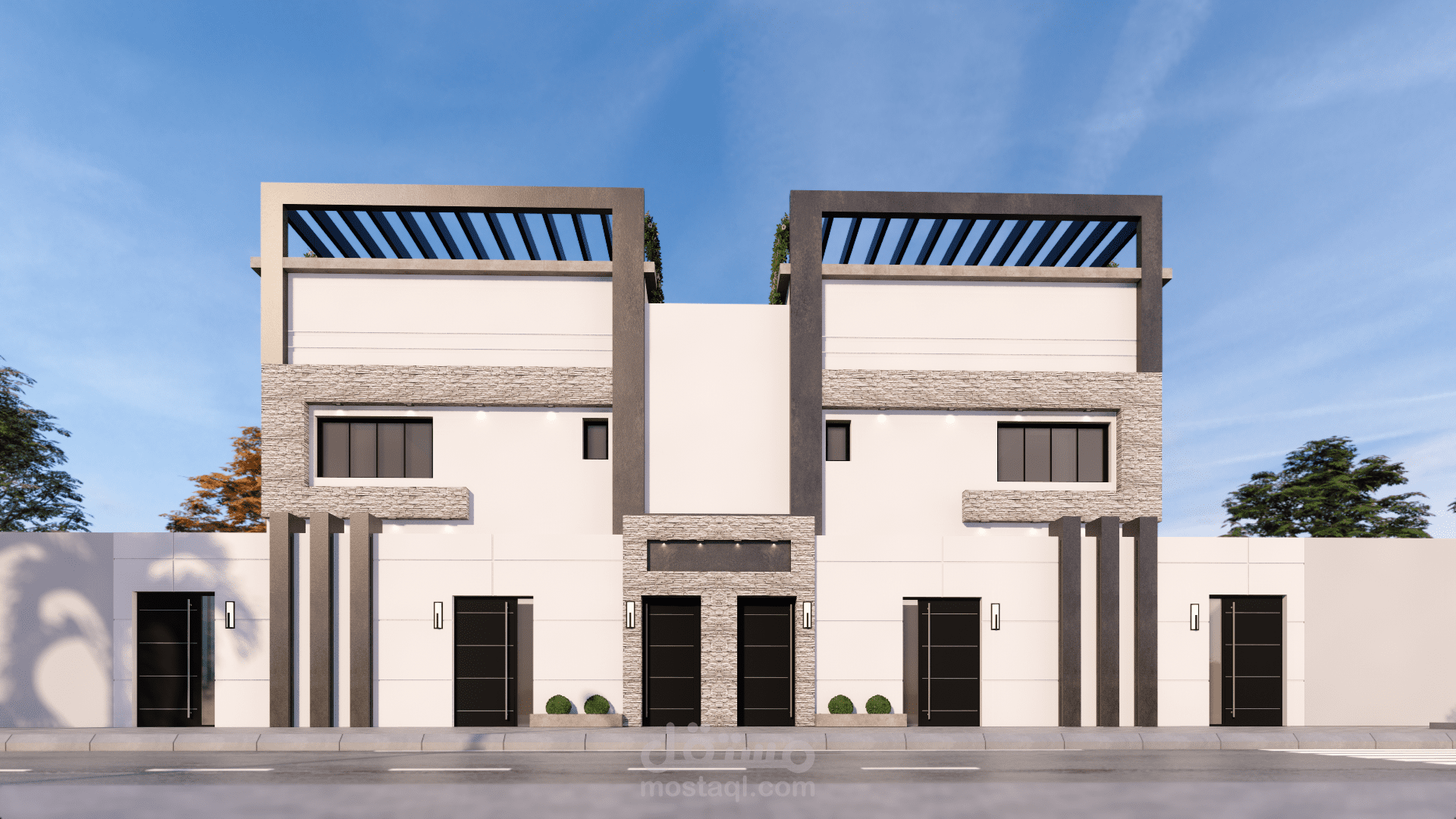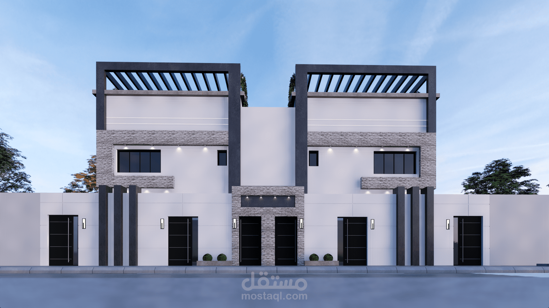 تصميم شقق مودرن دوبلاكس بطابقين و ملحق علوي حسب كود السعودي في المملكة العربية السعودية ( شقتين في طابق الارضي و شقتين في طابق الاول مع ملحق كل شقة لها المدخل الخاص بها مستقل عن الاخرة )