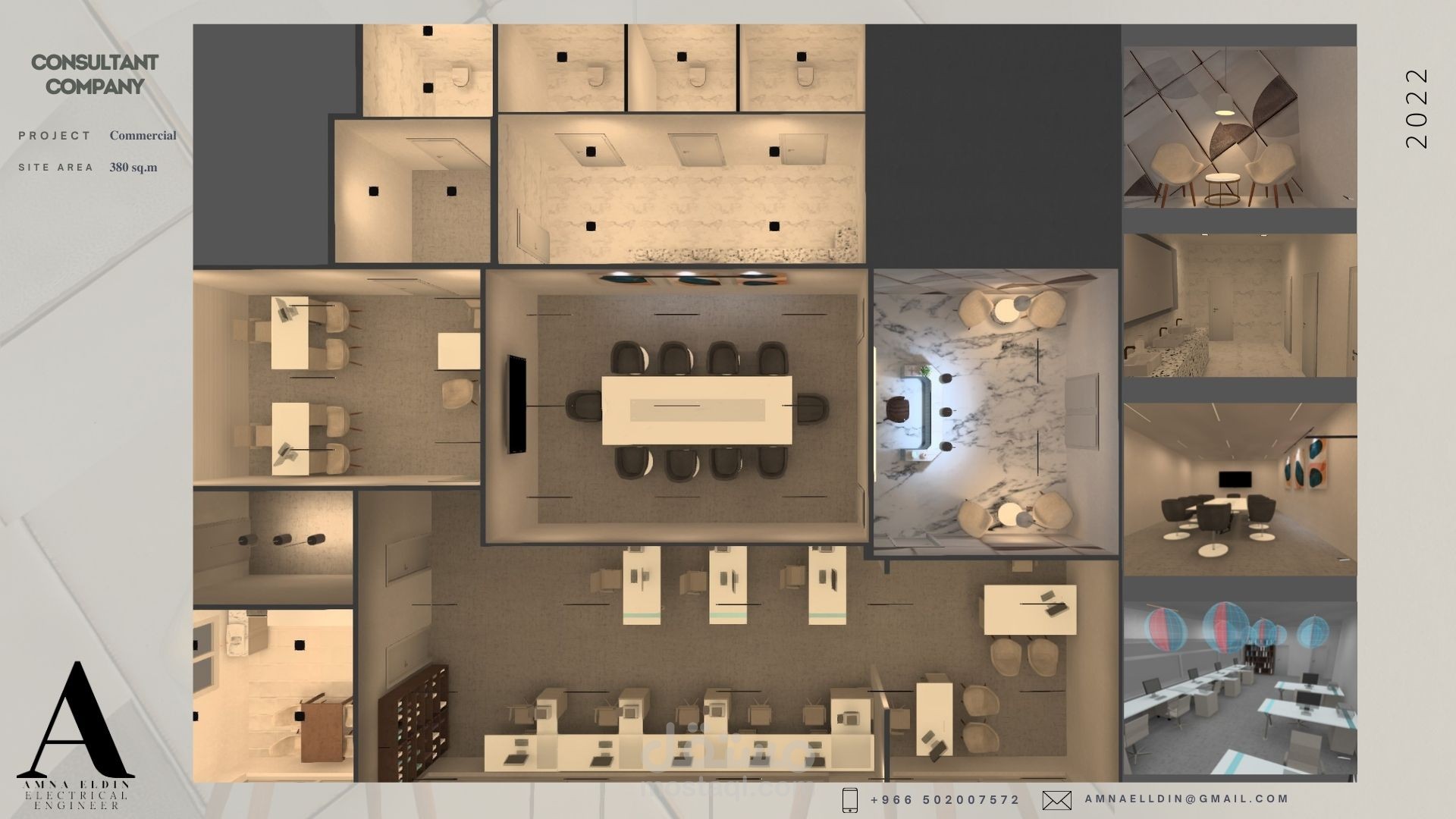 Engineering consultancy firm, designed on the site of 380 sq.m with one storey. The ground storey has two baths, a dining area, three offices, and a meeting room. LED warm light luminaires are generally used here with 4000 K color temperature with a wide beam angle in general lighting and a narrow beam with task lighting.