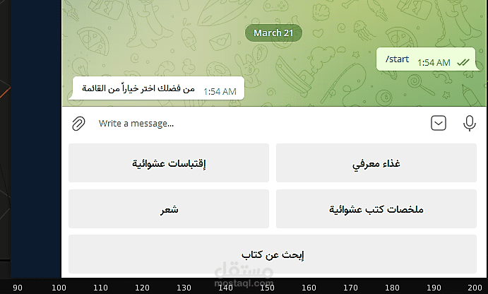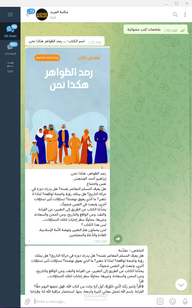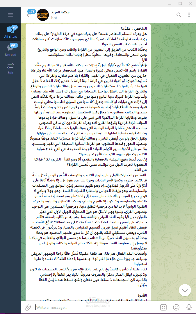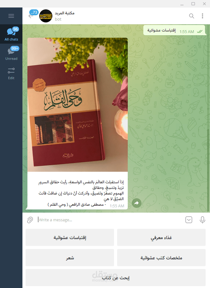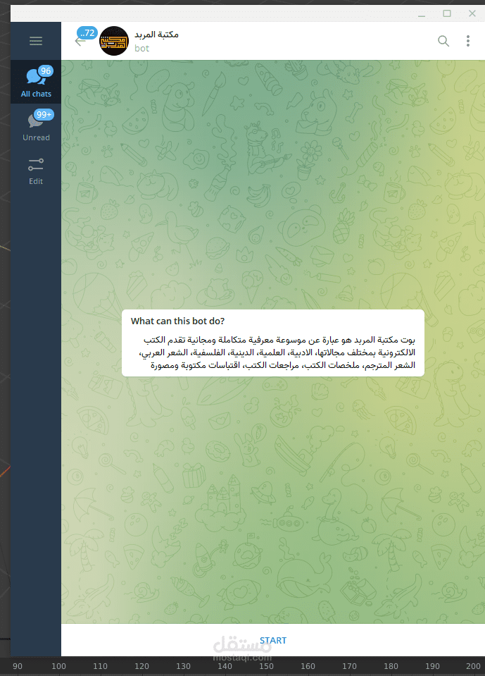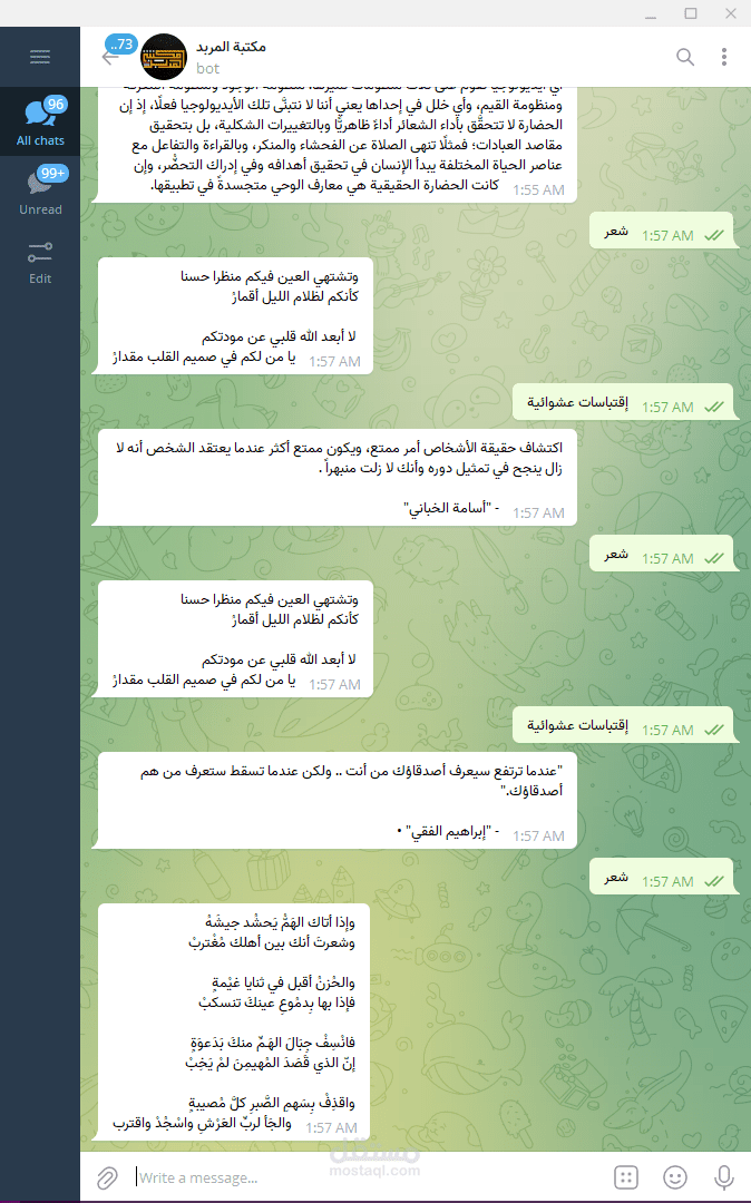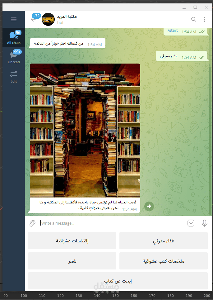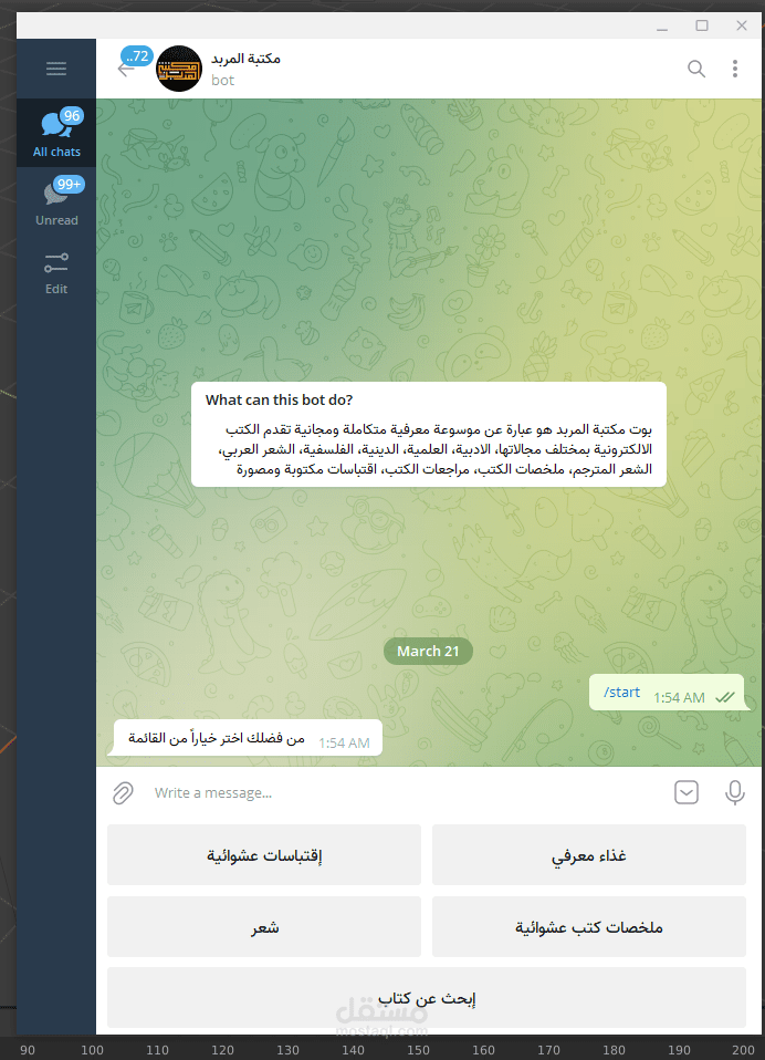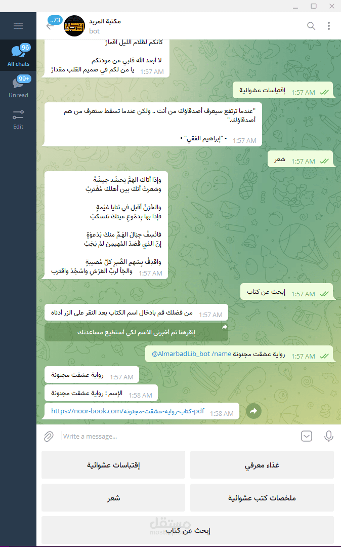 البوت يعمل على التلجرام يقوم بنشر الكتب وتلخيصات وشعر ومقالات والعديد من الامور الادبية ويحتوي على بحث خارجي في موقع كتب وايضا بحث داخلي ويقوم بجلب النتائج منه وتزويد المستخدم برابط لتحميل الكتاب المطلوب , كما ويحتوي على ادمن بانيل لاضافة الشعر والتلاخيص