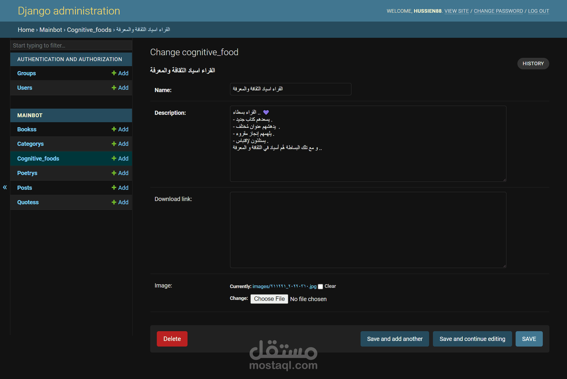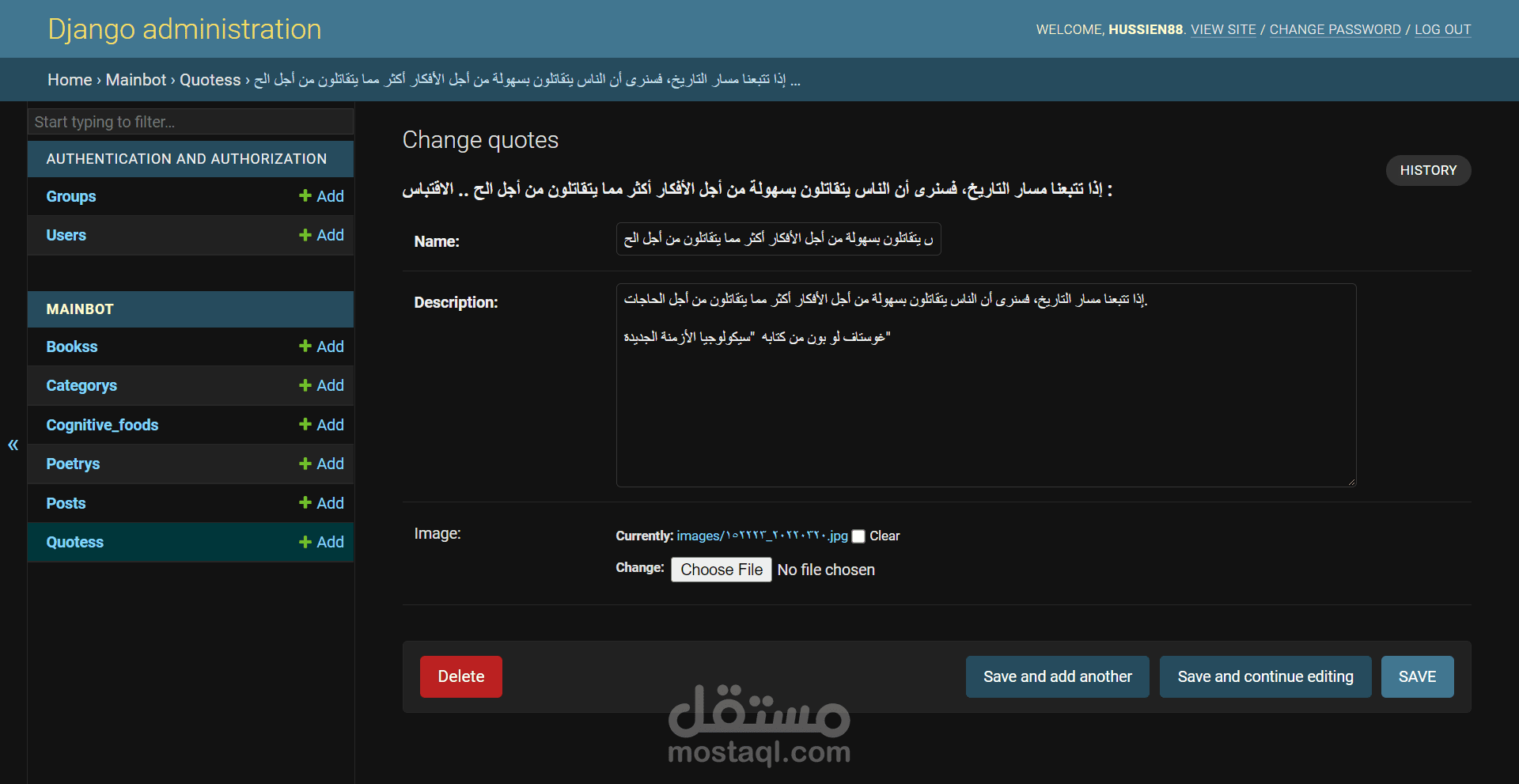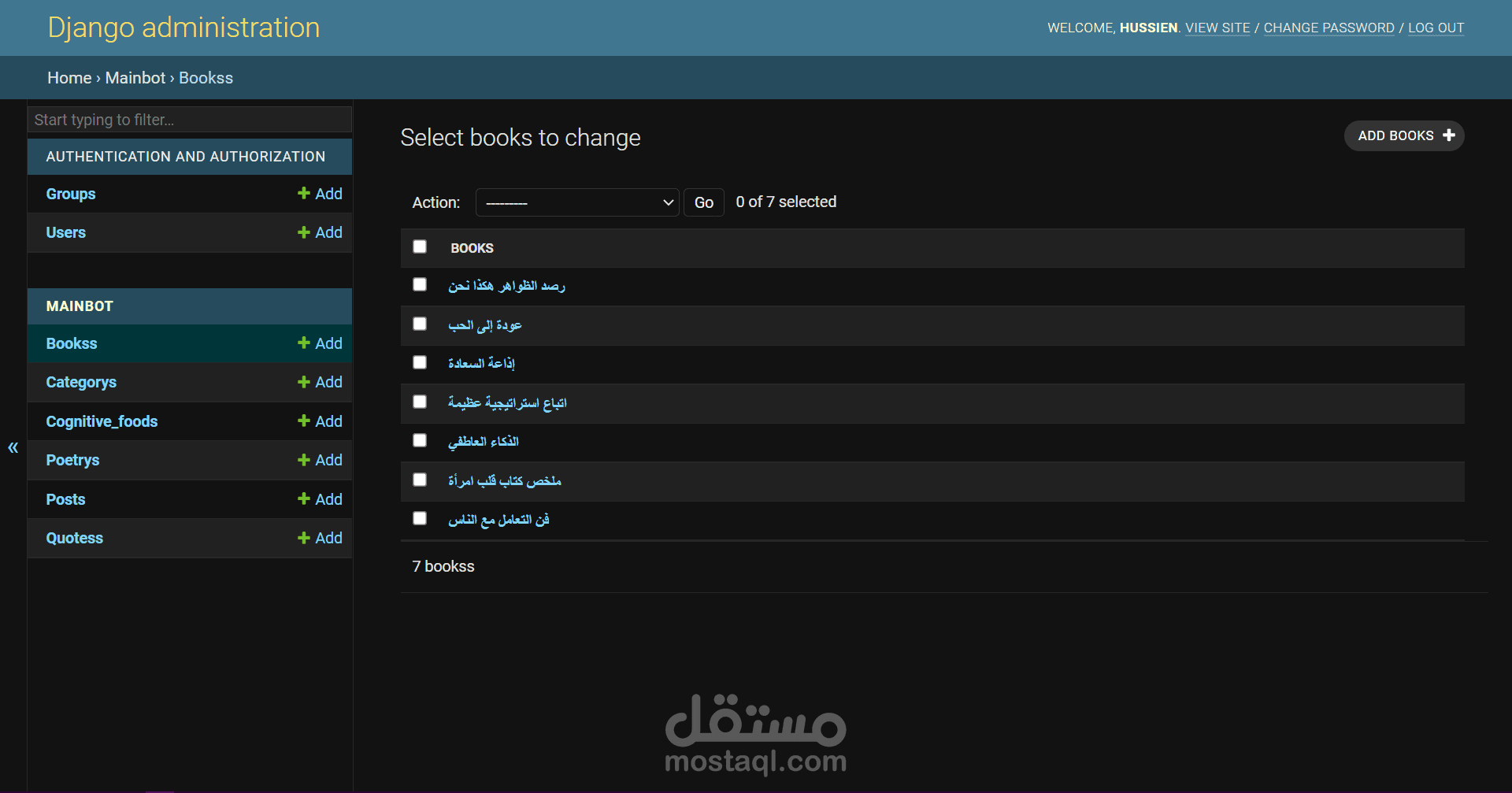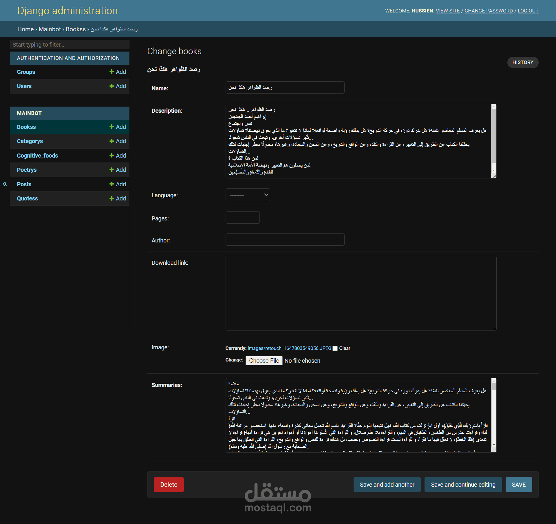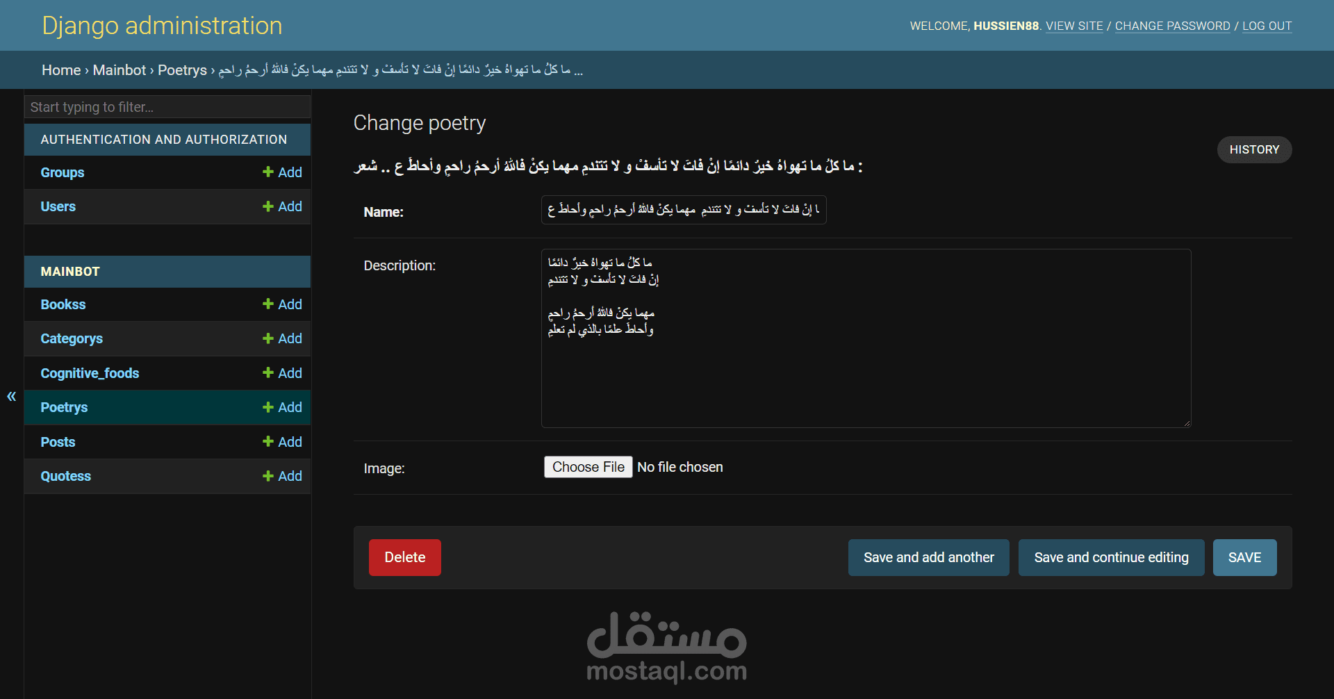 البوت يعمل على التلجرام يقوم بنشر الكتب وتلخيصات وشعر ومقالات والعديد من الامور الادبية ويحتوي على بحث خارجي في موقع كتب وايضا بحث داخلي ويقوم بجلب النتائج منه وتزويد المستخدم برابط لتحميل الكتاب المطلوب , كما ويحتوي على ادمن بانيل لاضافة الشعر والتلاخيص