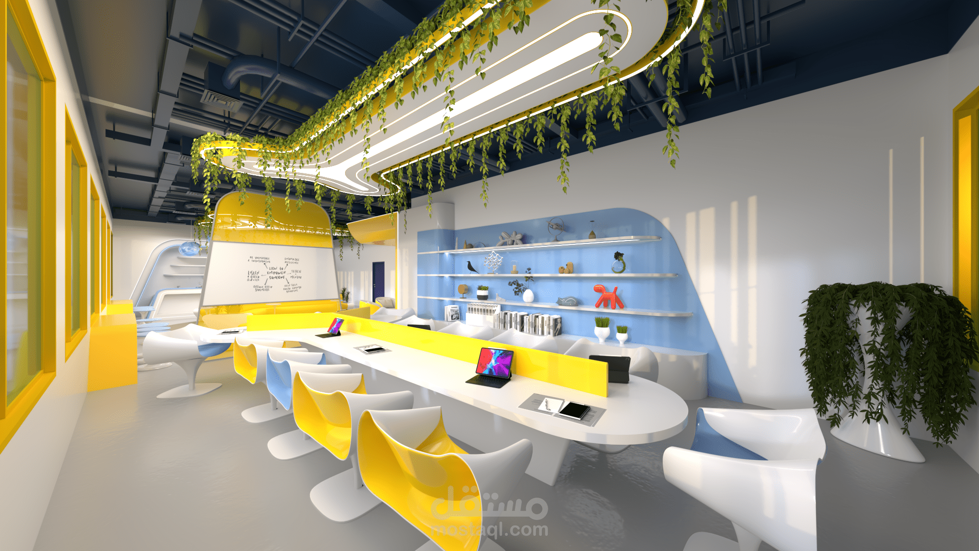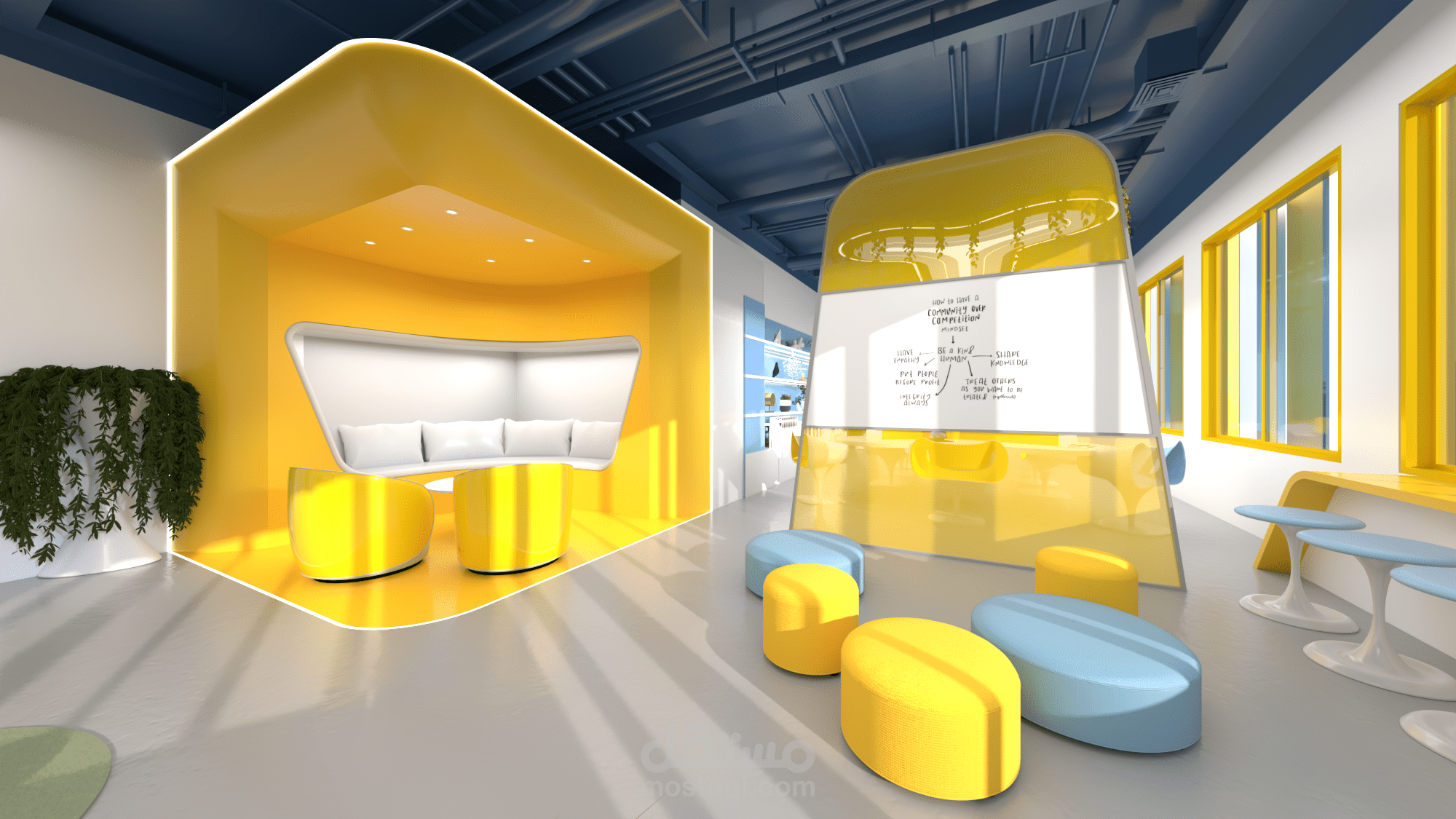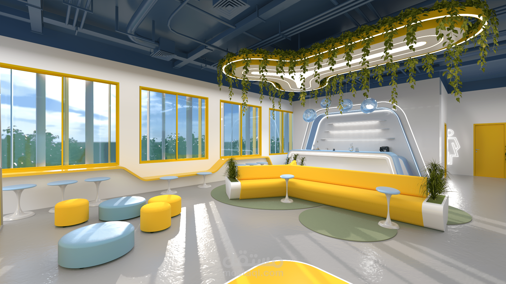 التصميم على النمط المستقبلي المعاصر باستخدام الوان حيوية مشرقة كالأصفر و الأزرق