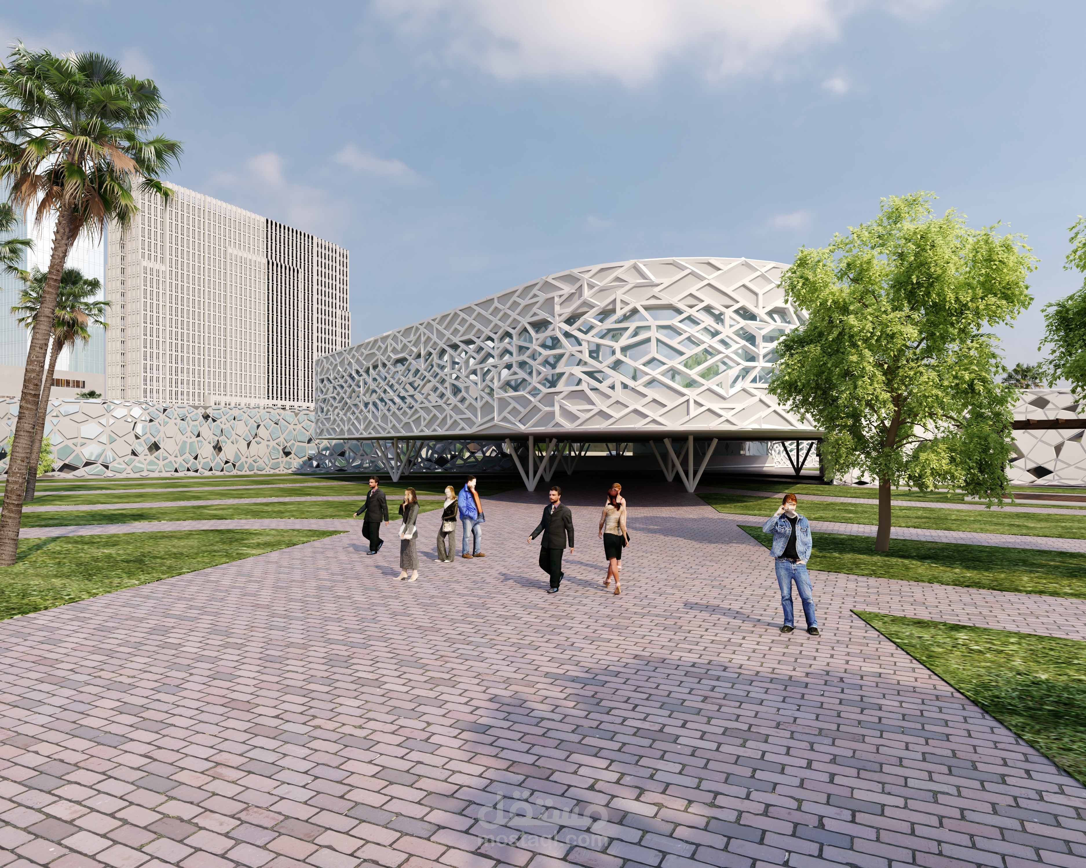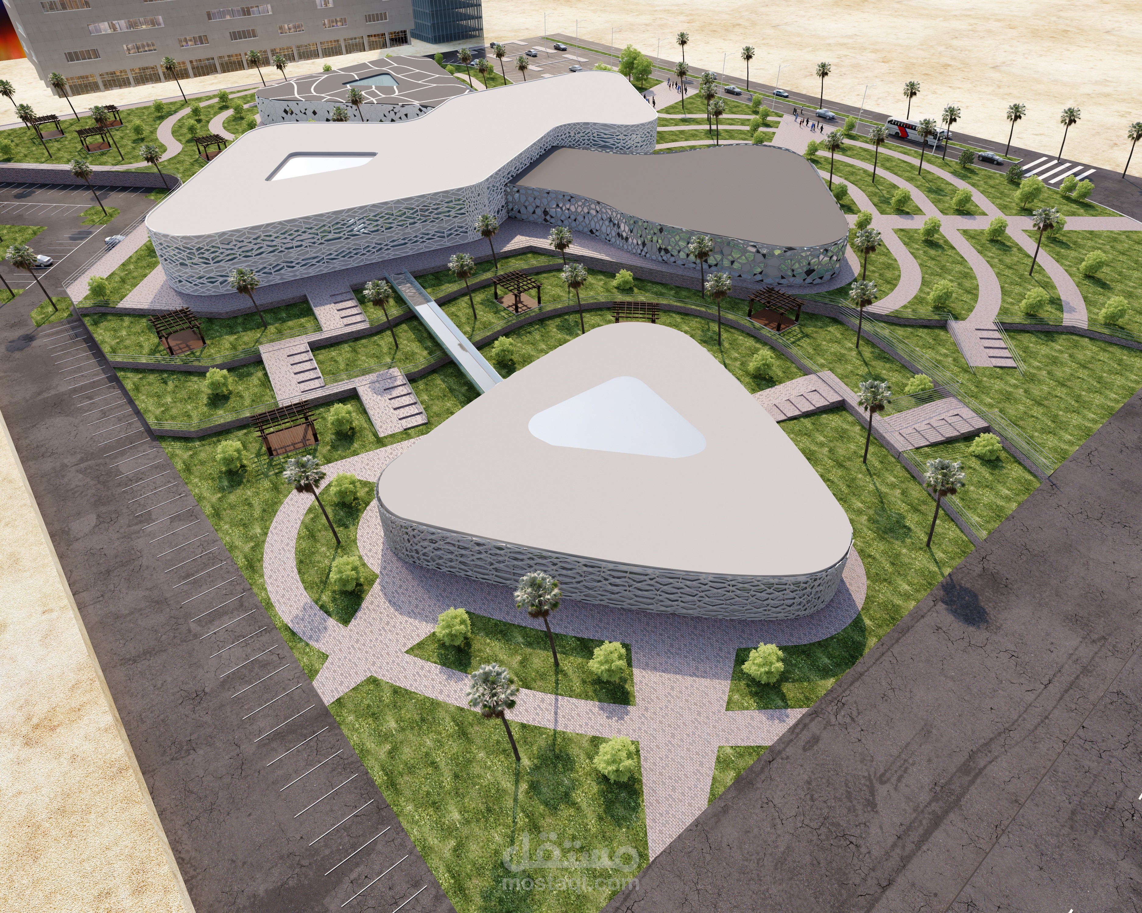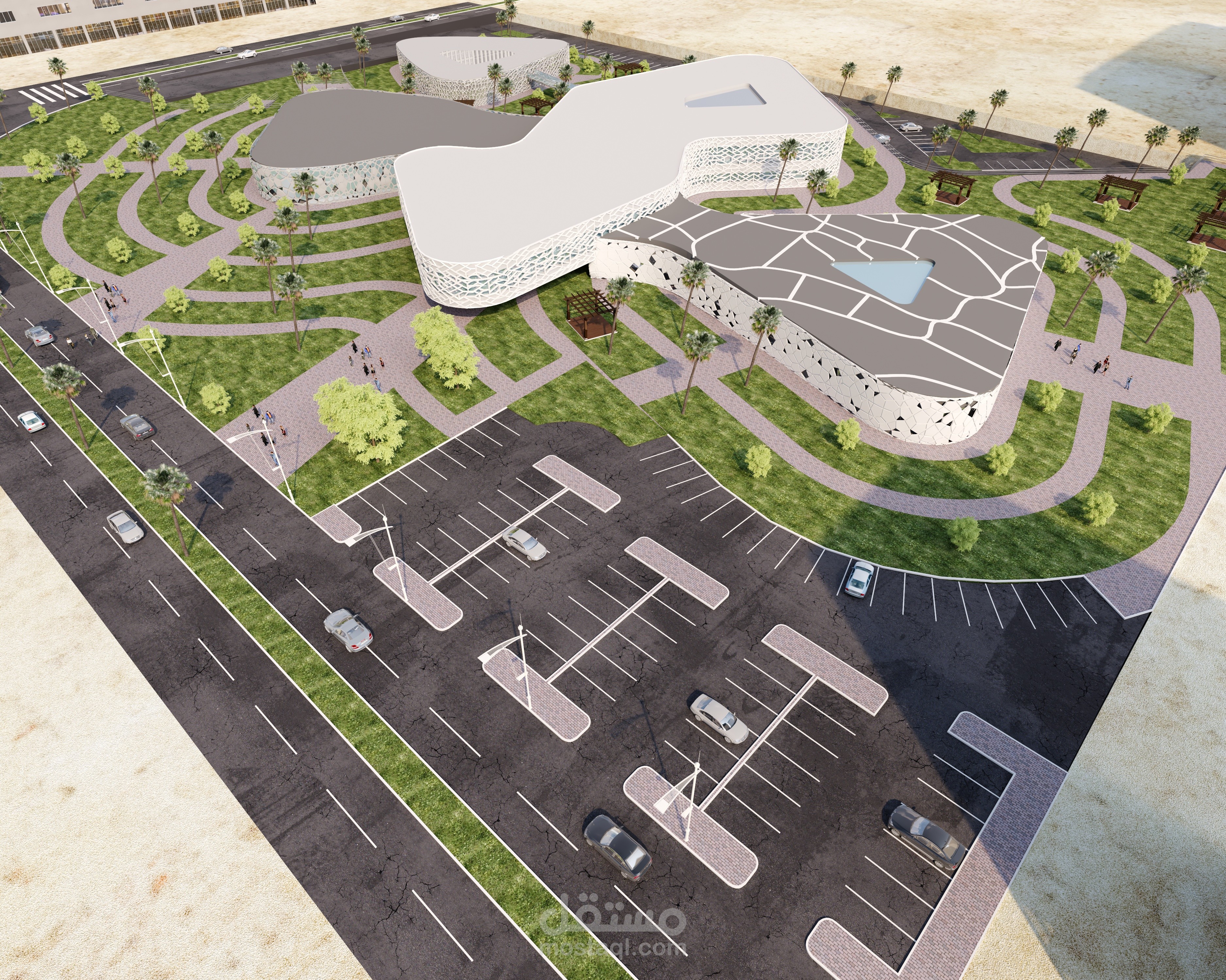 - Making gradations in treating the levels and exploiting them as a plaza, places to sit and umbrellas to cover from the sun’s rays
