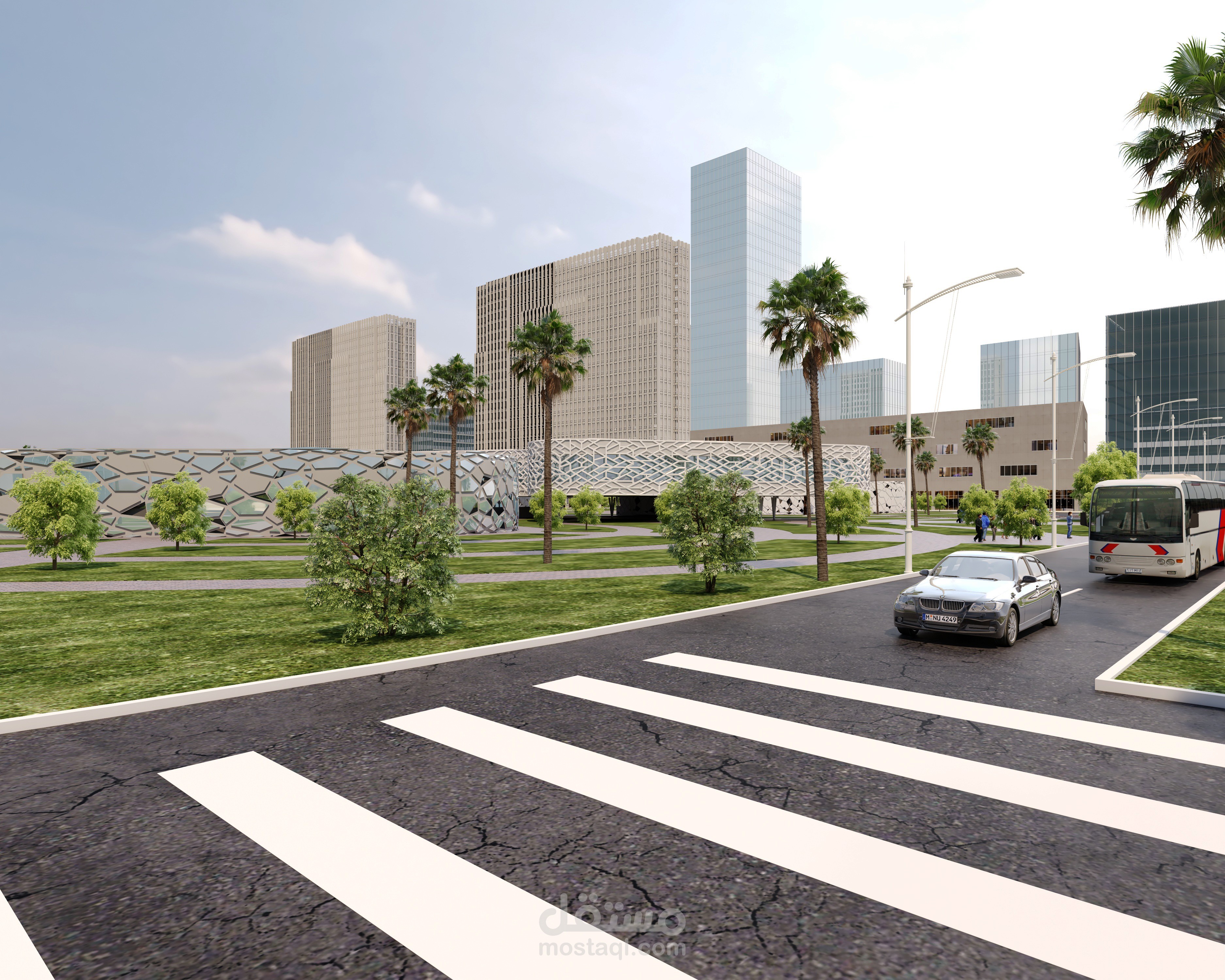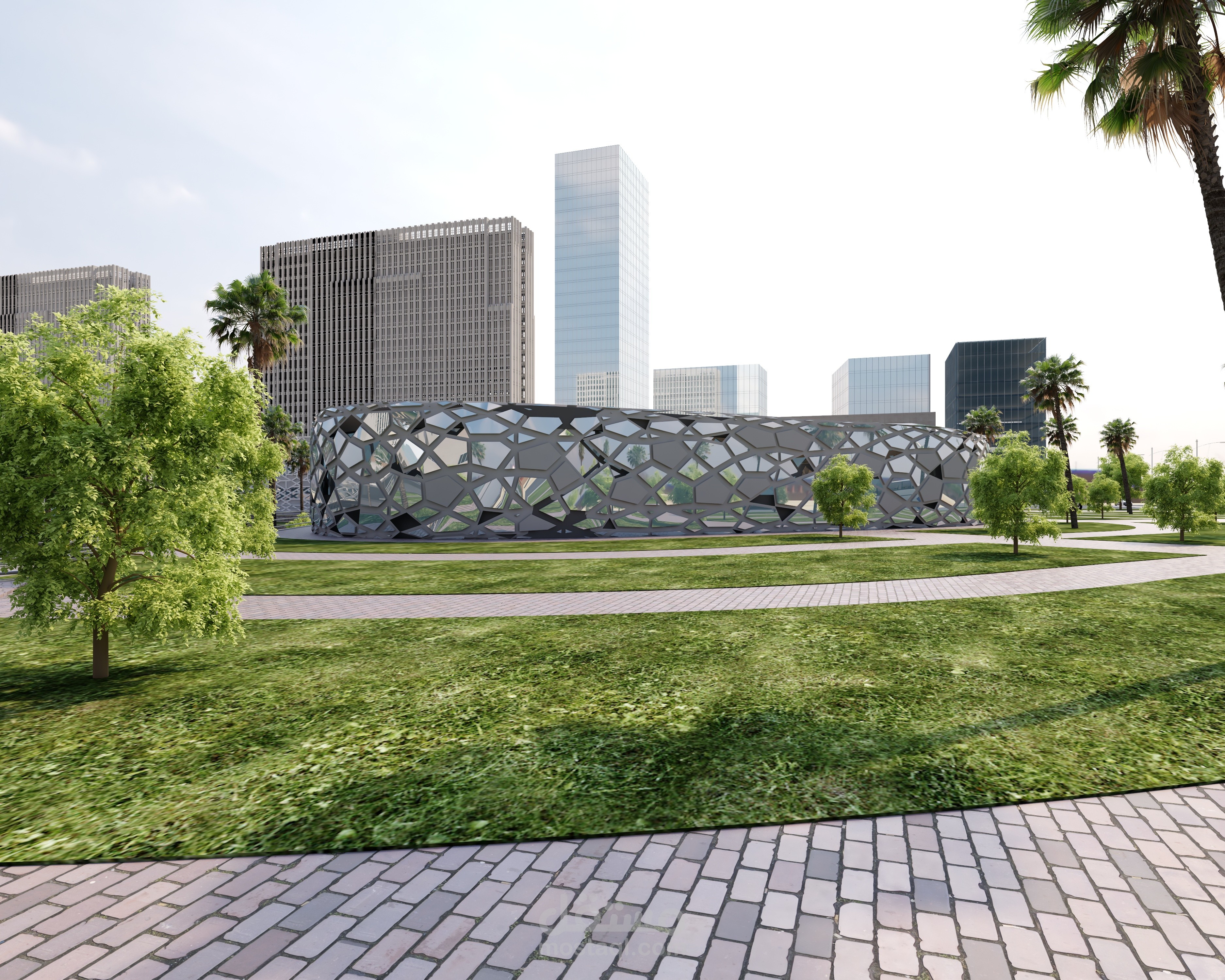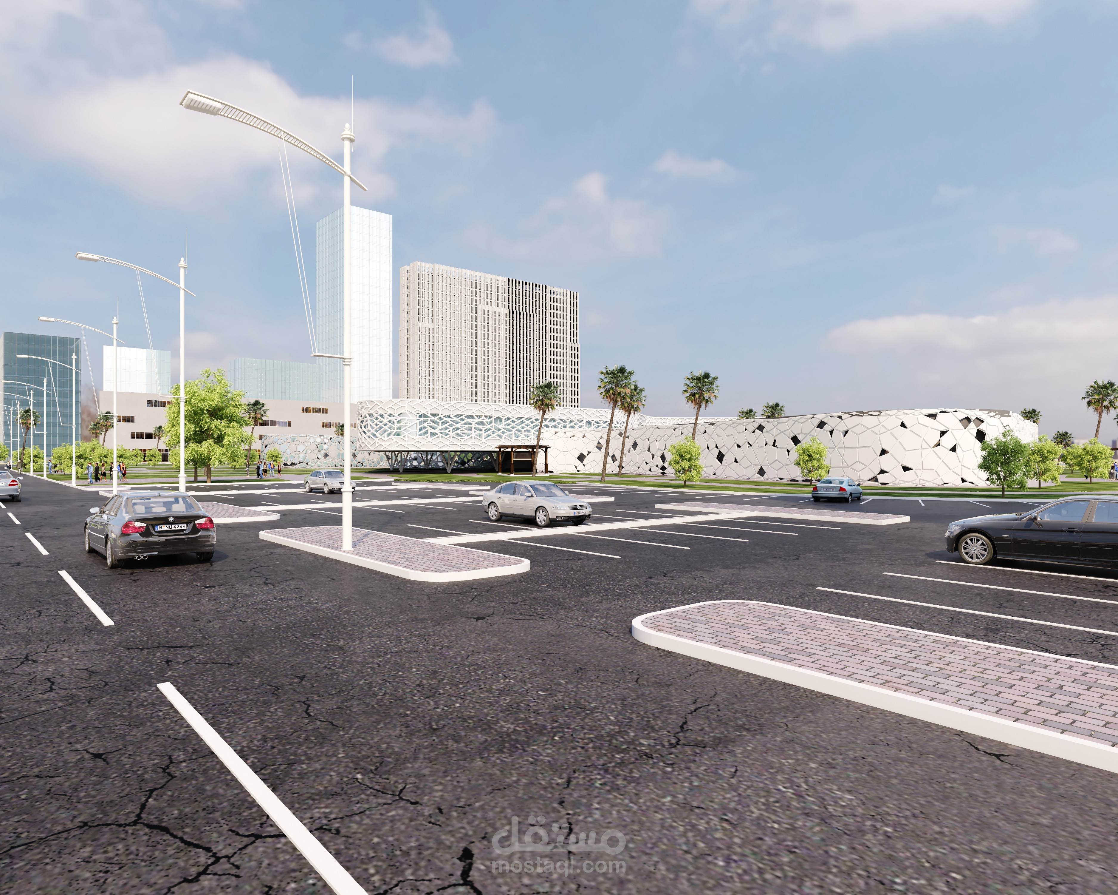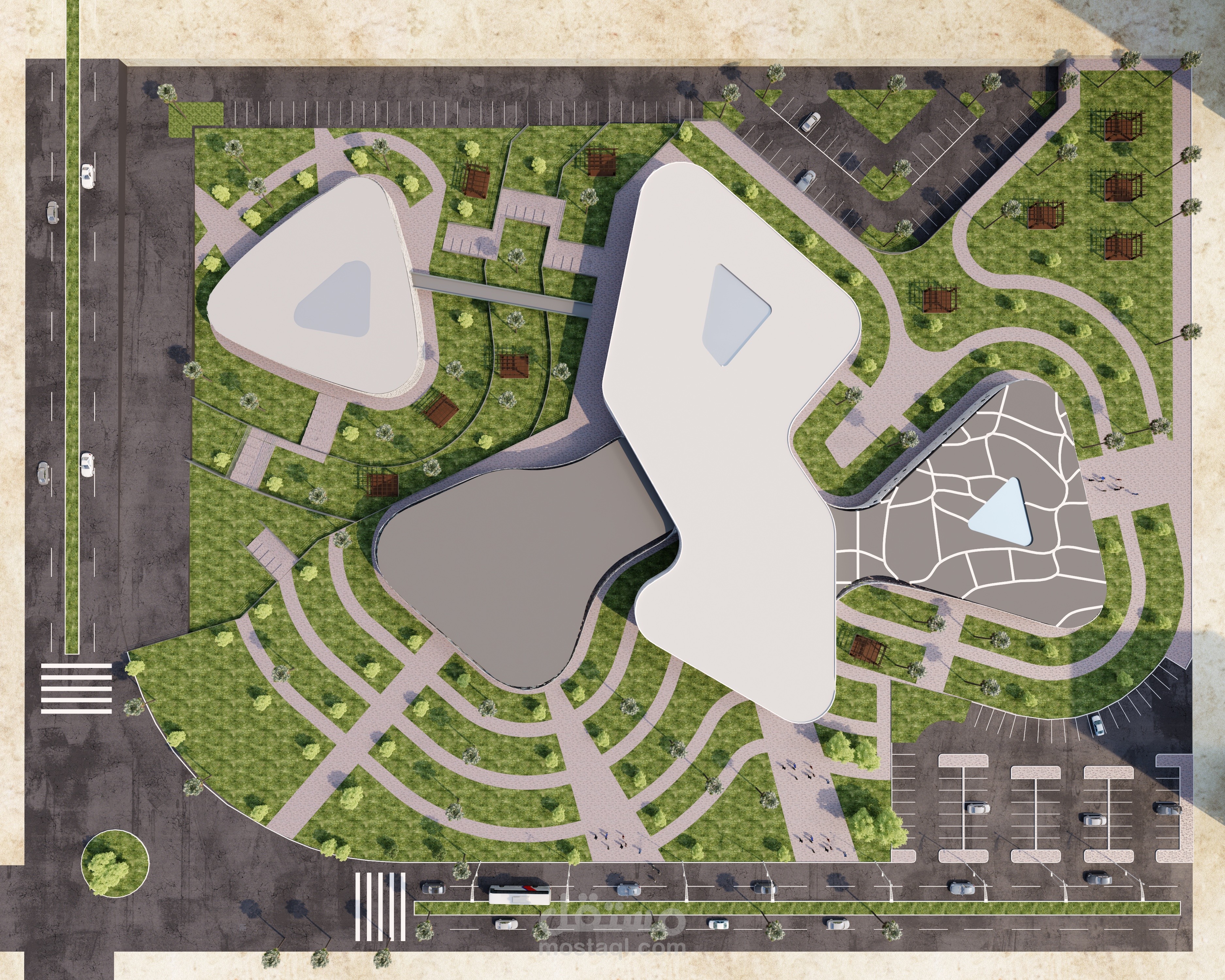 - Making gradations in treating the levels and exploiting them as a plaza, places to sit and umbrellas to cover from the sun’s rays