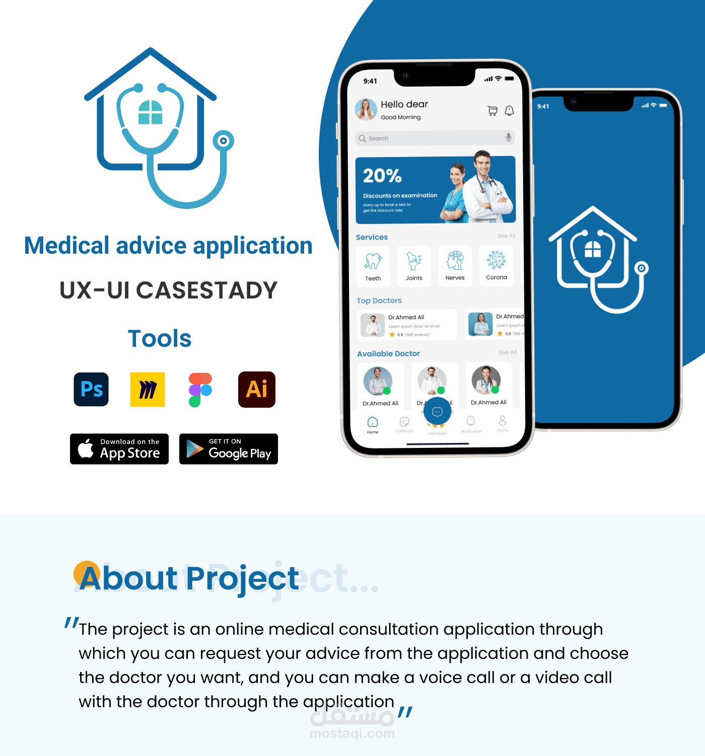 المشروع عبارة عن تطبيق استشارة طبية عبر الإنترنت يمكنك من خلاله طلب نصيحتك من التطبيق واختيار الطبيب الذي تريده ، ويمكنك إجراء مكالمة صوتية أو مكالمة فيديو مع الطبيب من خلال التطبيق