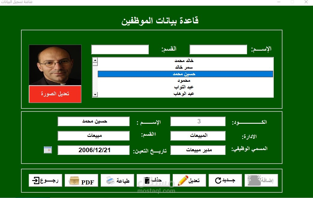 الاسم - الادارة - القسم - المسمى الوظيفي - تاريخ التعين - الصورة الشخصية