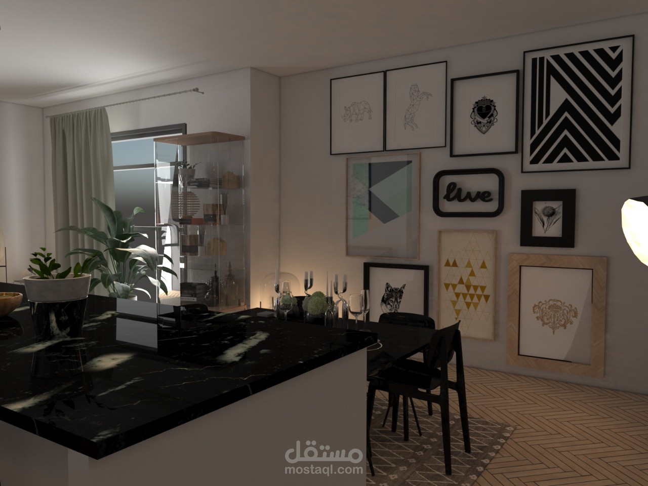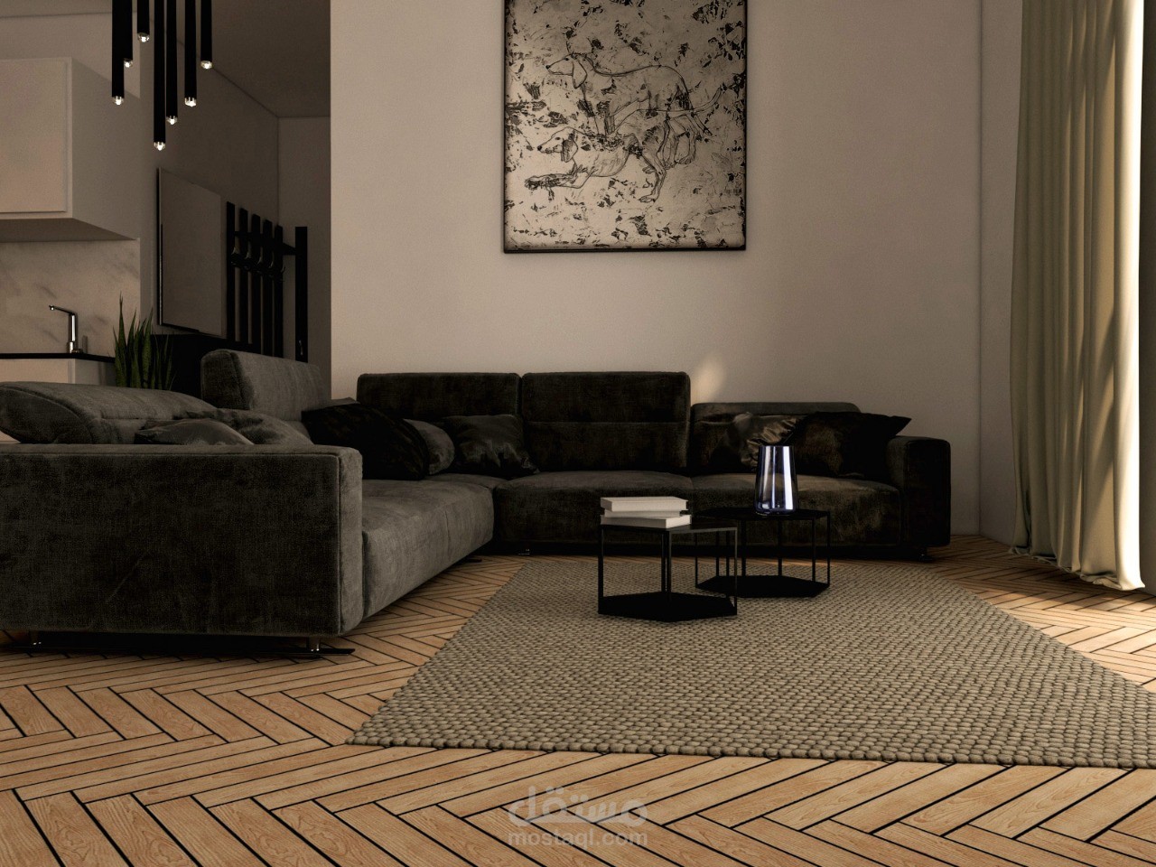 او محاولة تصميم في برنامج 3Dmaxمعالجة فراغ غرفة جلوس ومطبخ