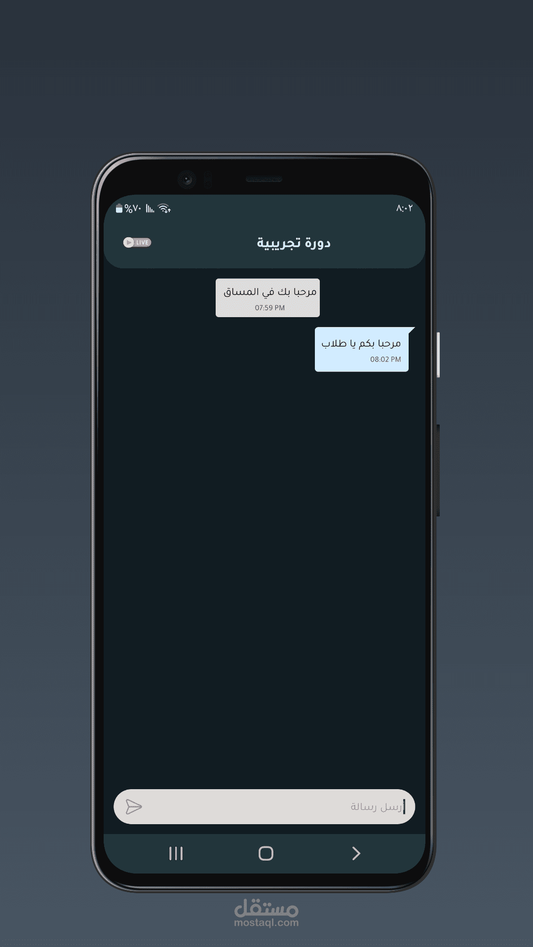 يوفر التطبيق محادثة نصية بأسلوب النص وأسلوب المحاضرة المباشر مع