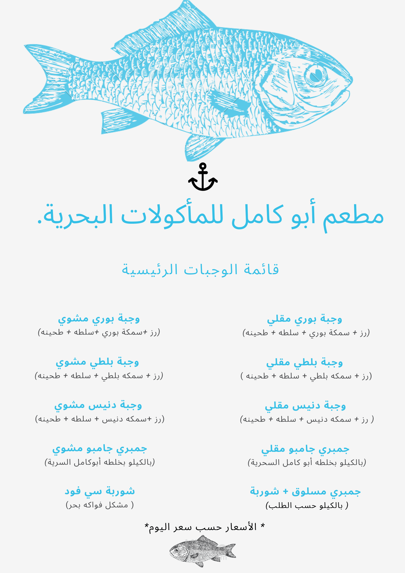 - قائمة طعام مطعم مأكولات بحريه