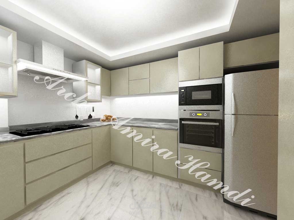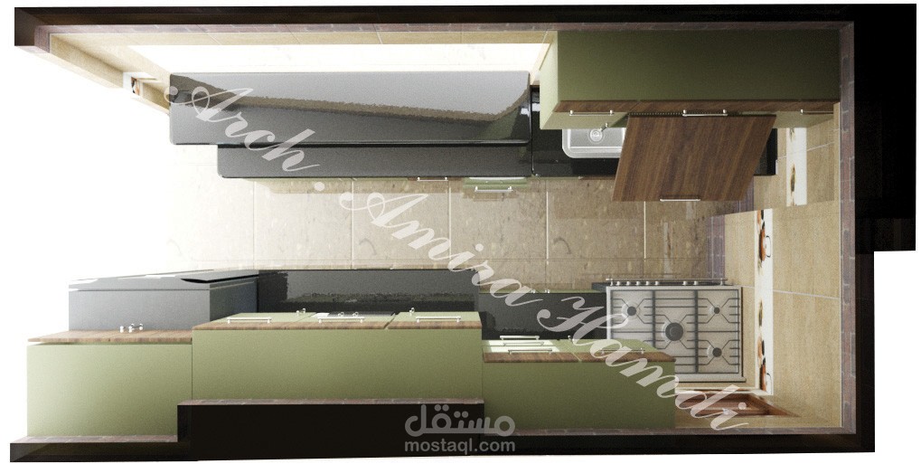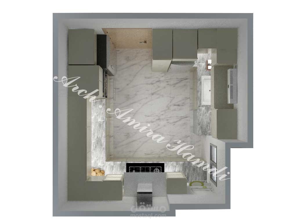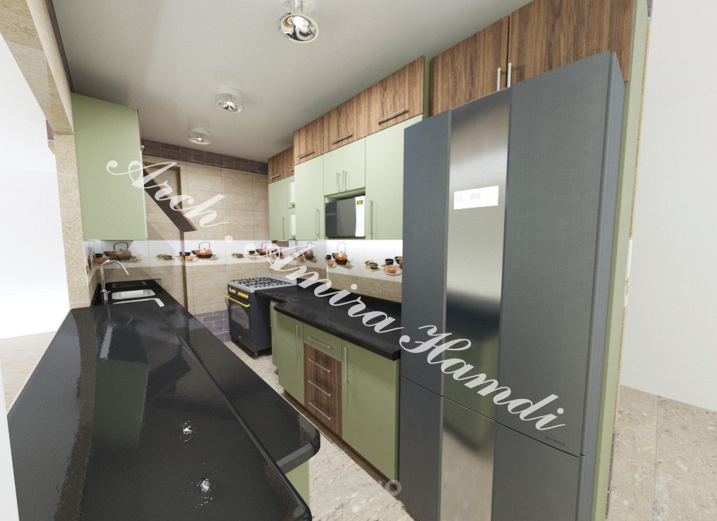 طلب العميل مطبخ مودرن بالوان عصريه .. تم تصميم المطبخ والأستغلال الجيد للحيز لتوفير مساحات جيده للتحزين وتوفير الراحه للعمل بالمطبخ بدون الاحساس بضيق الحيز