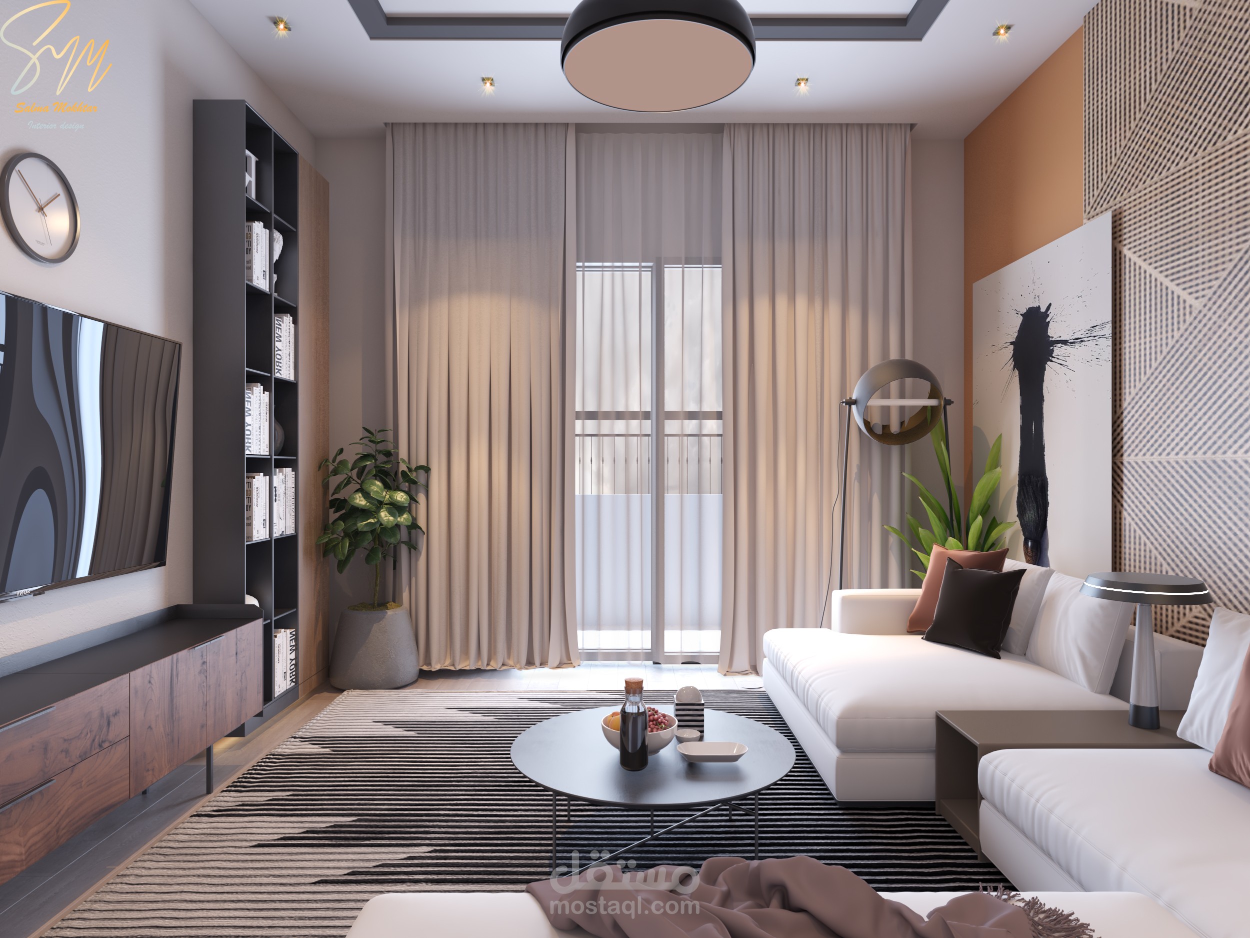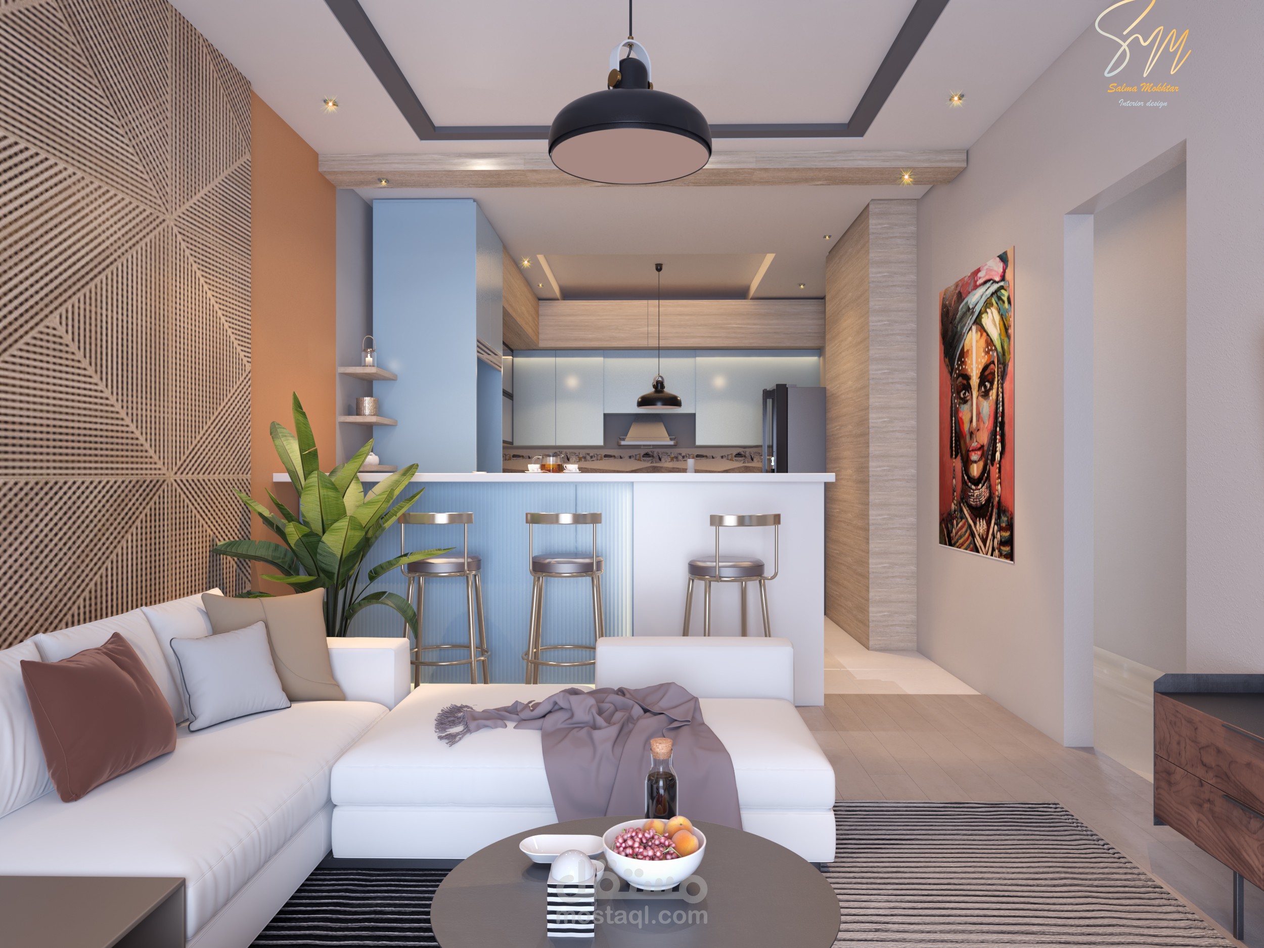 A living room contains pleasant colors that are comfortable to the eye, and there is an open kitchen that facilitates the