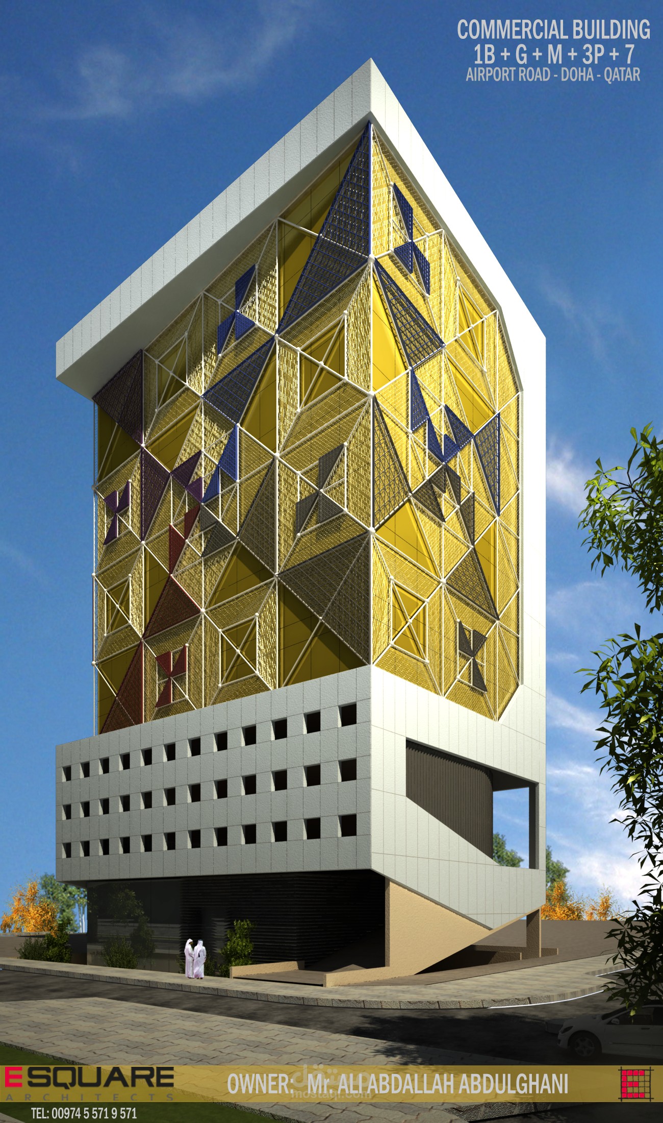 مكون من ( قبو + طابق أرضي + طابق فني + ثلاثة مناسيب كراجات طابقية + سبع طوابق متكررة مكاتب متعددة الاستعمال )