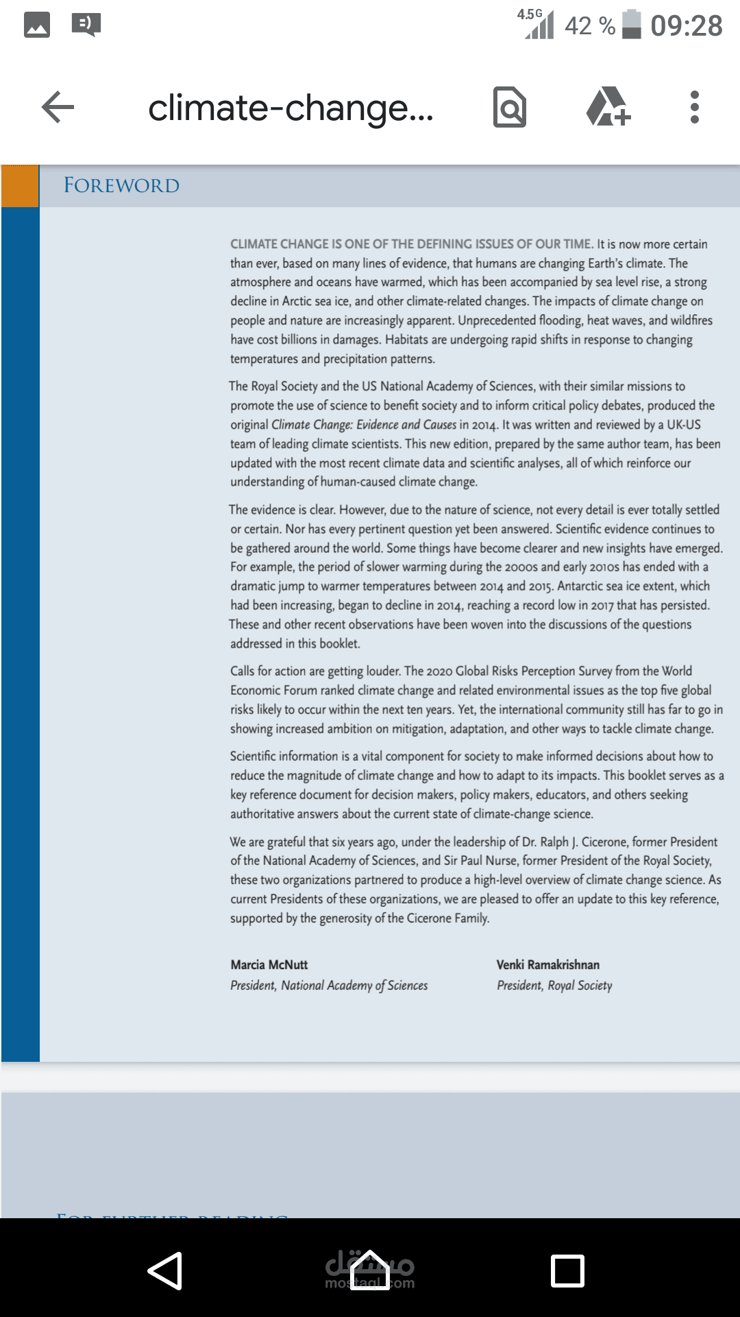 Change/Evidence and Causes الى العربيه تحت عنوان :تغير المناخ/حقيقة وأسباب.نظرة عامة من الجمعية الملكية والأكاديمية الوطنية الأمريكية للعلوم.يحتوي على 36 صفحة.