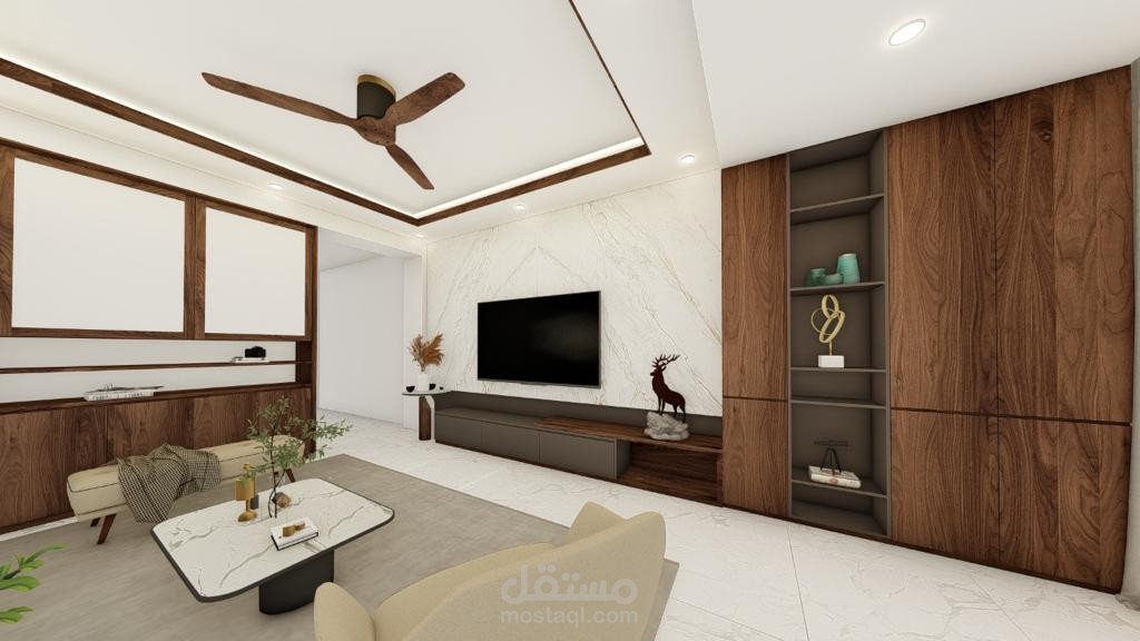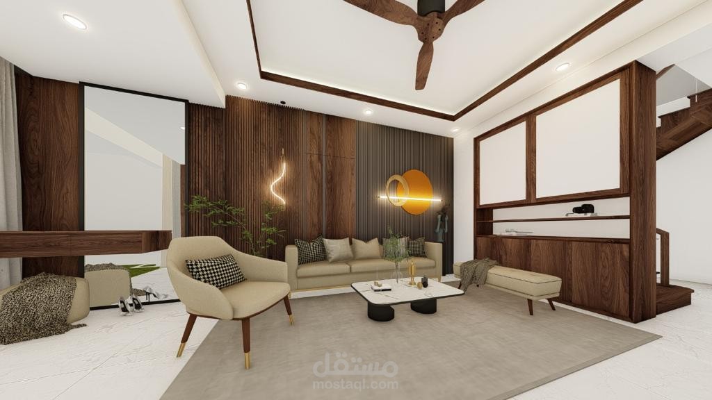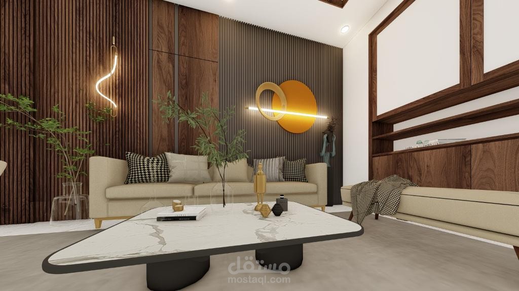 تصميم صالة ضيوف مع استخدام الخشب بكثرة