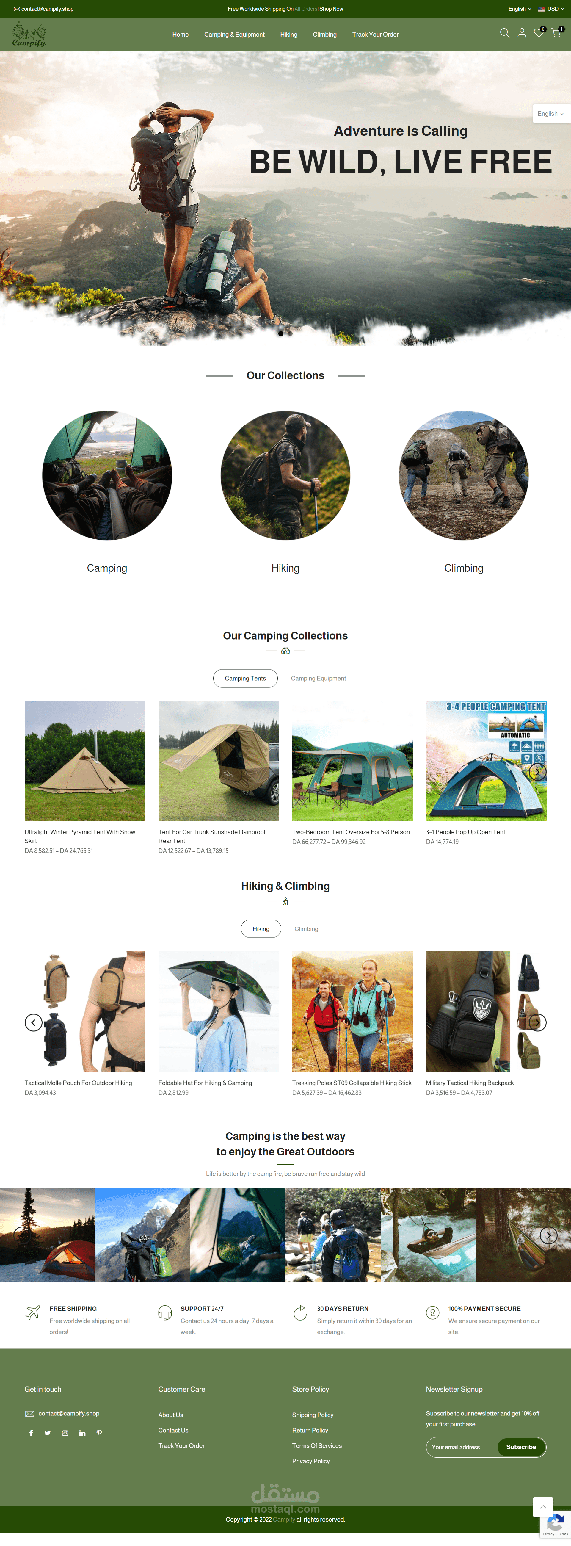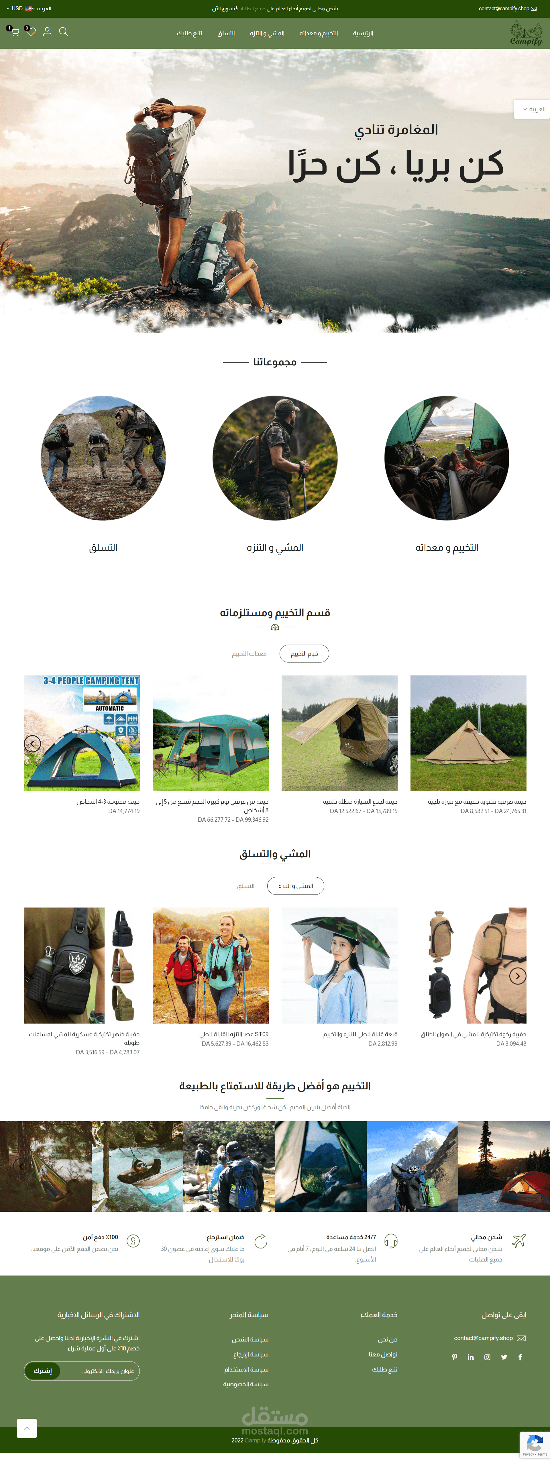 تم إنشاء هذا المتجر الإحترافي على منصة شوبيفاي Shopify، يختص المتجر ببيع معدات التخييم ويتوفر باللغتين العربية و الإنجليزية وقد تم برمجته لتغيير اللغة بطريقة آلية حسب لغة المتصفح بالإضافة توفير إمكانية التغيير اليدوي سواء للغة أو العملة.