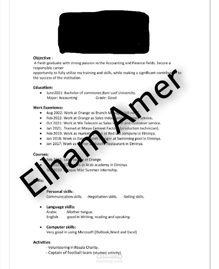 كتابة السيرة الذاتية للتقديم على الوظائف بصورة احترافية، تحصل عليها ملف ورد وملف pdf، ما عليك هو تزويدي بالبيانات الخاصة بك، و انجازاتك، و مهاراتك