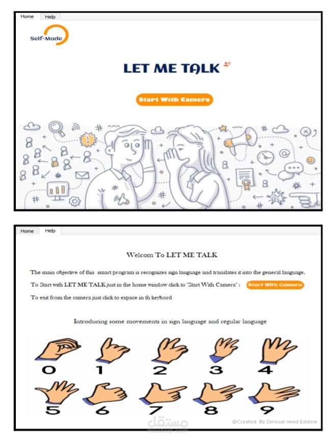 برنامج يسمح للصم والبكم بالتكلم عن طريق ترجمة لغة الاشارة الى لغة العادية ، كنموذج اولي يمكن للبرنامج التعرف على الارقام من 0 الى 9 .