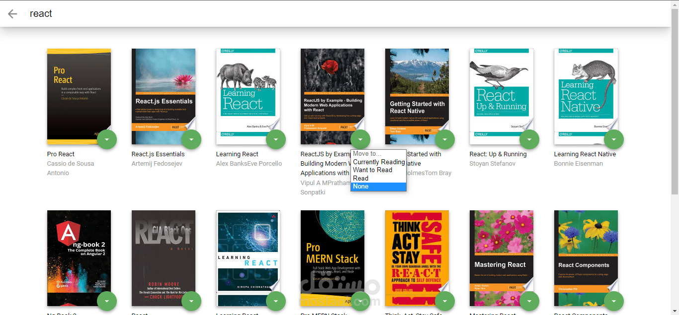 In this app, you can search between hundreds of books and if you found something that you like you can add it to on of three shelves (currentlyReading, WantToRead, Read), and if you finished reading it or don't want it anymore you can remove it by click on none. After adding the book to any of the shelves the state will be updated immediately so if you forgot and searched for the same book you will find it added before.