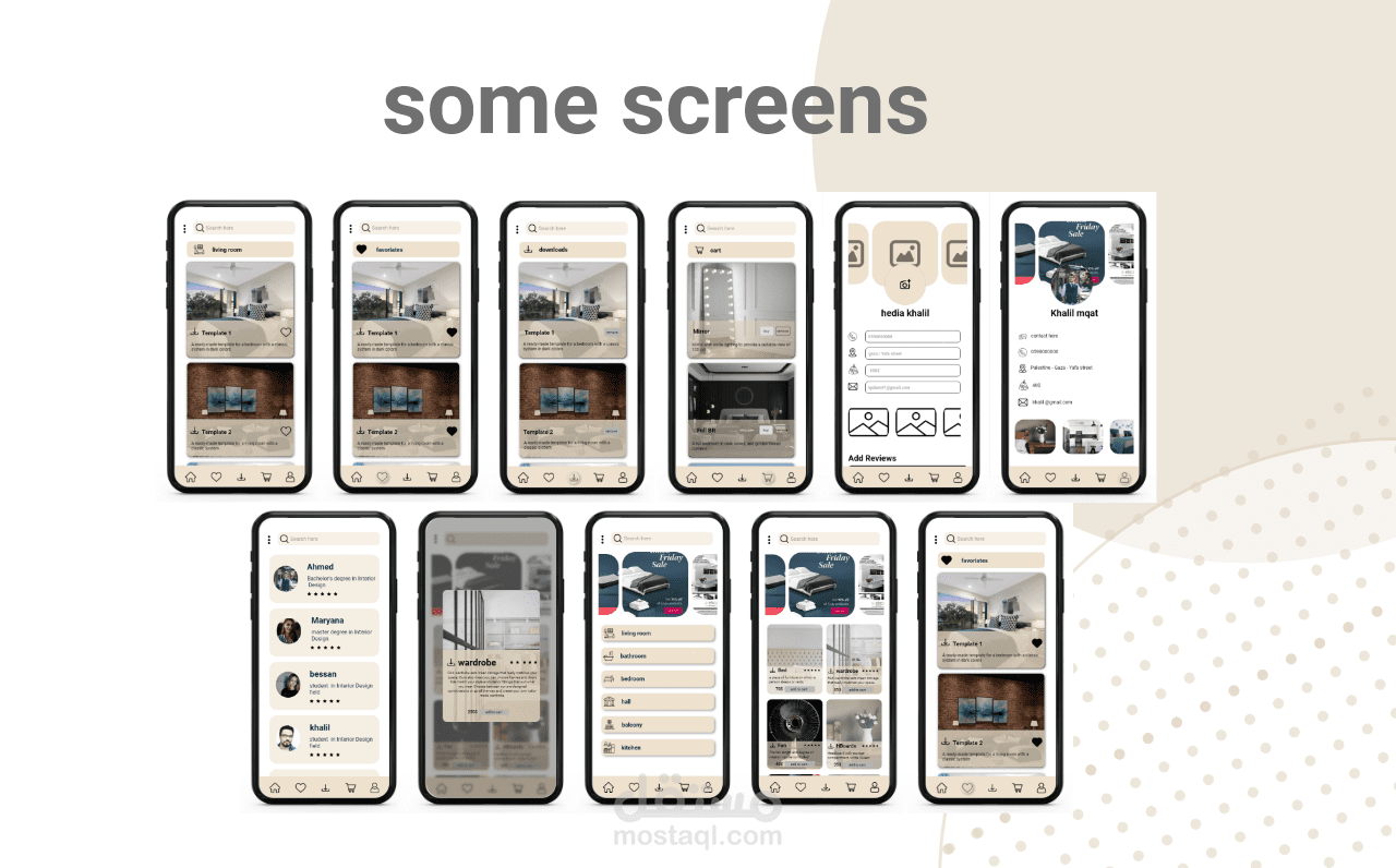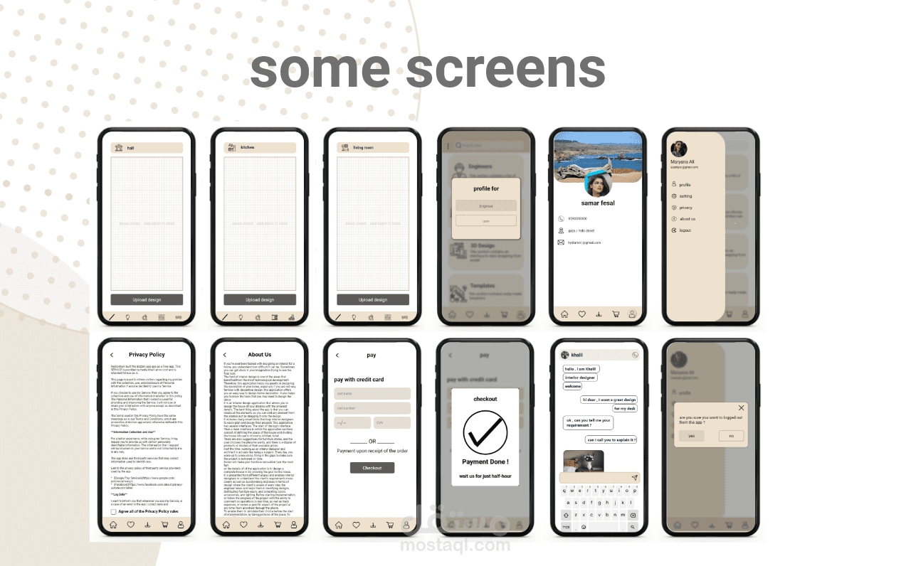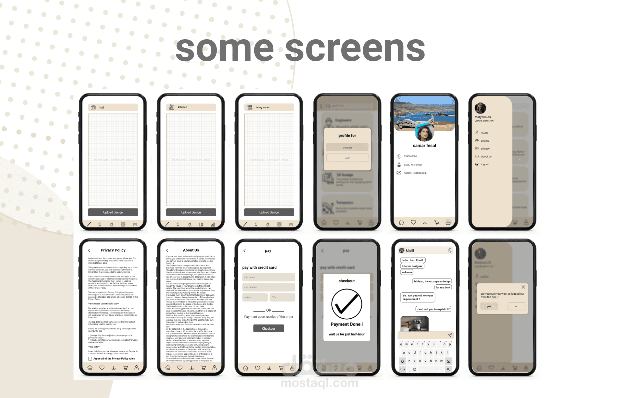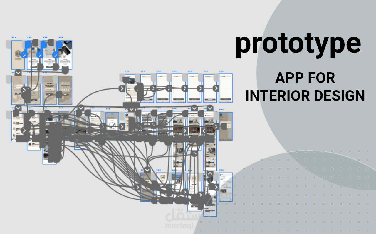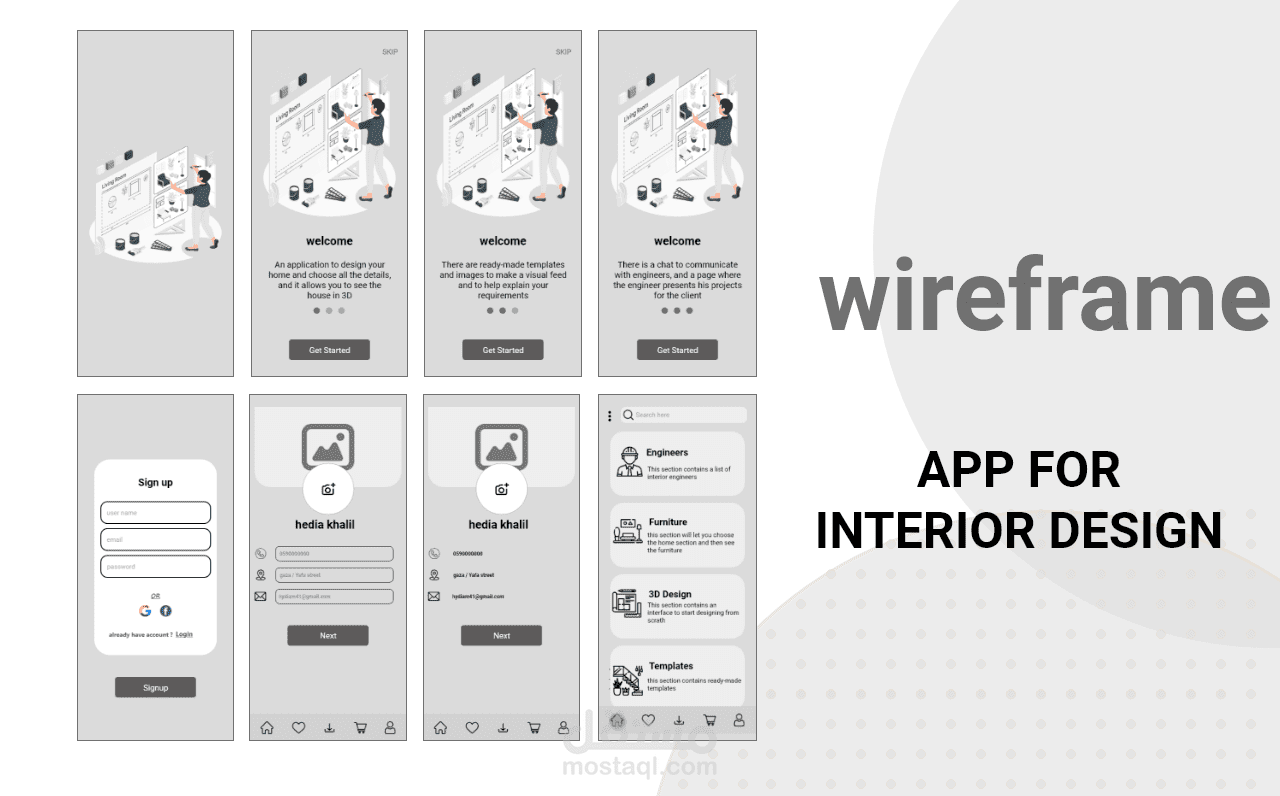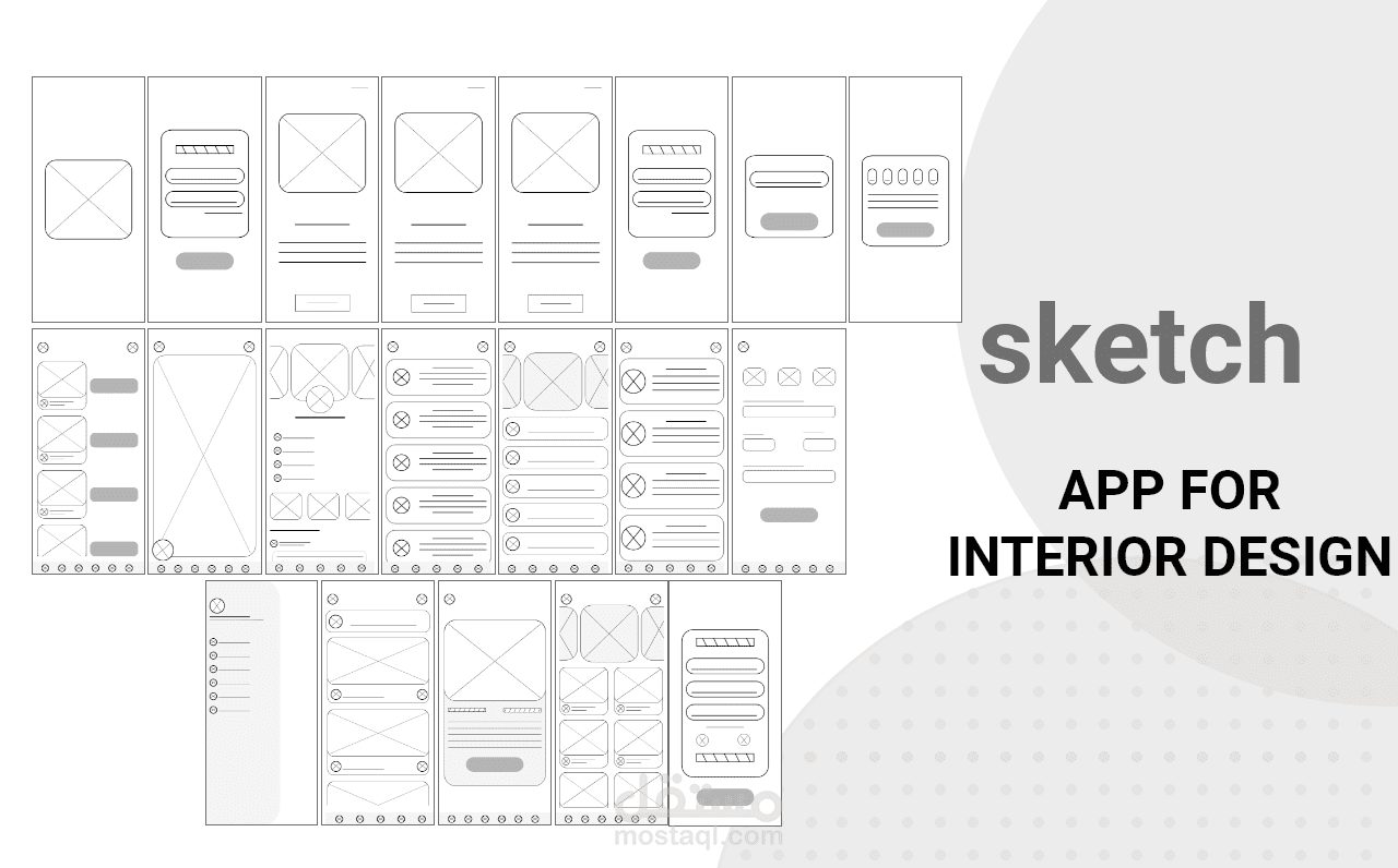 واجهة مستخدم لتطبيق للتصميم الداخلي , بداية تم انشاء ال sketch ثم ال wire frame بمرحلتيه "low & high fidelity" ثم ال UI وخلال العملية تم اتباع قواعد التصميم المتفق عليها عالميا واستخدام الألوان الأنسب لنوع التطبيق , وفي النهاية تم انشاء ال prototype , لنتمكن من الانتقال بين واجهات التطبيق باستخدام الارتباطات فيما بينها