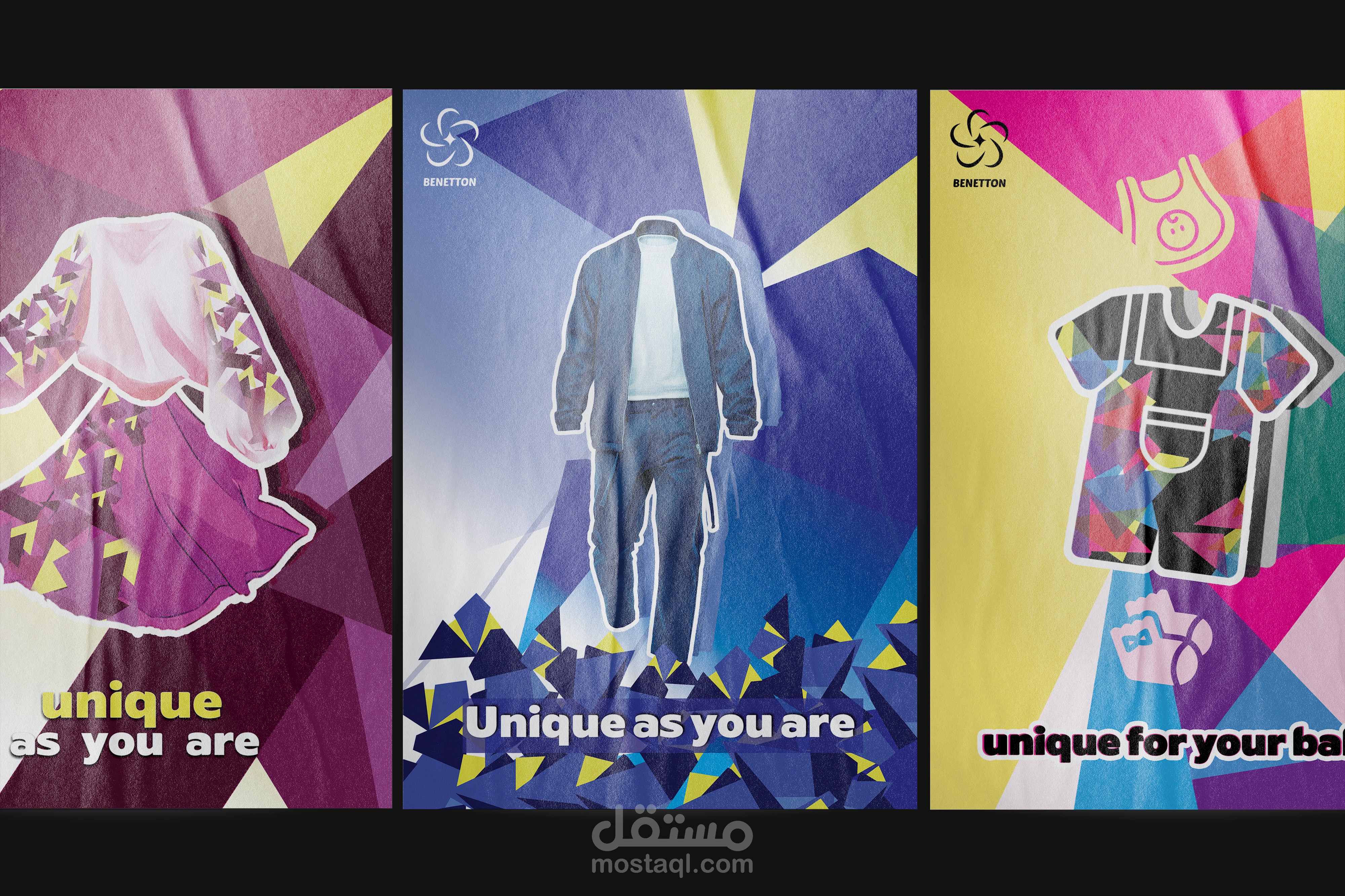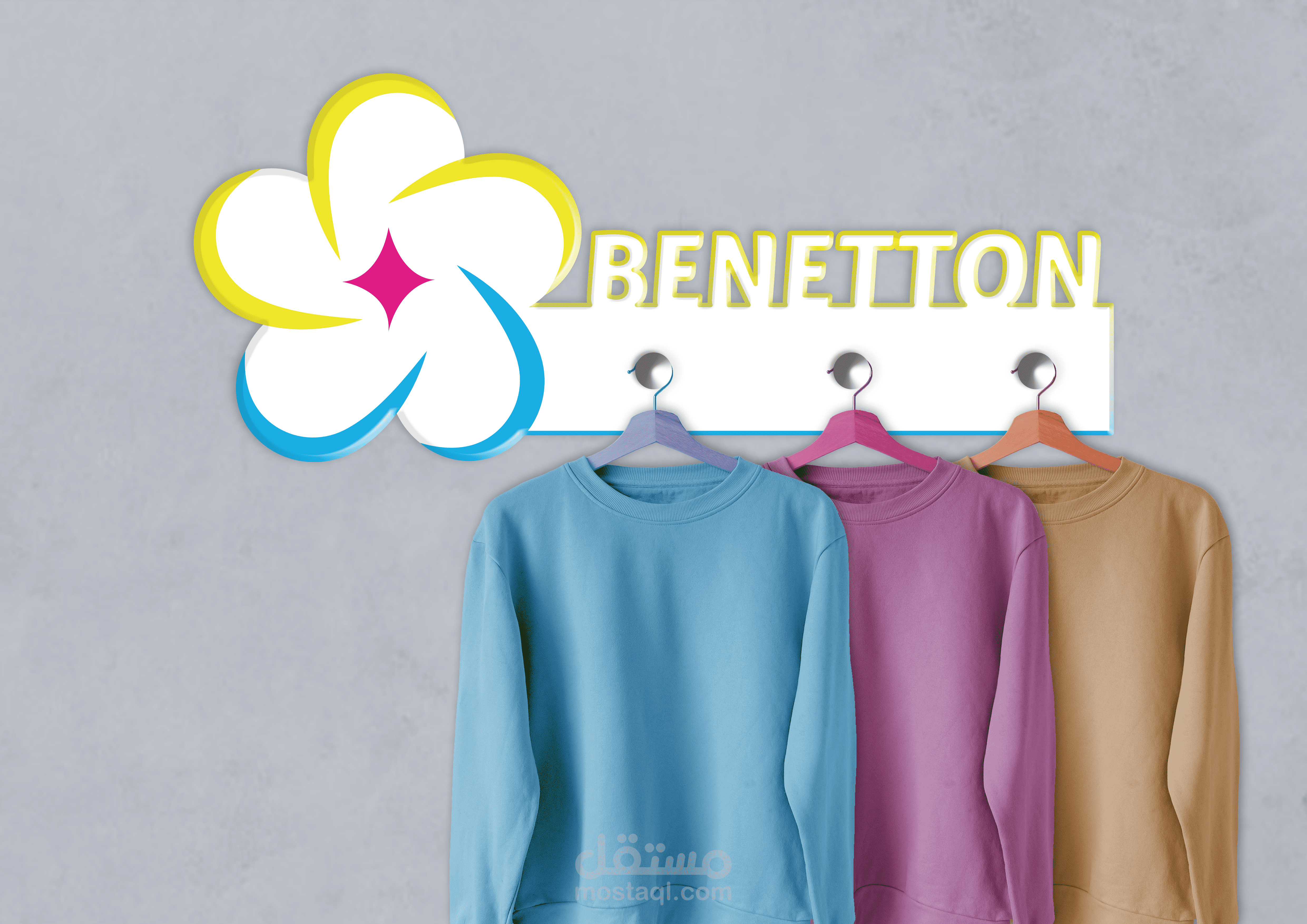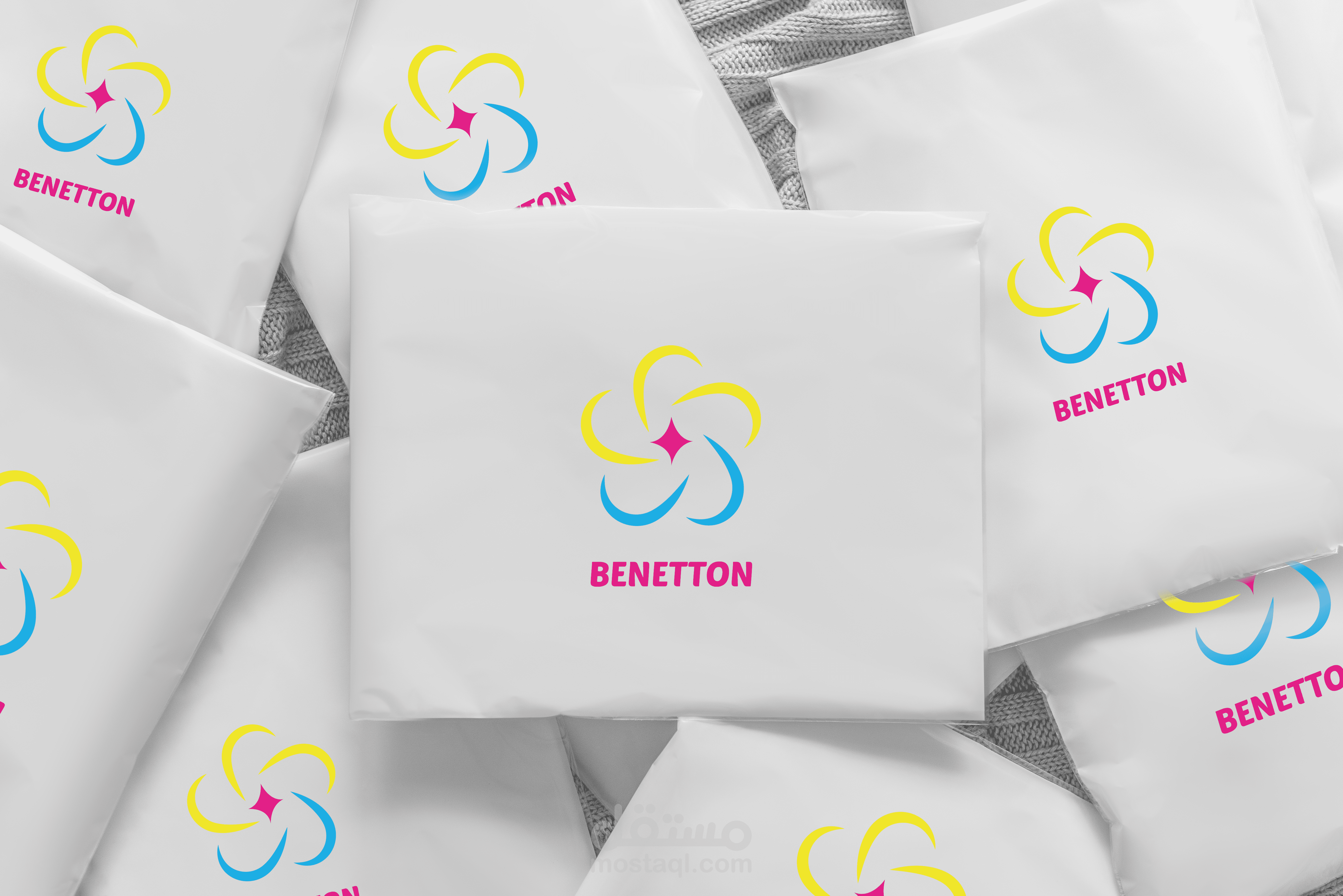 مشروع تصميم شعار و هوية بصرية و بوسترات دعائية و تغليف و تعبئة و مطبوعات ورقية لشركة بينيتون للملابس القطنية المتخصصة في تصنيع ملابس من القطن لجميع الاعمار من الجنسين.