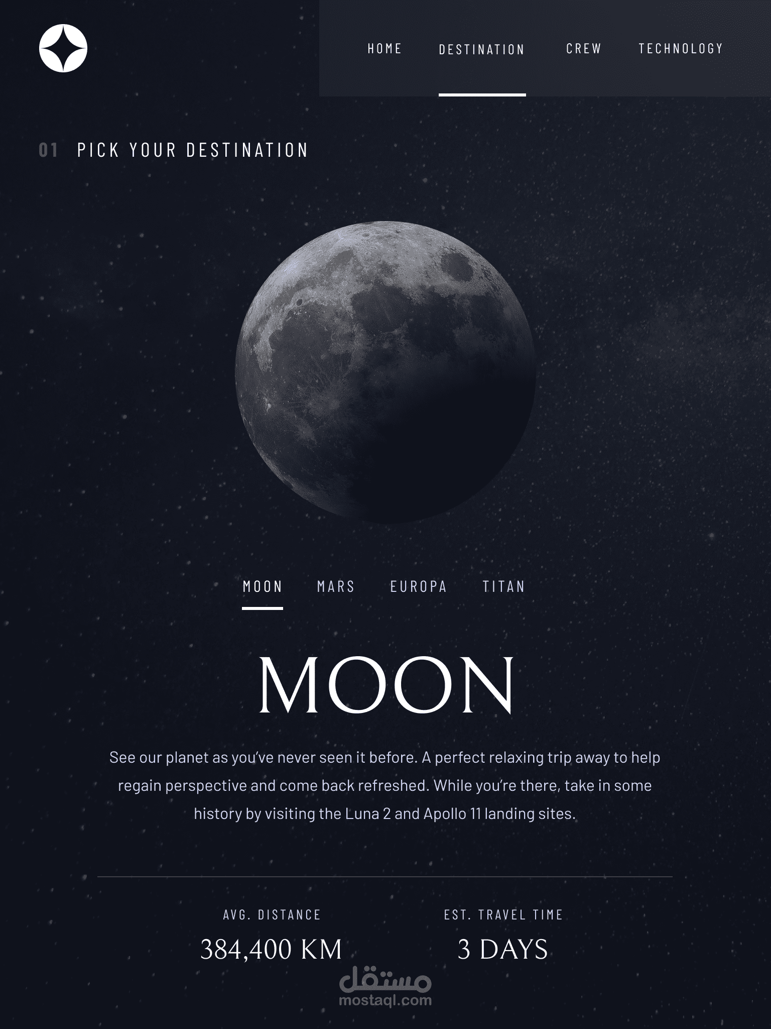 المشروع عبارة عن موقع يخص السياحة الفضائية والمدة الزمنية للوصول إلى كوكب معين وغيرها من المميزات الابداعية والمذهلة لكل محب إلى هذا العالم, فمثلاً يمكنك رؤية مدة سفرك إلى القمر, يعتمد المشروع أيضاً على إطار عمل REACT و على سحب البيانات بشكل DYNAMIC من API جاهز وتم تطويره من أجل هذا المشروع.