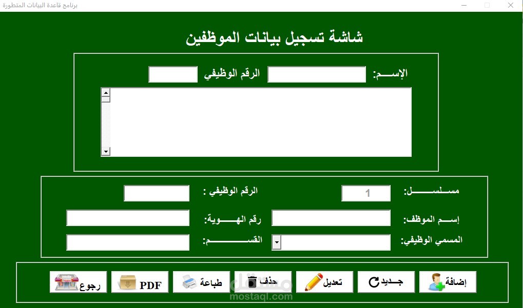 5- شاشة تسجيل بينات الموظف: والتحكم الكامل بها من حيث(( الاضافة- التعديل - البحث - الحذف - الطباعه ))