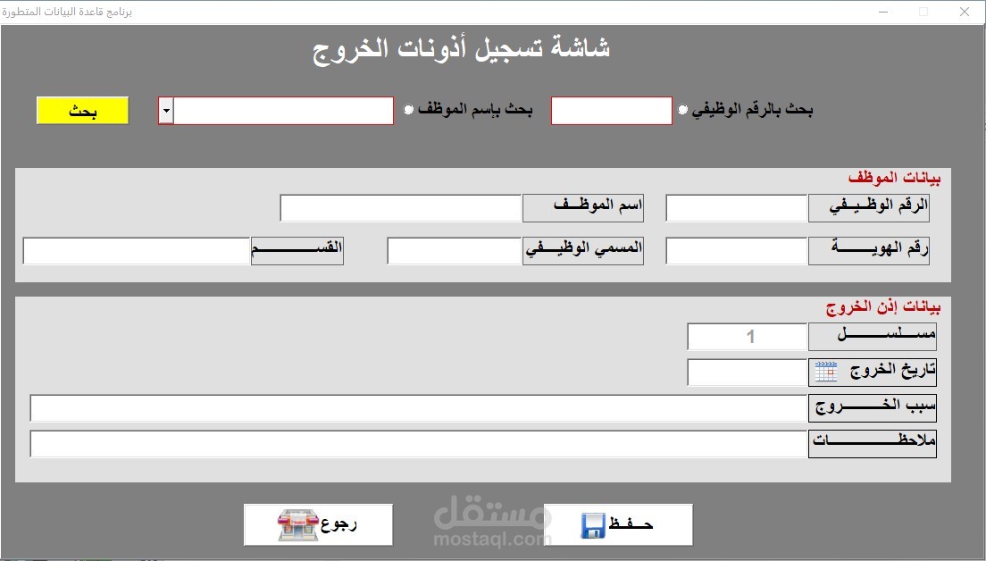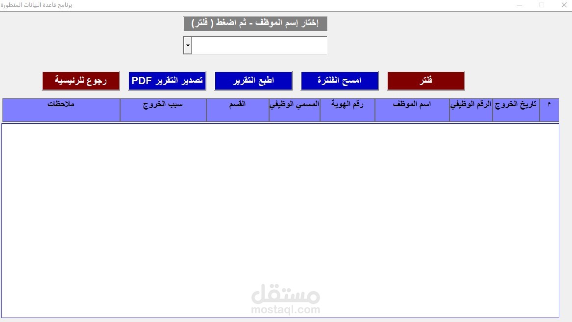 اقدم لكم اليوم برنامج ( قاعدة بينات متطورة ) واستخدامها ((لتسجيل أذونات الخروج للموظفين)) واستخراج التقارير الخاصة بموظف معين او جميع الموظفين.