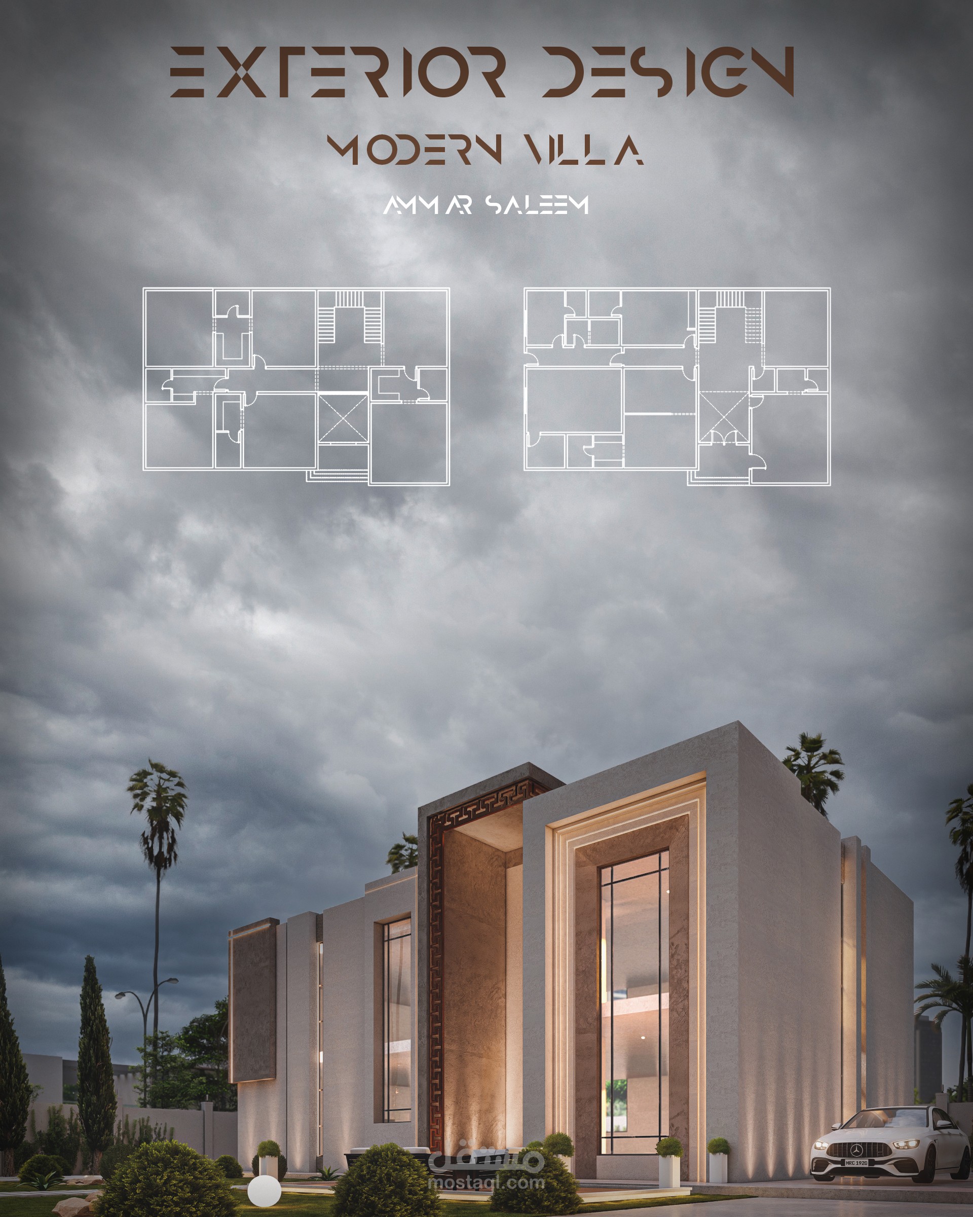 صممت الفيلا بالنمط الحديث البسيط بشكل مميز والوان تحاكي طبيعة مدينة العين مع التركيز على تصميم شكل جمالي منخفض التكلفة في التنفيذ ومواد الإكساء وإبراز جمال التصميم باضاءة خارجية مدروسة توضح تفاصيل التصميم