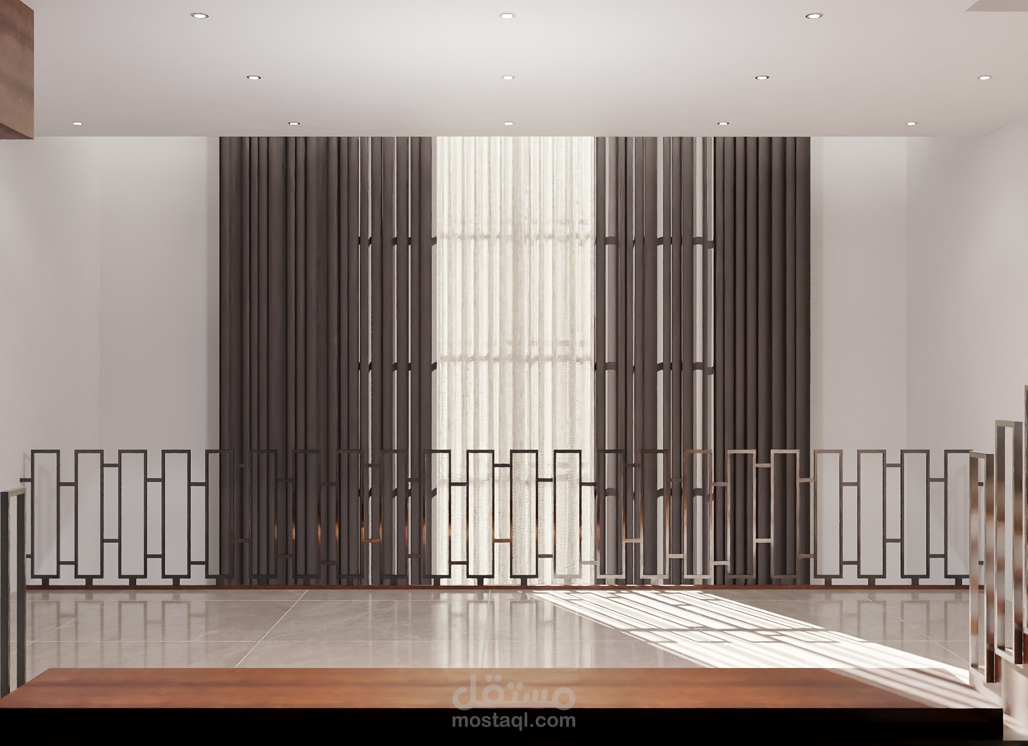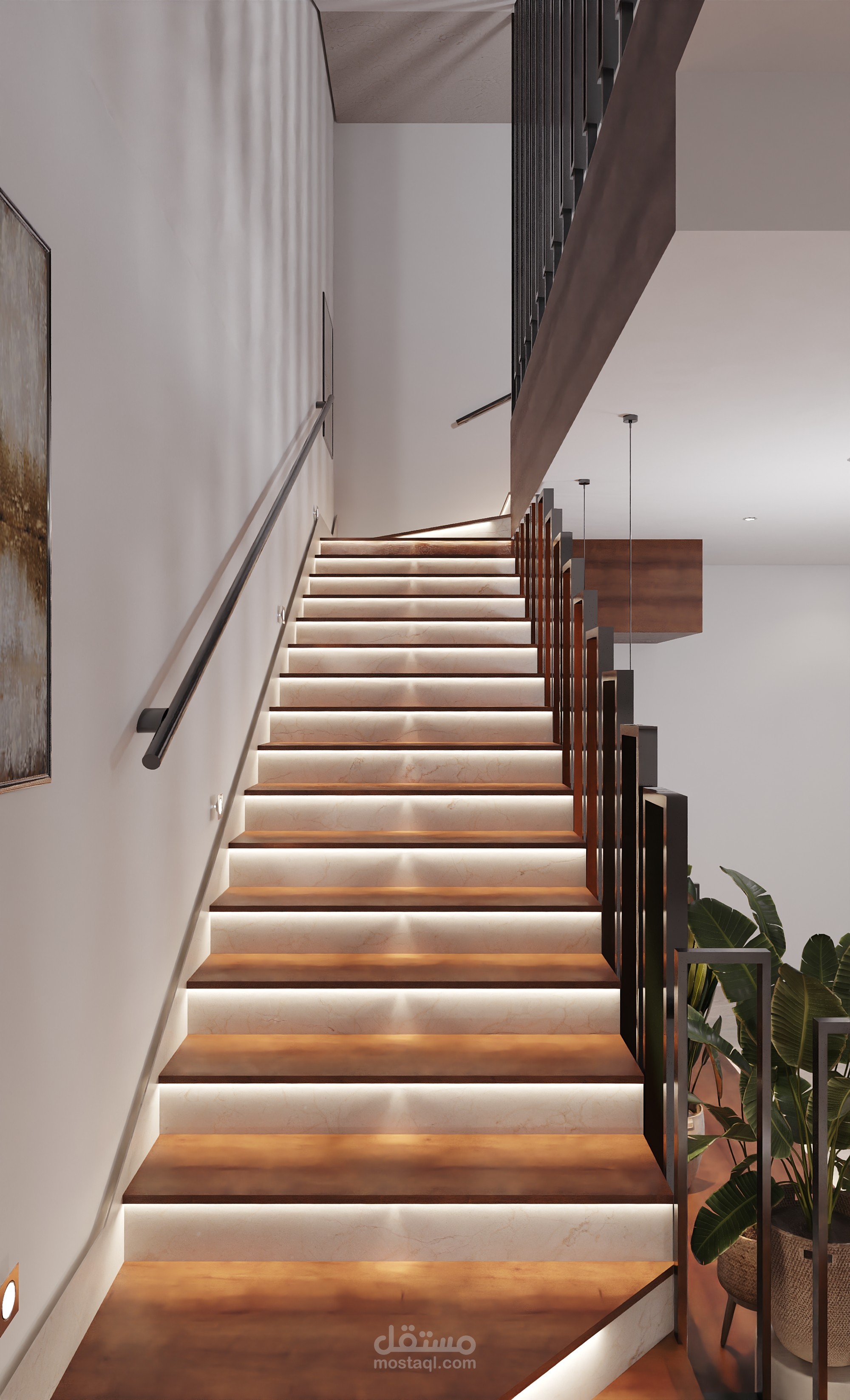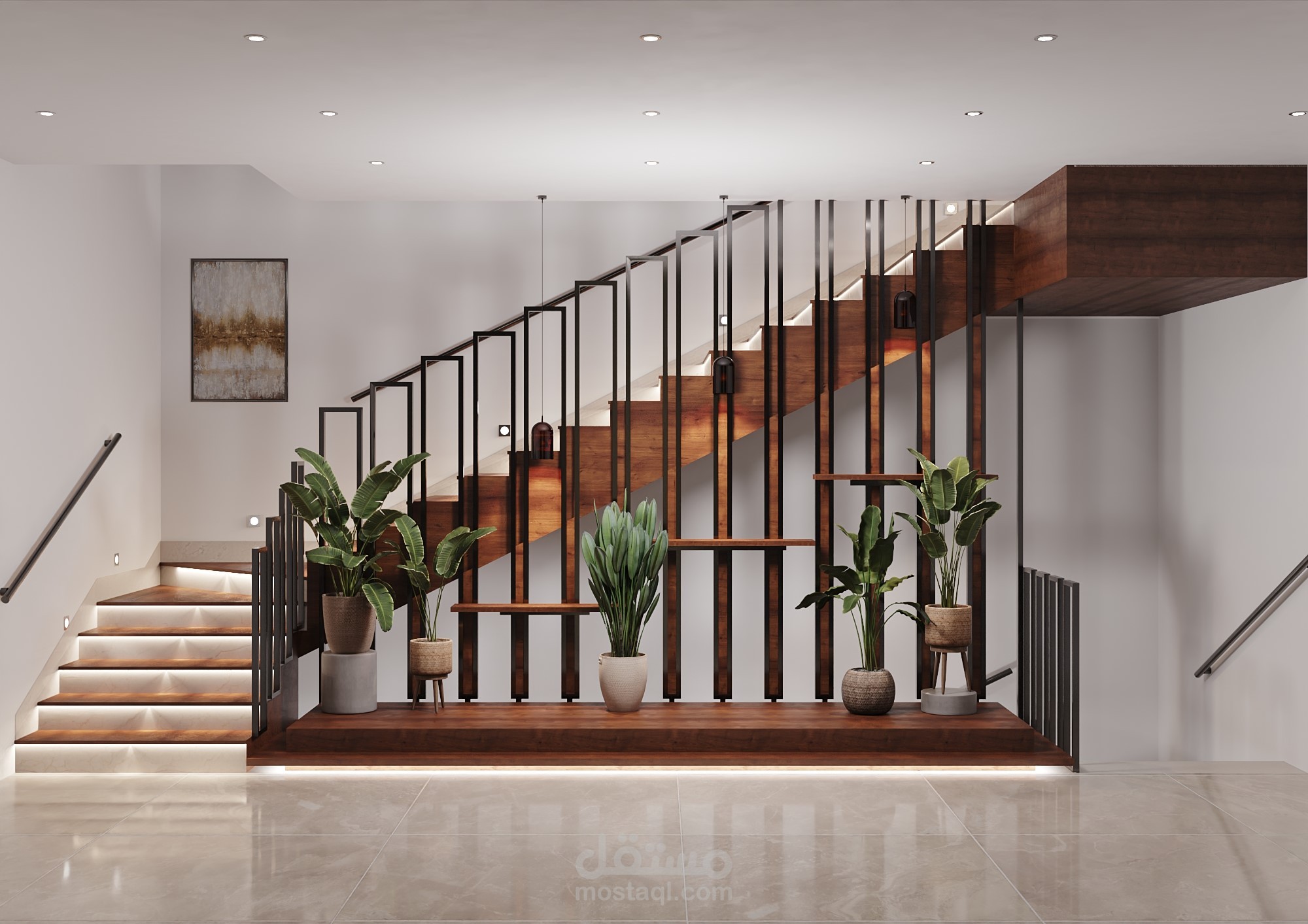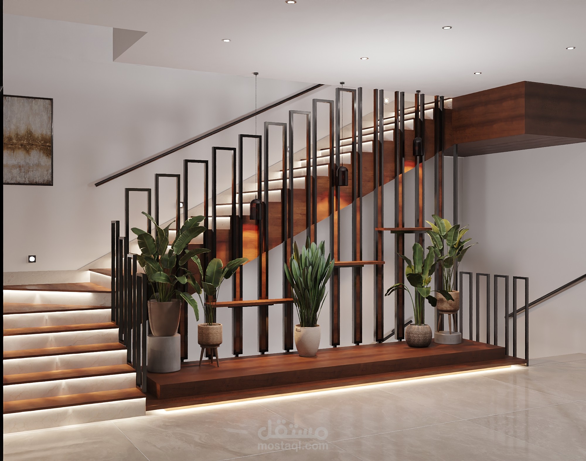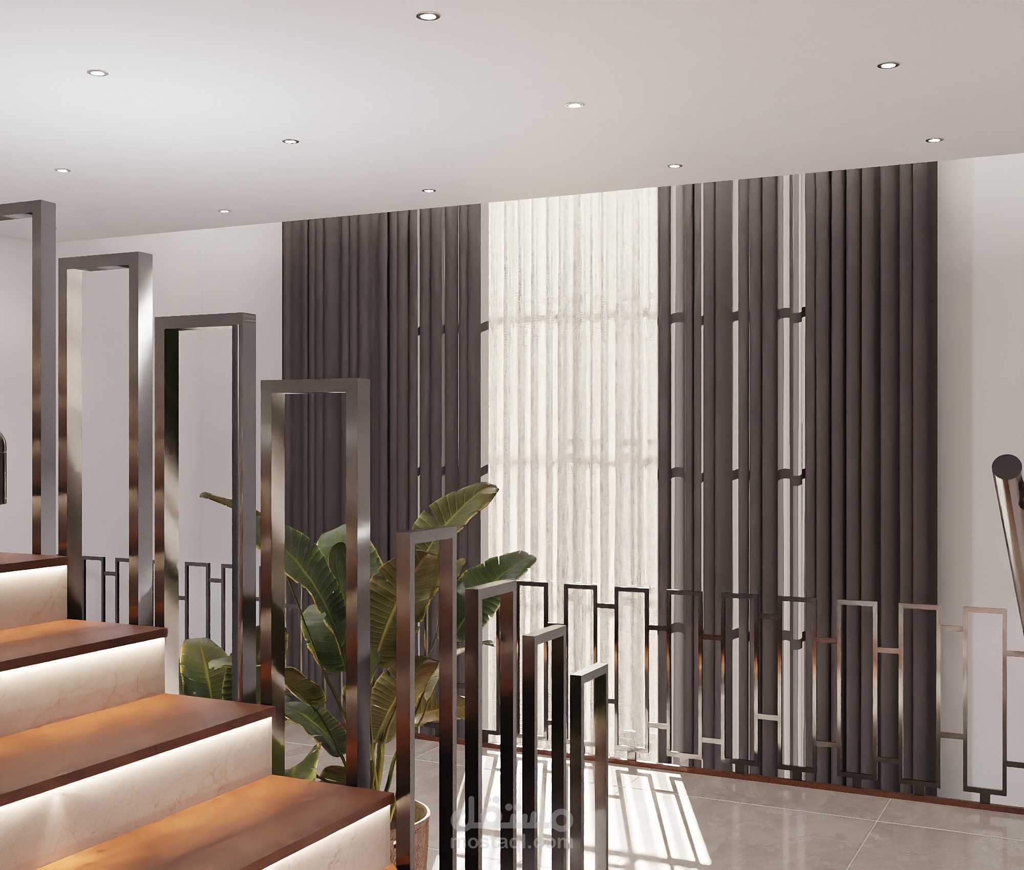 تصميم لدرابزين درج وميزانين غير تقليدي لفيلا في المملكة العربية السعودية