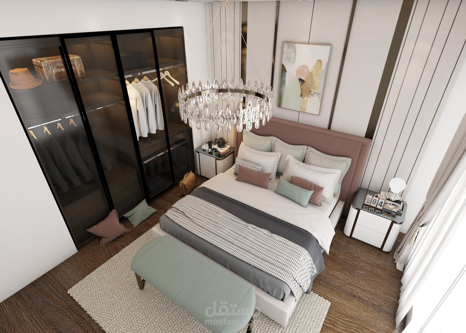 غرفة نوم رئيسية بتصميم عصرى بالوان هادئة