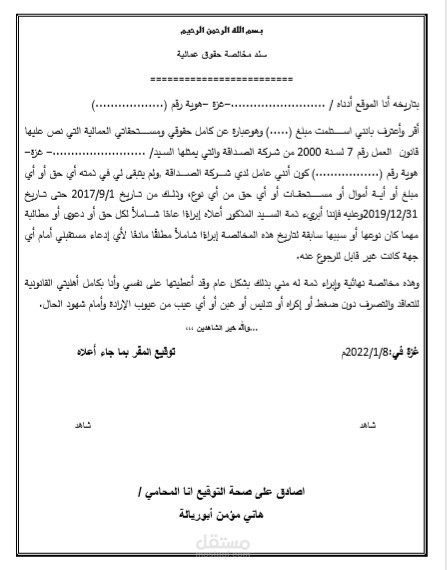 صياغة واعداد سند لمخالصة عمالية بين عامل ورب العمل، تعمل على حماية رب العمل من المطالبة بالمستقبل بالحقوق العمالية من قبل العامل.