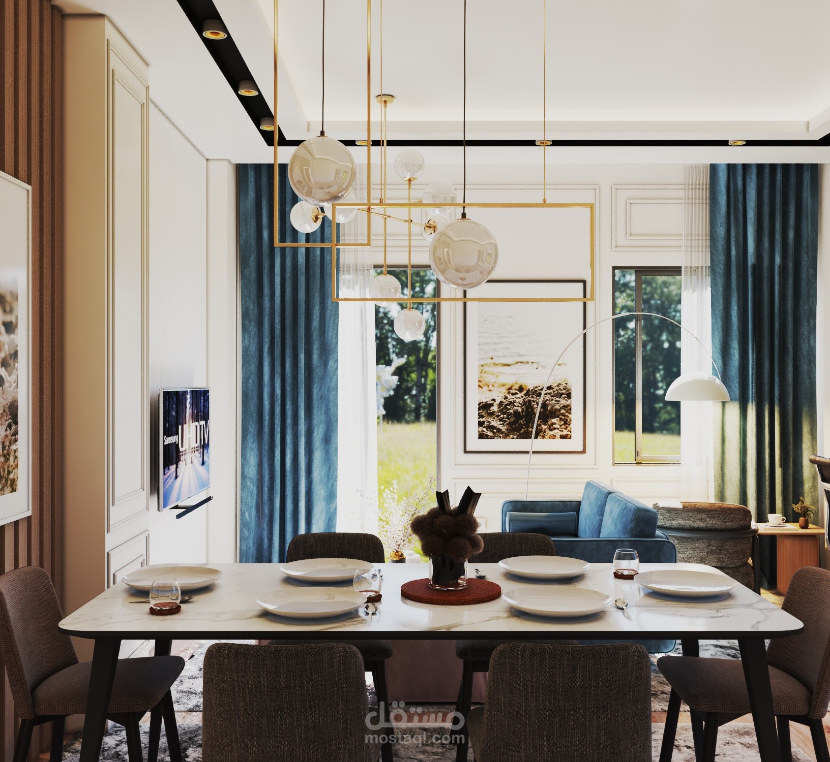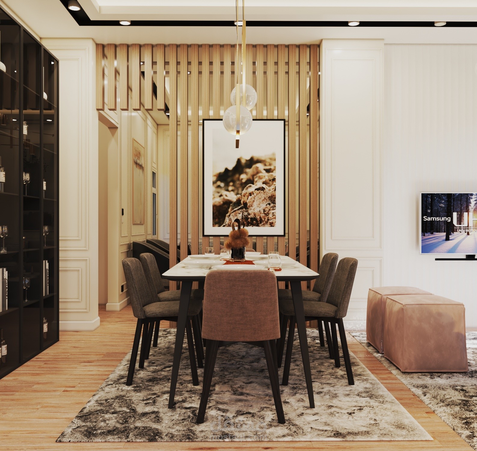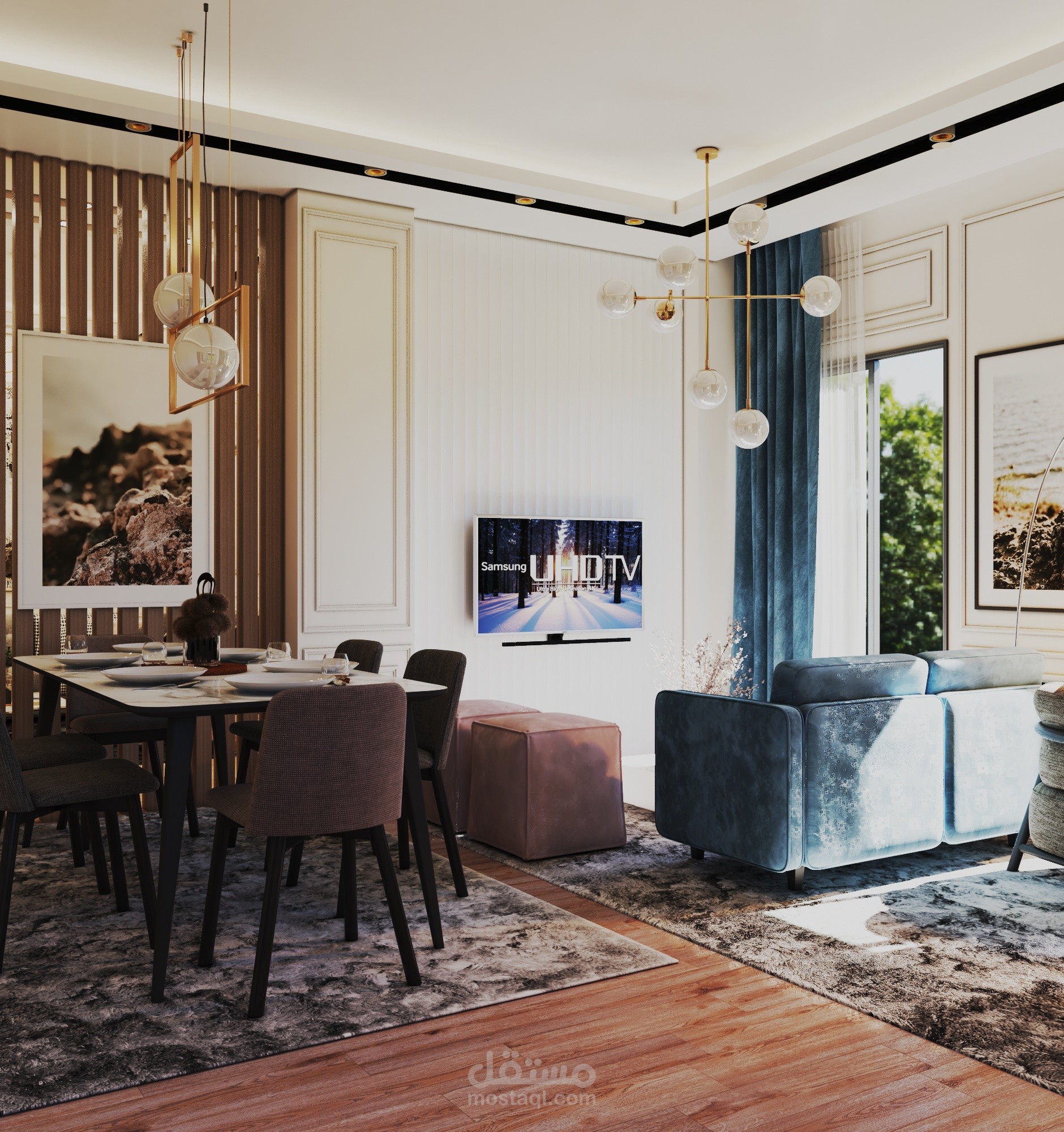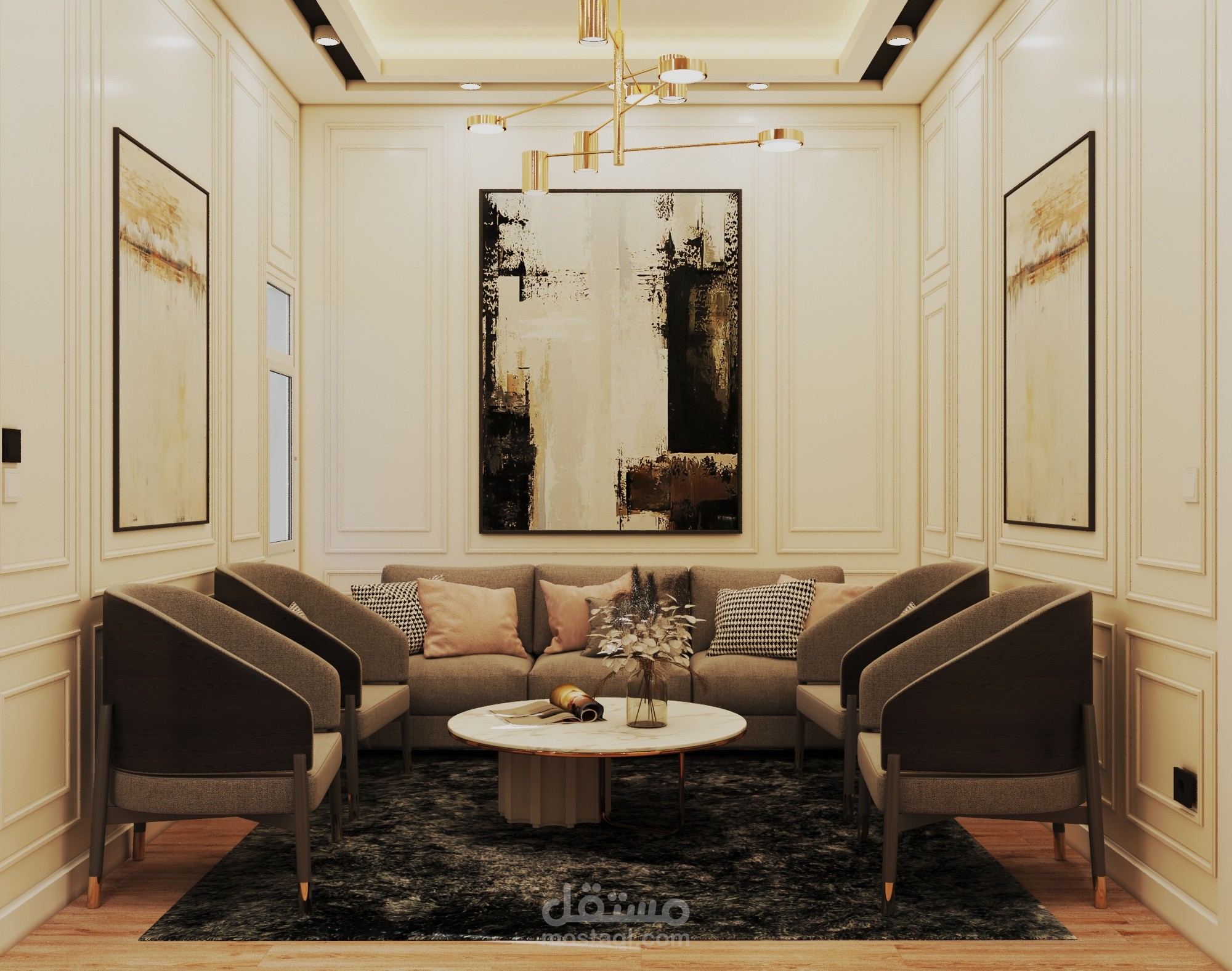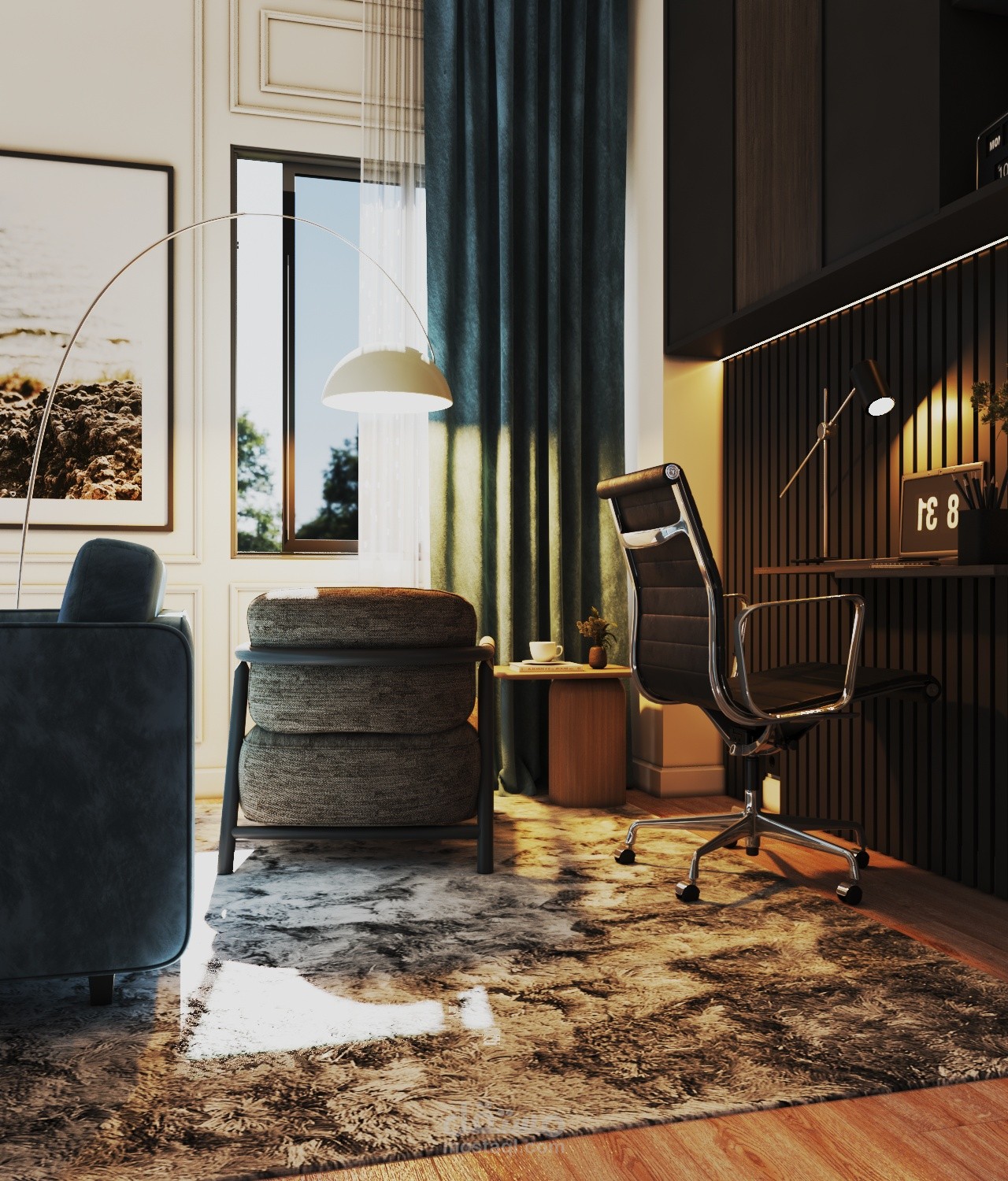 Small apartment (90 sqm) designed in a modern style. The client wanted a sitting area with a TV, a dining area, a desk for online work, and an armchair with a small table for his coffee