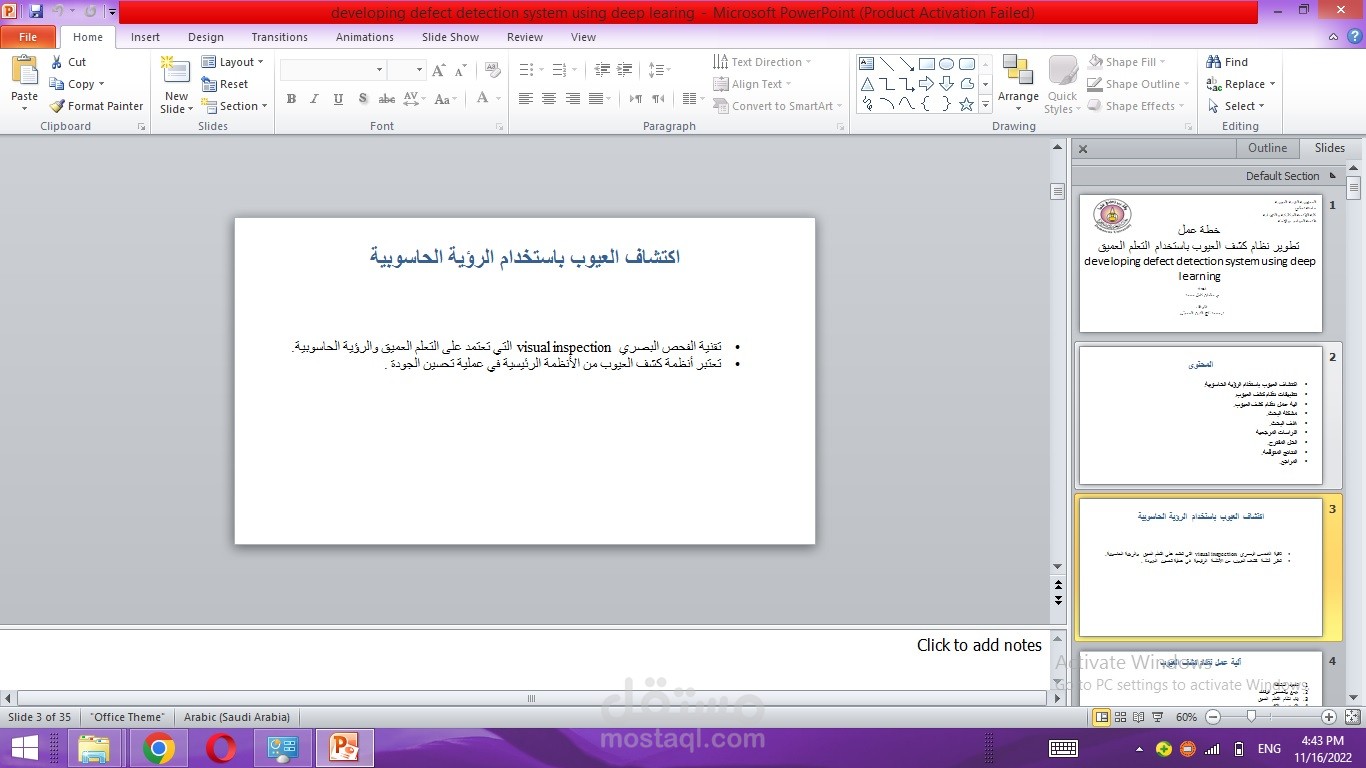 قُمت بتنفيذ عرض تقديمي لمشروعي البحثي في مرحلة الماستر من أجل عرضه على لجنة التحكيم، حيث أن البحث في مجال الذكاء الإصطناعي AI.