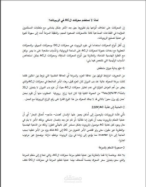 تعتمد الروبوتات بشكل عام في علمها على المحركات الخطوية ومحركات DC مع ضعف استخدام محركات AC في هذا المجال لذلك يتوجب كتابة تقرير لتبيا الأسباب.