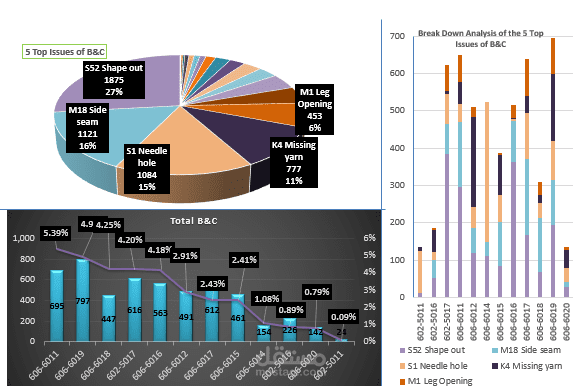 Monthly quality performance for production managers in charge with details of top defects to show them the details of each line defects and how to make corrective action specifically.