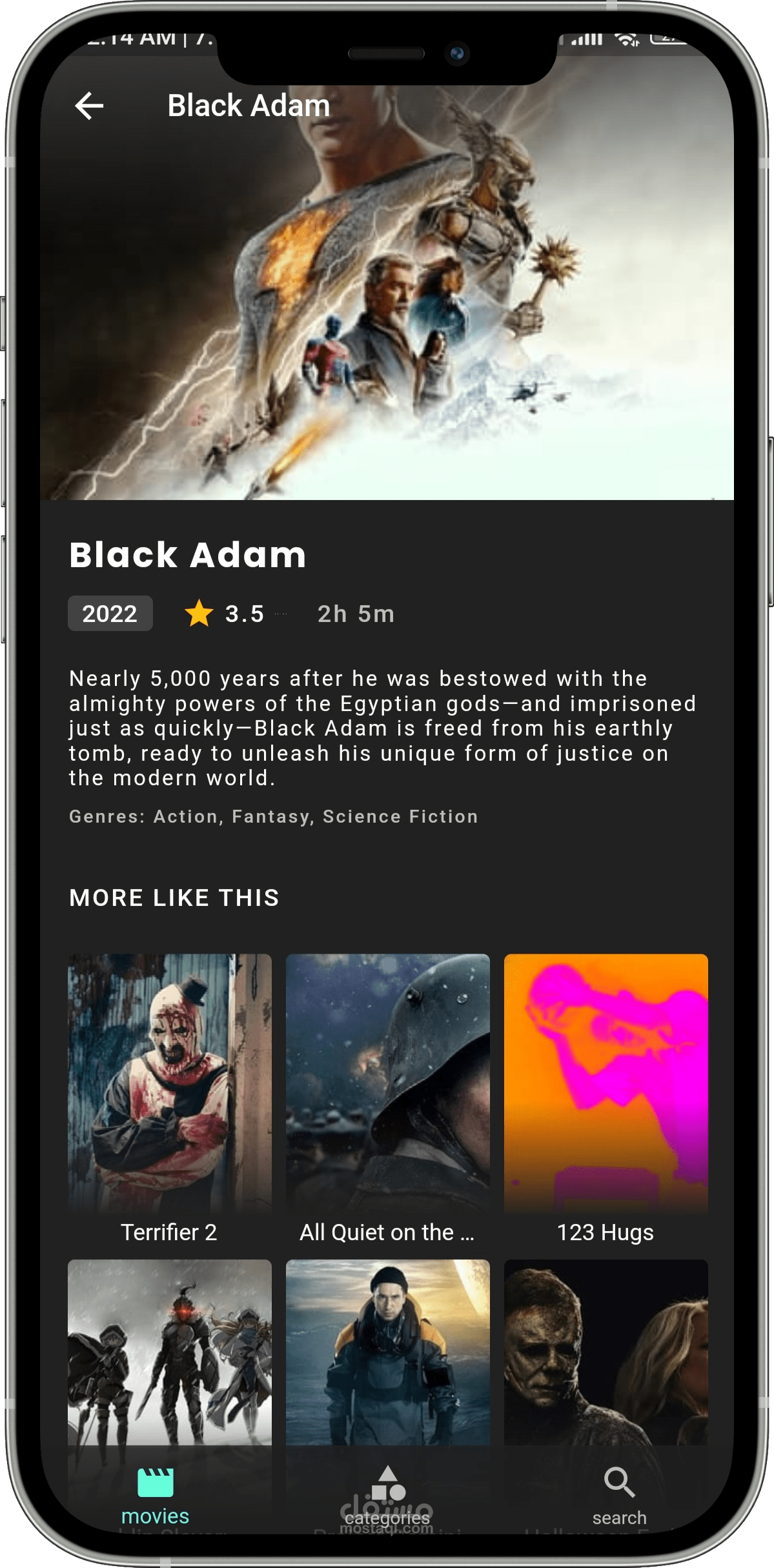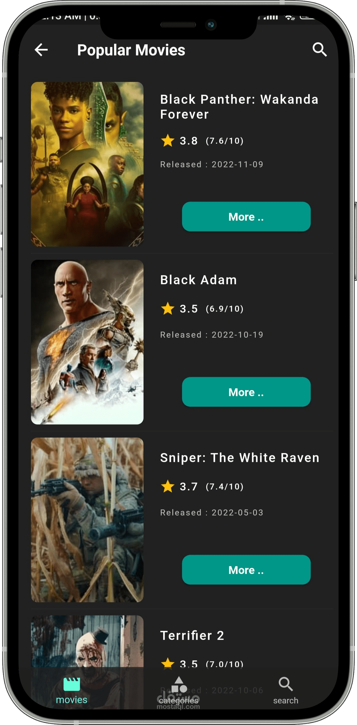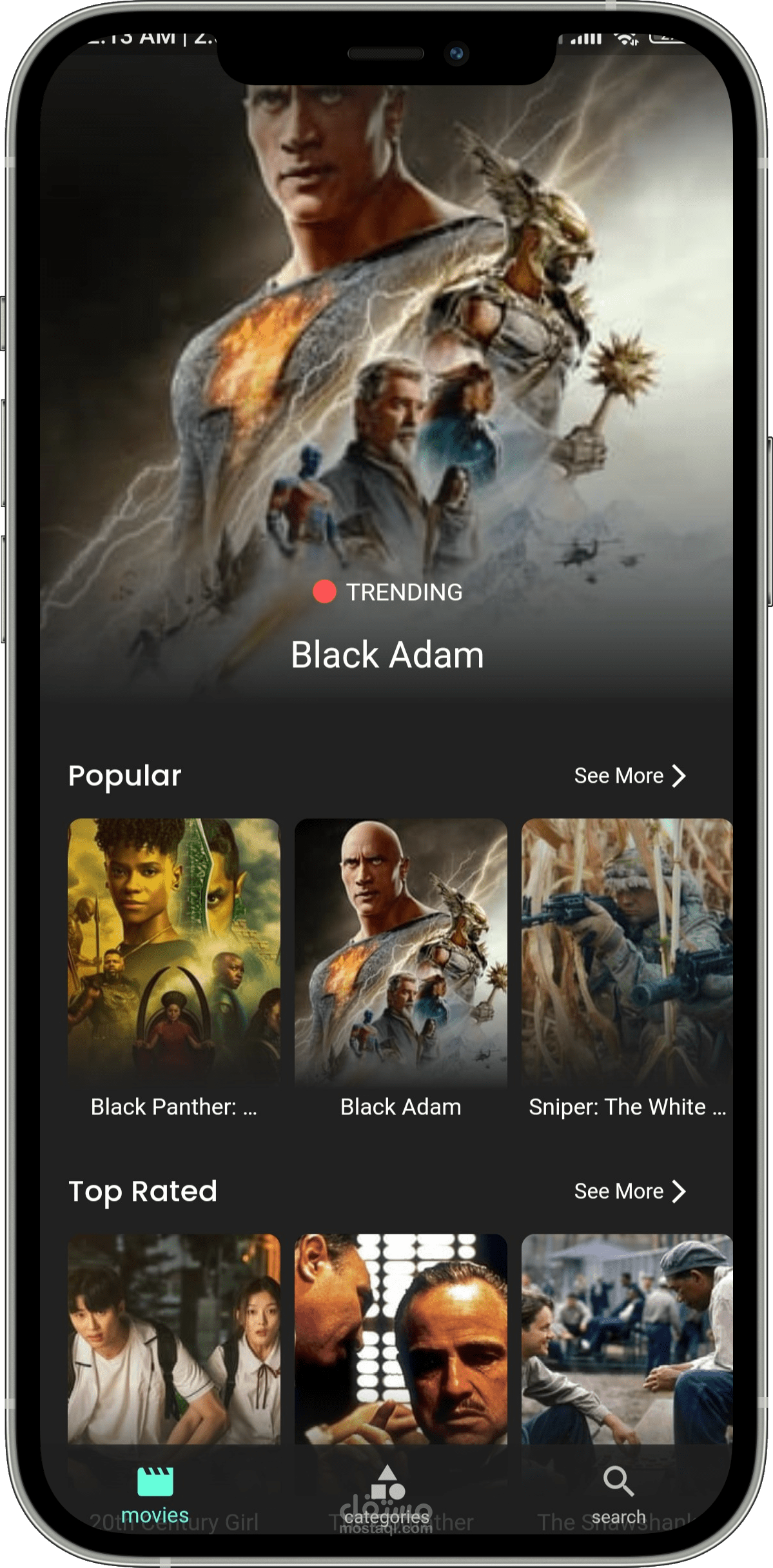 تطبيق لعرض جميع الافلام و التقييمات الحاصل عليها و اشرح الاحداث التي يدور حولها ، ففي الصفحة الرئيسية يوجد في المقدمة احدث الافلام (تريند) و ايضا يوجد اكثر الافلام شهرة و ايضا اكثر الافلام الحاصلة علي تقييمات.