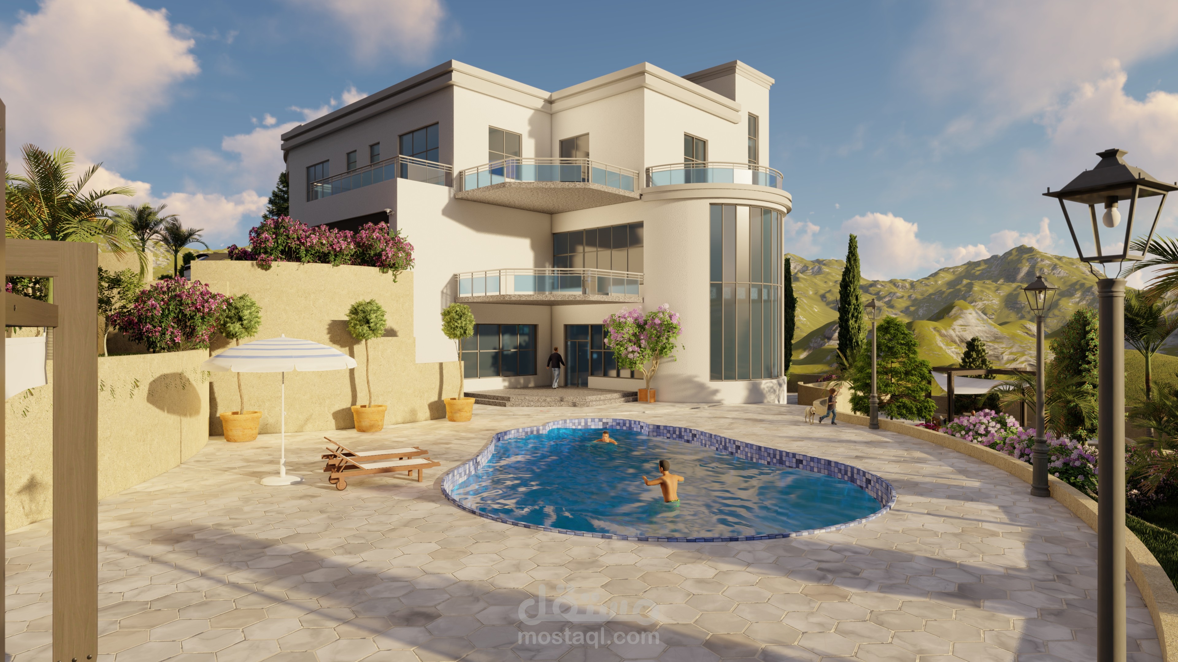 تصميم فيلا , بكافة تفاصيلها واظهارها بالصورة النهائية للعمل والتنفيذ