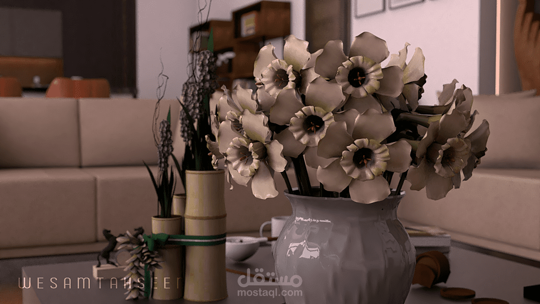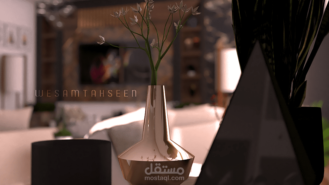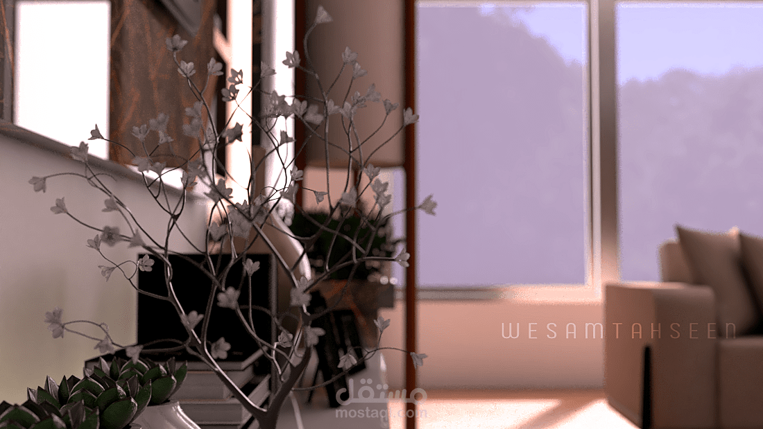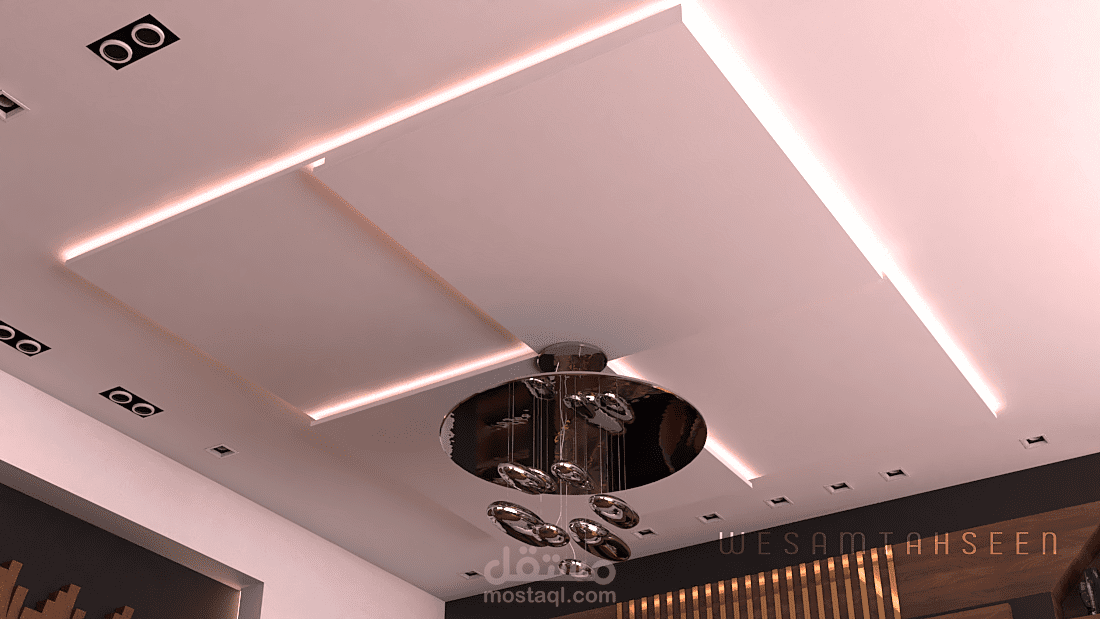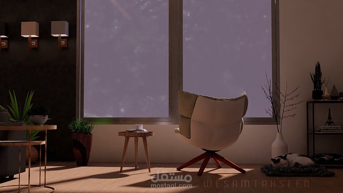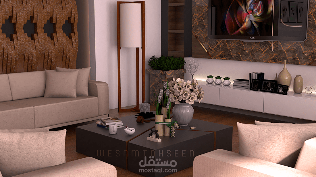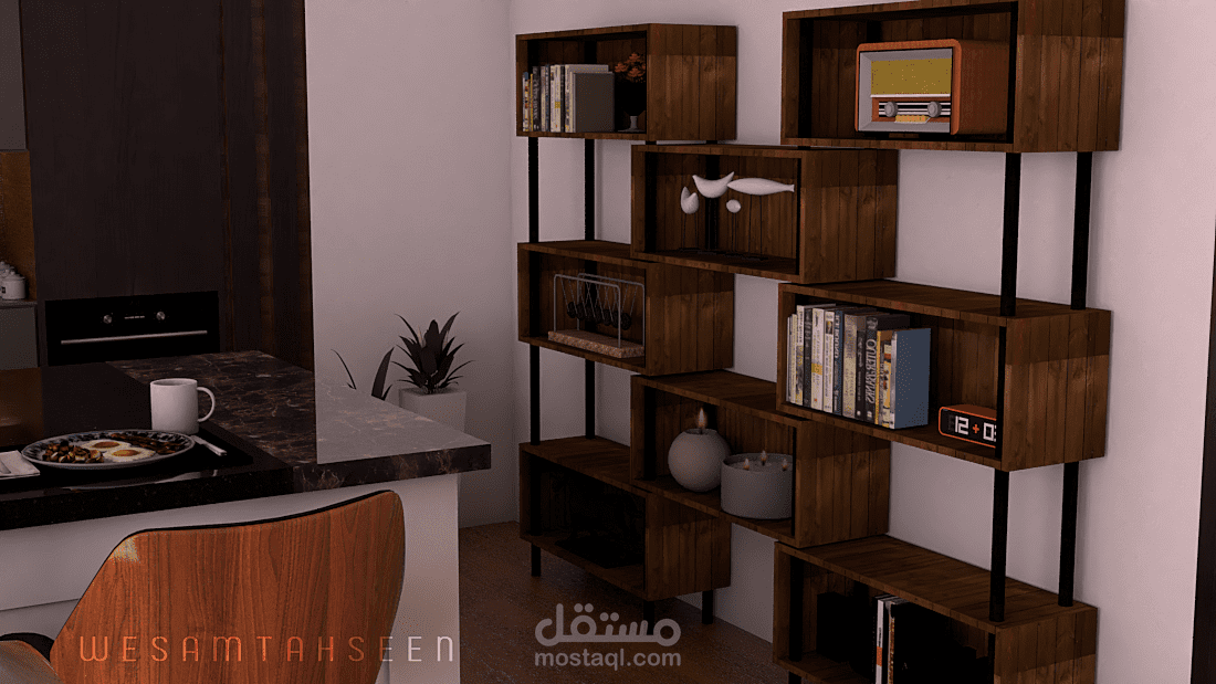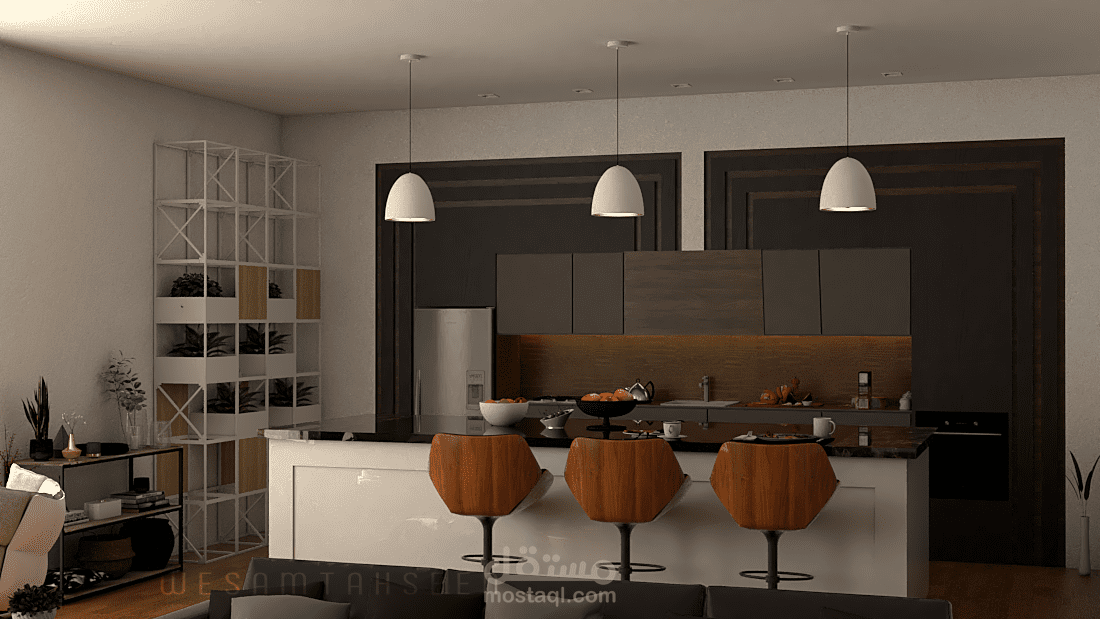 مقترح تصميم غرفة معيشة ومطبخ بطراز حديث وعصري يراعي راحة المستخدم البصرية والوظيفية