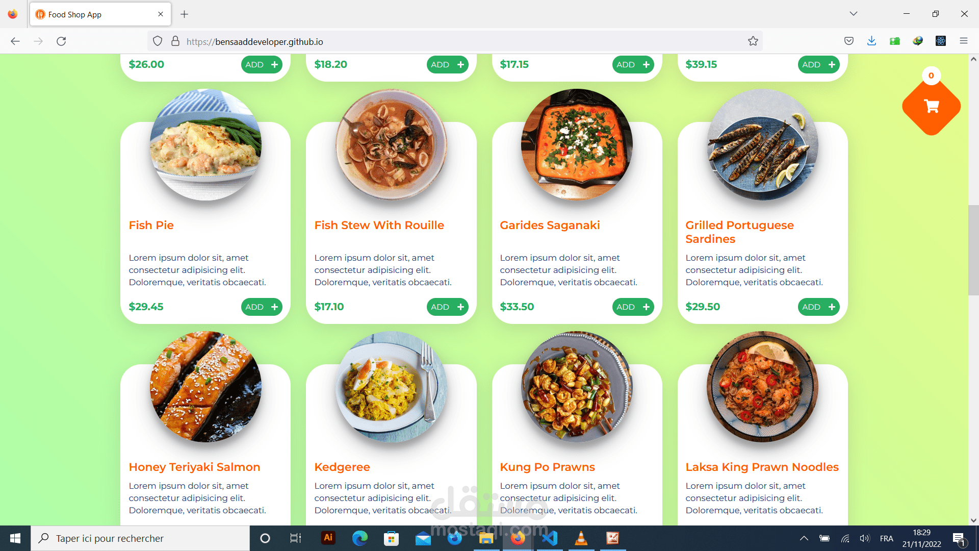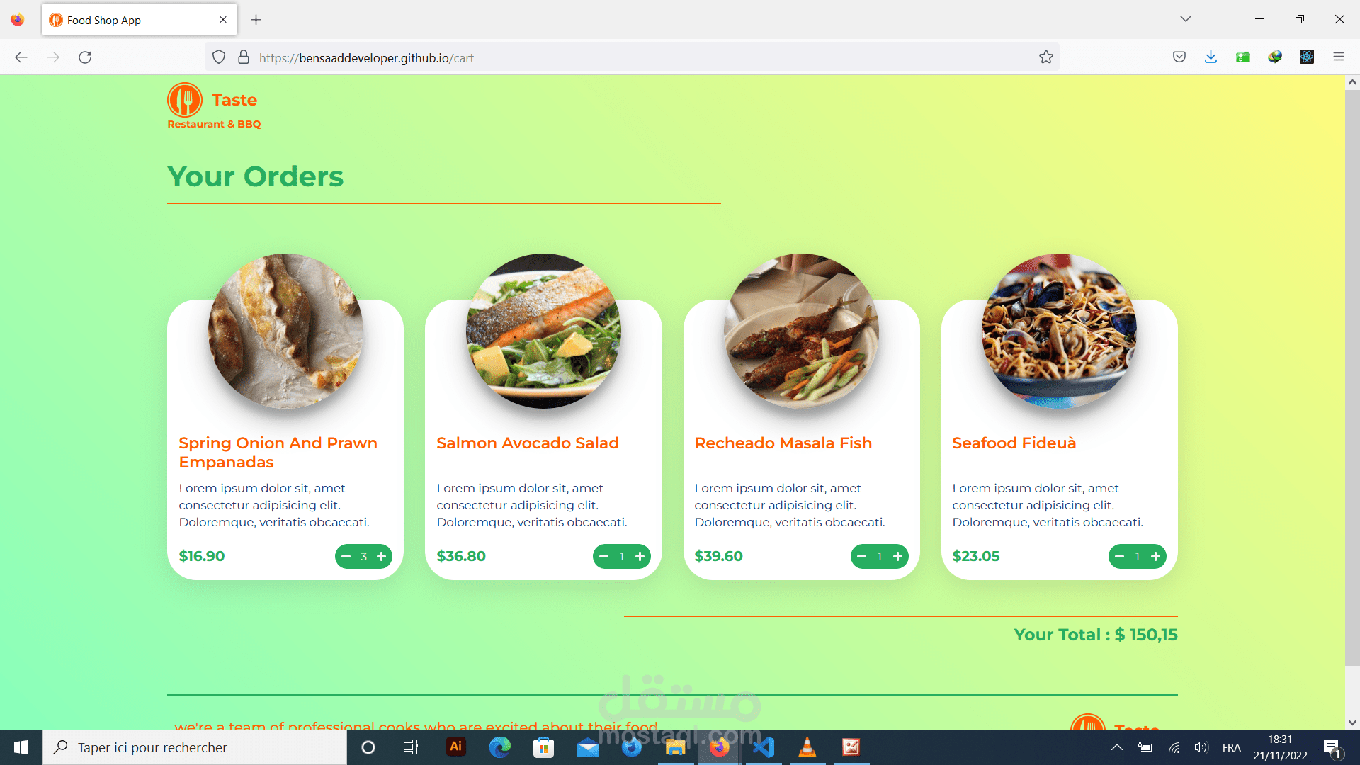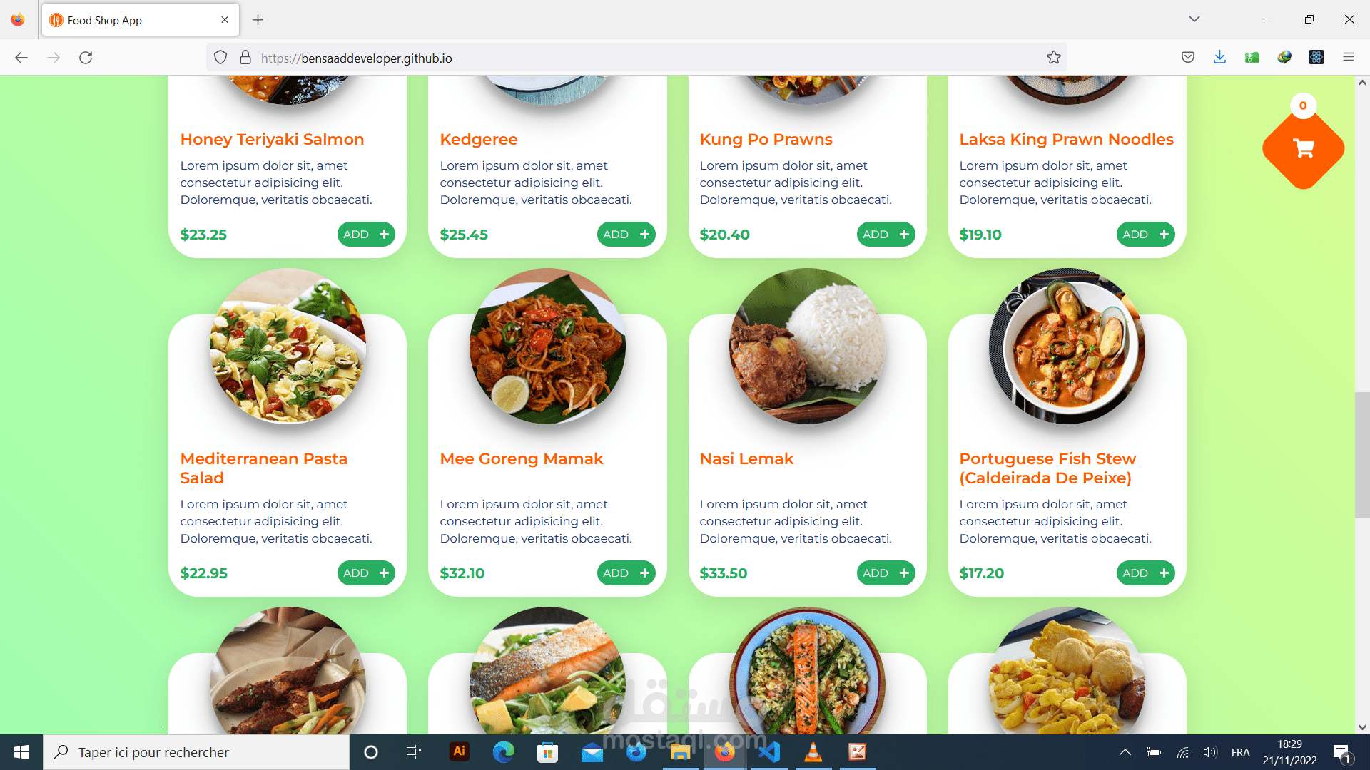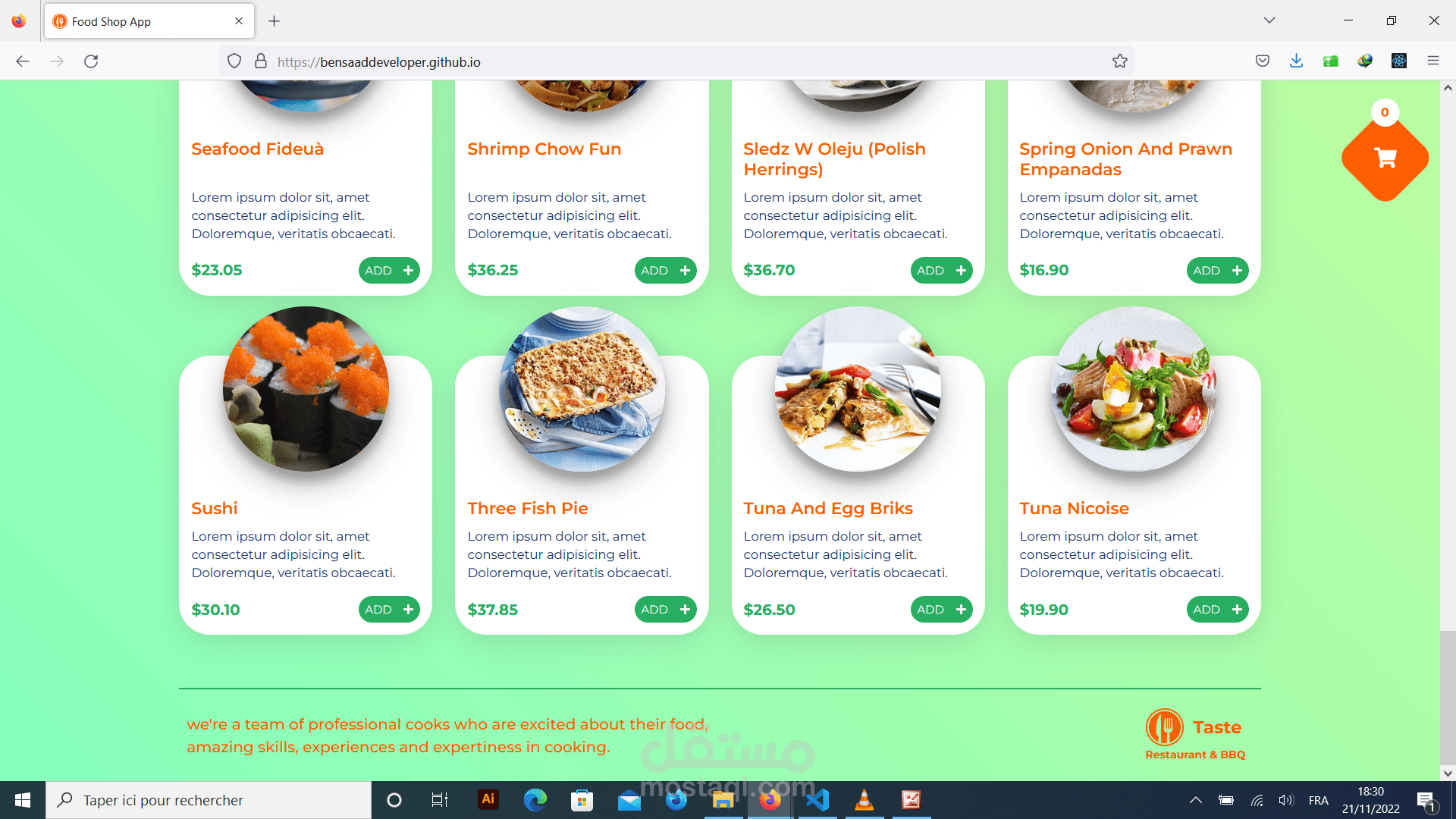 عبارة عن تطبيق لموقع طلبات اكل عبر النت، يقدم قائمة للاطعمة المتوفرة لكل مطعم، و يمكن الزبون من اختيار الأكل المناسب حسب الاسعار المتوفرة،