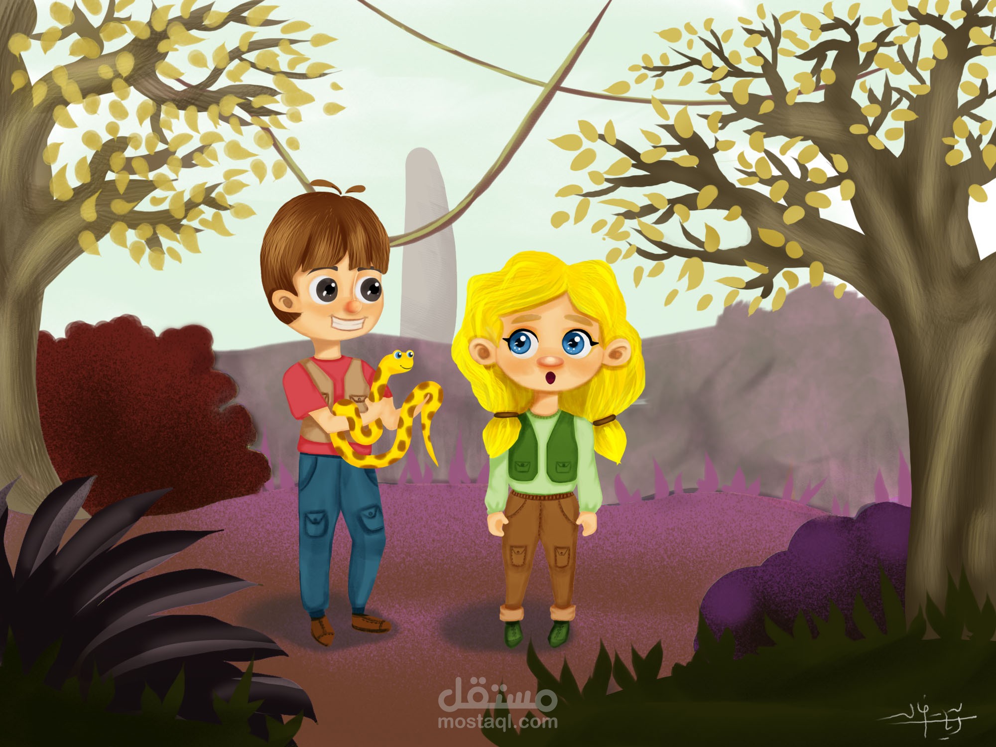 قمت برسم هاتين الشخصيتين بأسلوبي وأحببت ان استخدمهما في رسم مشهد في الادغال بحيث يكون مثالا لمشهد في كتاب اطفال