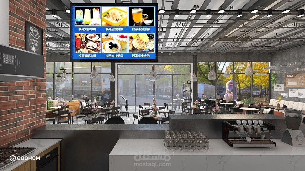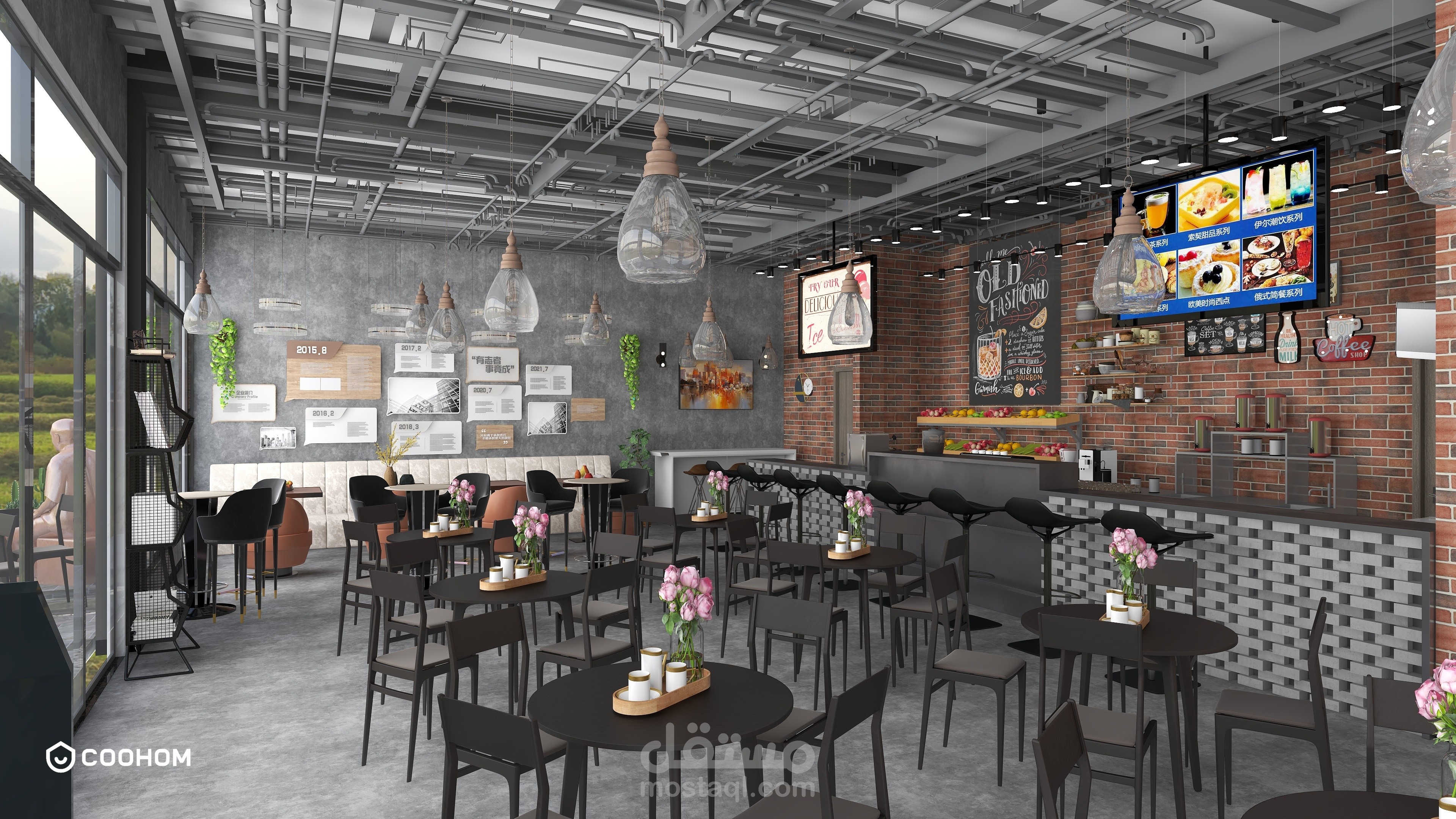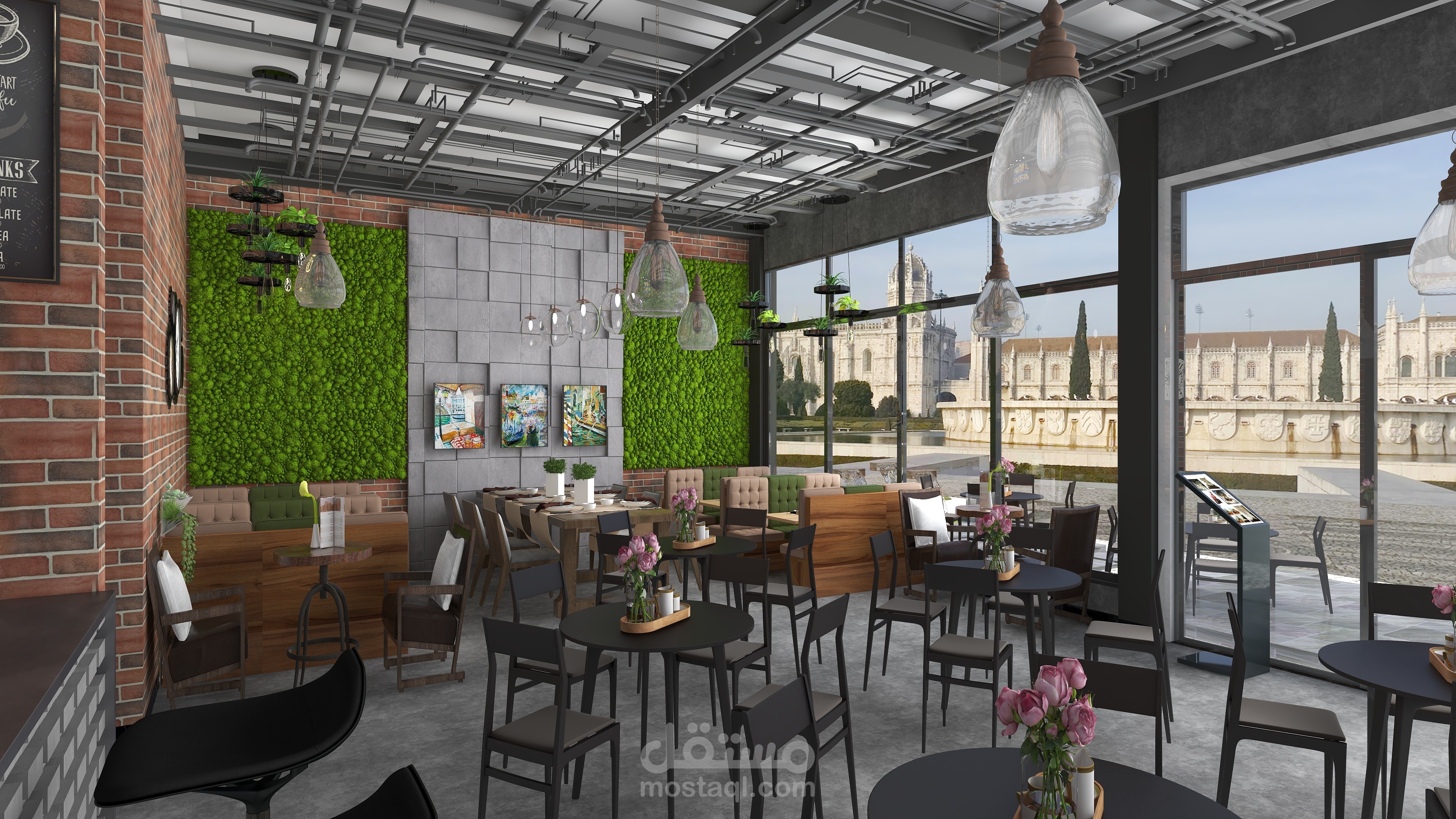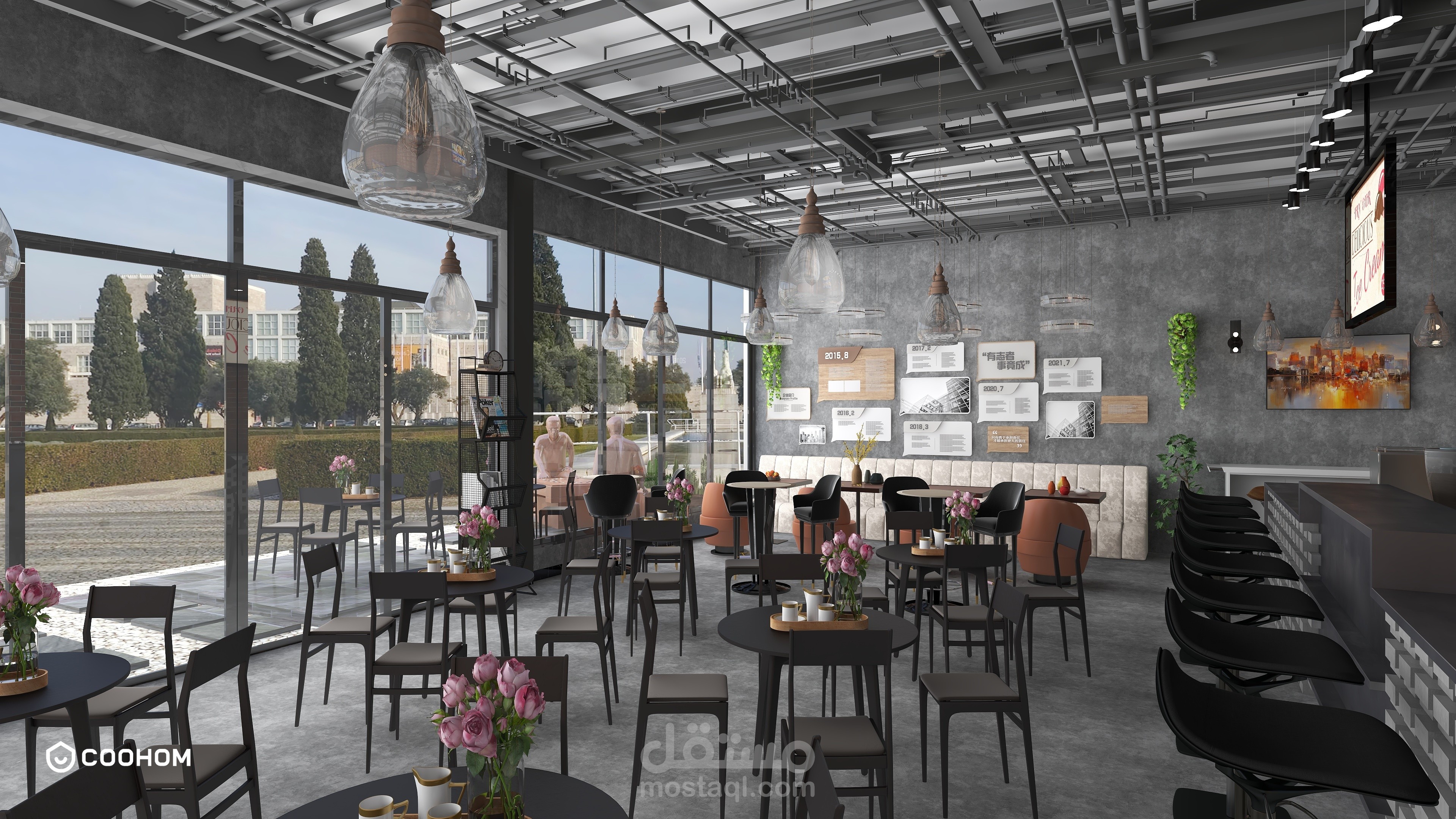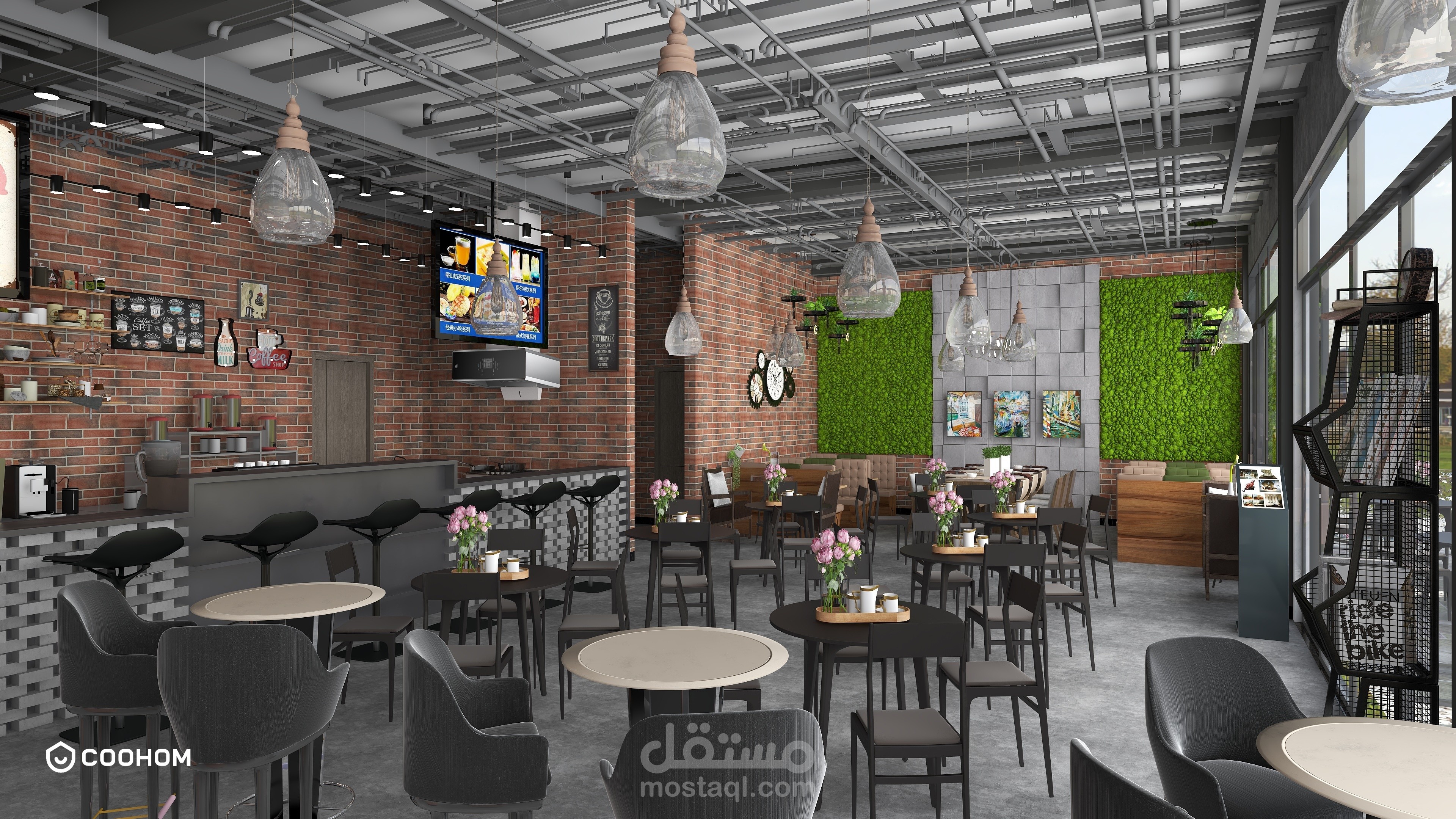 التصميم الداخلي :صممت الكافتيريا علي الطراز الصناعي وذلك لتقليل التكلفة حيث تتميز بالبساطة في استخدام الخامات والالوان ، وتتكون من فراغ الكافيتريا الذي يتضمن كاونتر الخدمة وفي الخلفية يوجد المخزن وغرفة ملابس العاملين ، ويوجد غرفة للادارة والحمامات.
